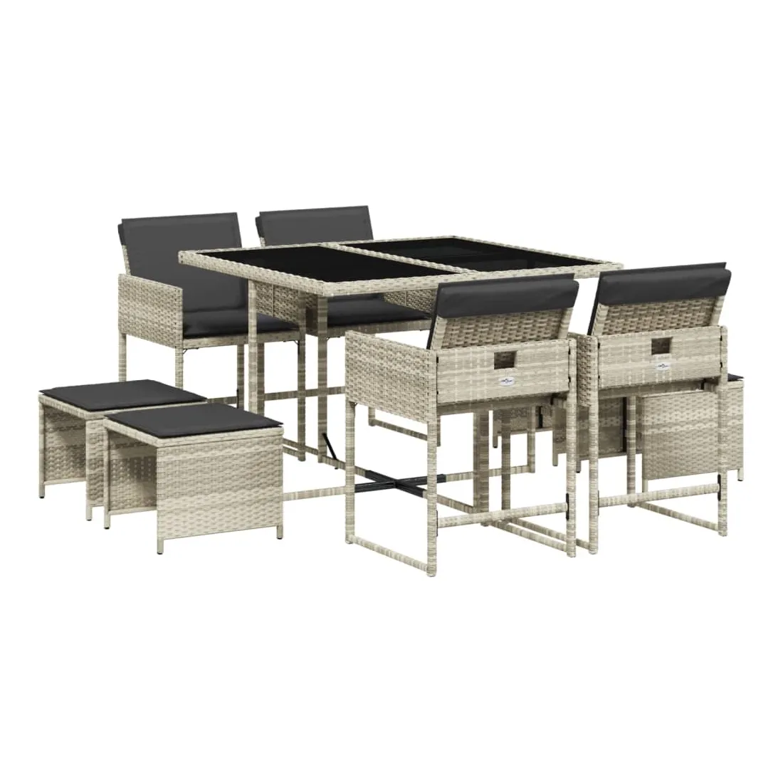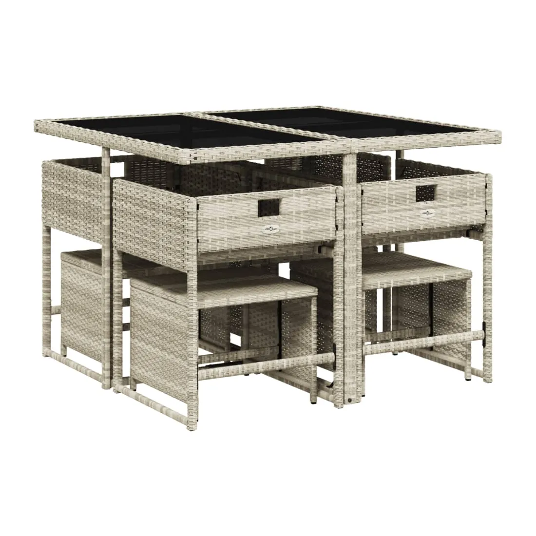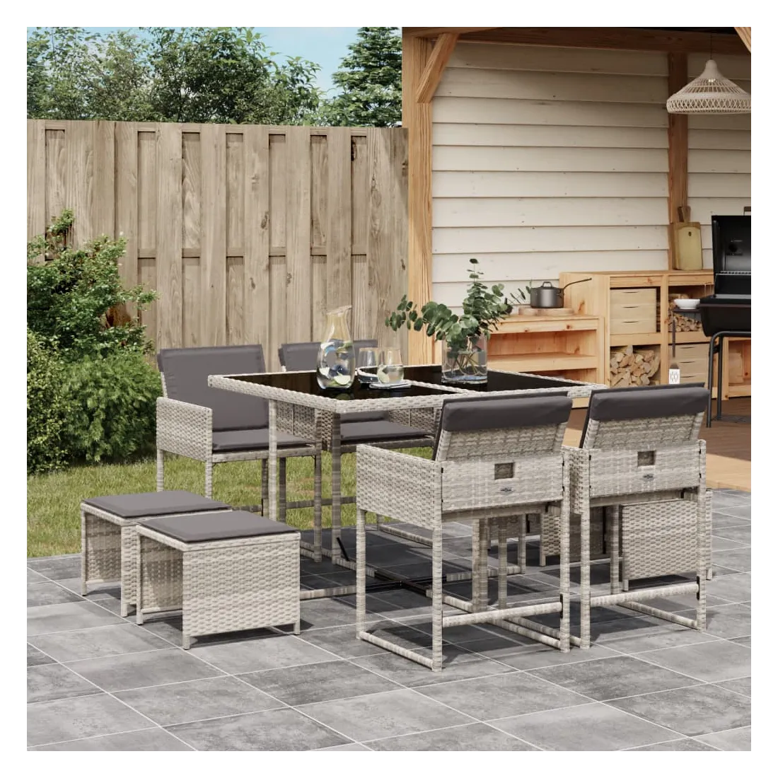 Cet ensemble de salle à manger de jardin est un excellent choix pour les repas en plein air ou pour vous détendre dans le jardin, dans l'arrière-cour ou sur la terrasse. Matériau durable : la résine tressée, également connue sous le nom de poly rotin, est un matériau synthétique solide et nécessitant peu d'entretien qui ressemble au rotin naturel. Il est léger, facile à nettoyer et couramment utilisé pour les meubles d'extérieur en raison de sa durabilité et de ses propriétés de résistance aux intempéries.Rangement compact : ces chaises sont dotées d'un dossier rabattable, ce qui permet de les ranger facilement sous la table. Une fois pliées, elles se rangent parfaitement sous la table, formant un cube peu encombrant. De plus, les tabourets peuvent également être rangés sous les chaises, maximisant encore davantage l'efficacité de l'espace.Expérience d'assise confortable : ce mobilier d'extérieur, doté de coussins épais, offre une expérience d'assise confortable.Housse amovible et lavable : ces coussins de siège sont dotés de housses amovibles pour un lavage et un entretien faciles. Les housses de coussin ont un rabat à l'arrière pour une fixation facile aux dossiers.Dessus en verre : le dessus de la table d'extérieur est fabriqué en verre trempé solide et durable, ce qui le rend facile à nettoyer avec un chiffon humide et ajoute une touche d'élégance à votre espace extérieur. Bon à savoir : Pour que vos meubles d'extérieur restent beaux, nous vous recommandons de les protéger avec une housse imperméable.