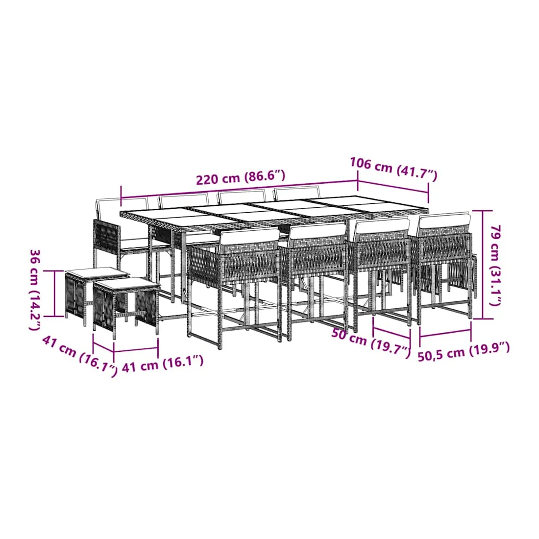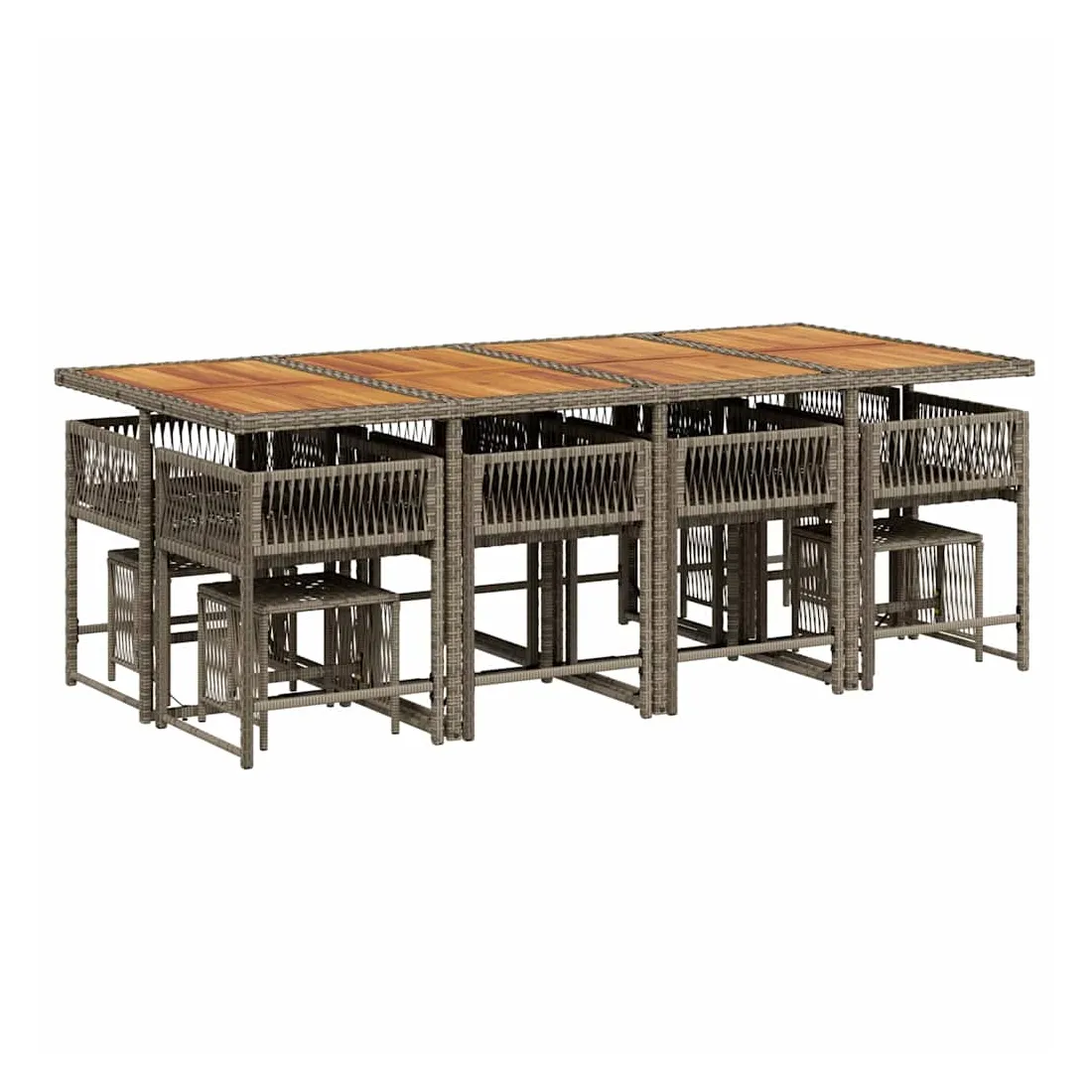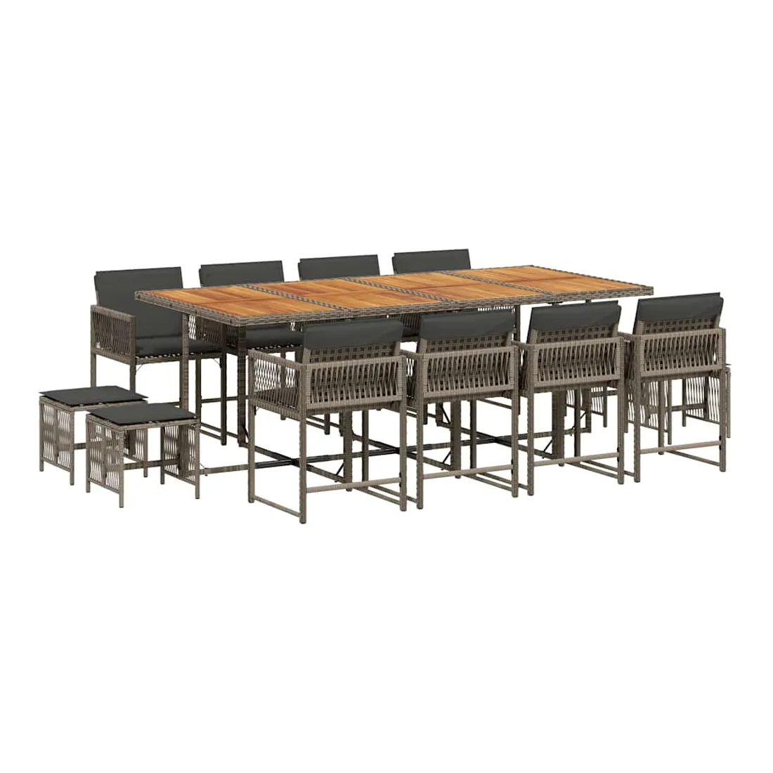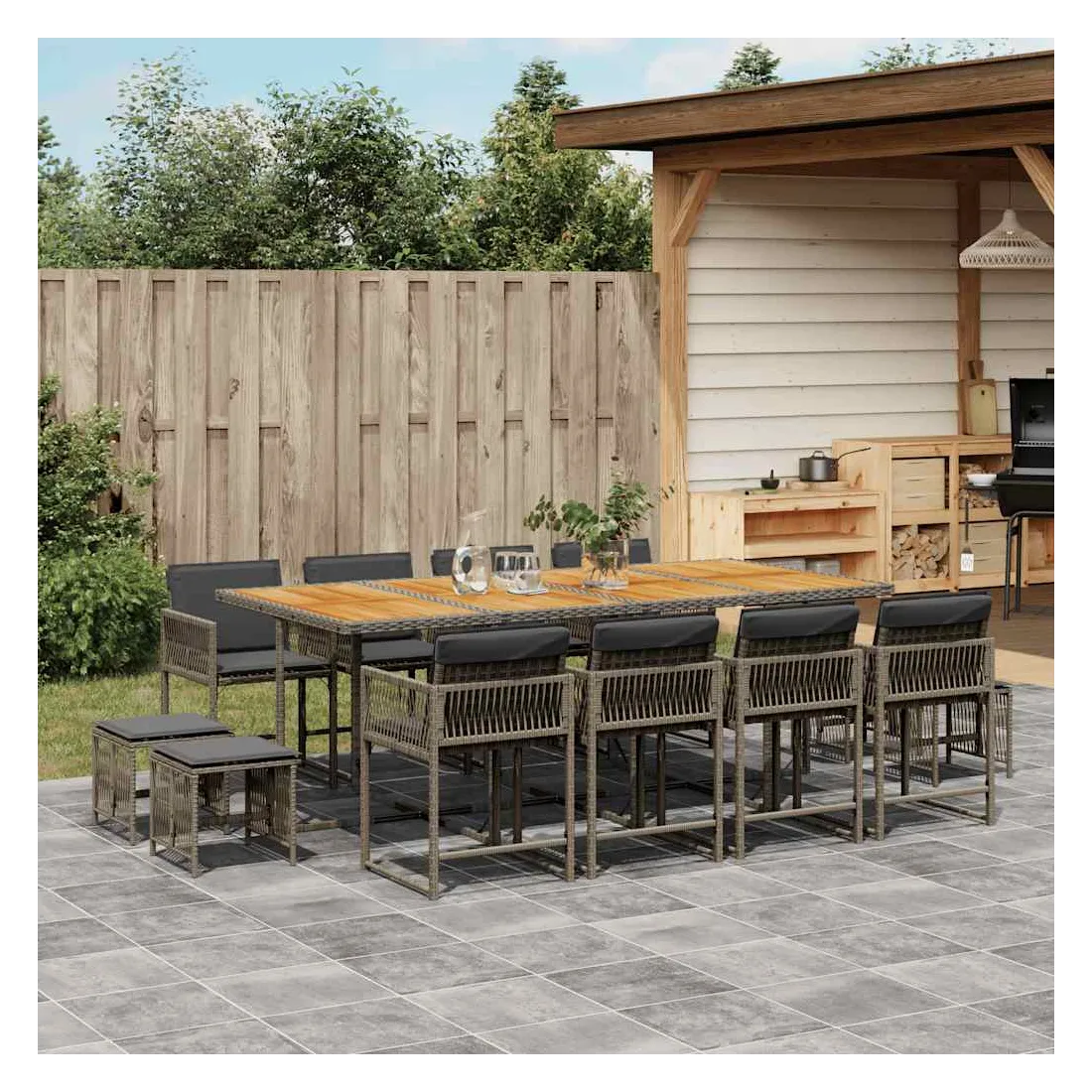 Cet ensemble de salle à manger de jardin est un excellent choix pour les repas en plein air ou pour vous détendre dans le jardin, dans l'arrière-cour ou sur la terrasse. Matériau durable : la résine tressée, également connue sous le nom de poly rotin, est un matériau synthétique solide et nécessitant peu d'entretien qui ressemble au rotin naturel. Il est léger, facile à nettoyer et couramment utilisé pour les meubles d'extérieur en raison de sa durabilité et de ses propriétés de résistance aux intempéries.Rangement compact : ces chaises sont dotées d'un dossier rabattable, ce qui permet de les ranger facilement sous la table. Une fois pliées, elles se rangent parfaitement sous la table, formant un cube peu encombrant. De plus, les tabourets peuvent également être rangés sous les chaises, maximisant encore davantage l'efficacité de l'espace.Expérience d'assise confortable : ce mobilier d'extérieur, doté de coussins épais, offre une expérience d'assise confortable.Housse amovible et lavable : ces coussins de siège sont dotés de housses amovibles pour un lavage et un entretien faciles. Les housses de coussin ont un rabat à l'arrière pour une fixation facile aux dossiers.Dessus stable et facile à nettoyer : cette table de jardin a un dessus en bois d'acacia robuste, durable et facile à nettoyer avec un chiffon humide. Bon à savoir :Pour que vos meubles d'extérieur restent beaux, nous vous recommandons de les protéger avec une housse imperméable.