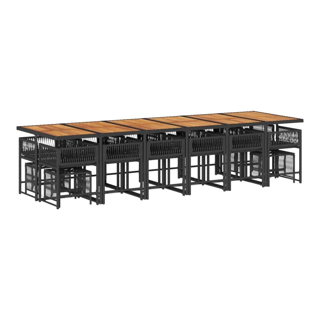 vidaXLCet ensemble de salle à manger de jardin est un excellent choix pour les repas en plein air ou pour vous détendre dans le jardin, dans l'arrière-cour ou sur la terrasse. Matériau durable : la résine tressée, également connue sous le nom de poly rotin, est un matériau synthétique solide et nécessitant peu d'entretien qui ressemble au rotin naturel. Il est léger, facile à nettoyer et couramment utilisé pour les meubles d'extérieur en raison de sa durabilité et de ses propriétés de résistance aux intempéries.Rangement compact : ces chaises sont dotées d'un dossier rabattable, ce qui permet de les ranger facilement sous la table. Une fois pliées, elles se rangent parfaitement sous la table, formant un cube peu encombrant. De plus, les tabourets peuvent également être rangés sous les chaises, maximisant encore davantage l'efficacité de l'espace.Expérience d'assise confortable : ce mobilier d'extérieur, doté de coussins épais, offre une expérience d'assise confortable.Housse amovible et lavable : ces coussins de siège sont dotés de housses amovibles pour un lavage et un entretien faciles. Les housses de coussin ont un rabat à l'arrière pour une fixation facile aux dossiers.Dessus stable et facile à nettoyer : cette table de jardin a un dessus en bois d'acacia robuste, durable et facile à nettoyer avec un chiffon humide. Bon à savoir :Pour que vos meubles d'extérieur restent beaux, nous vous recommandons de les protéger avec une housse imperméable.