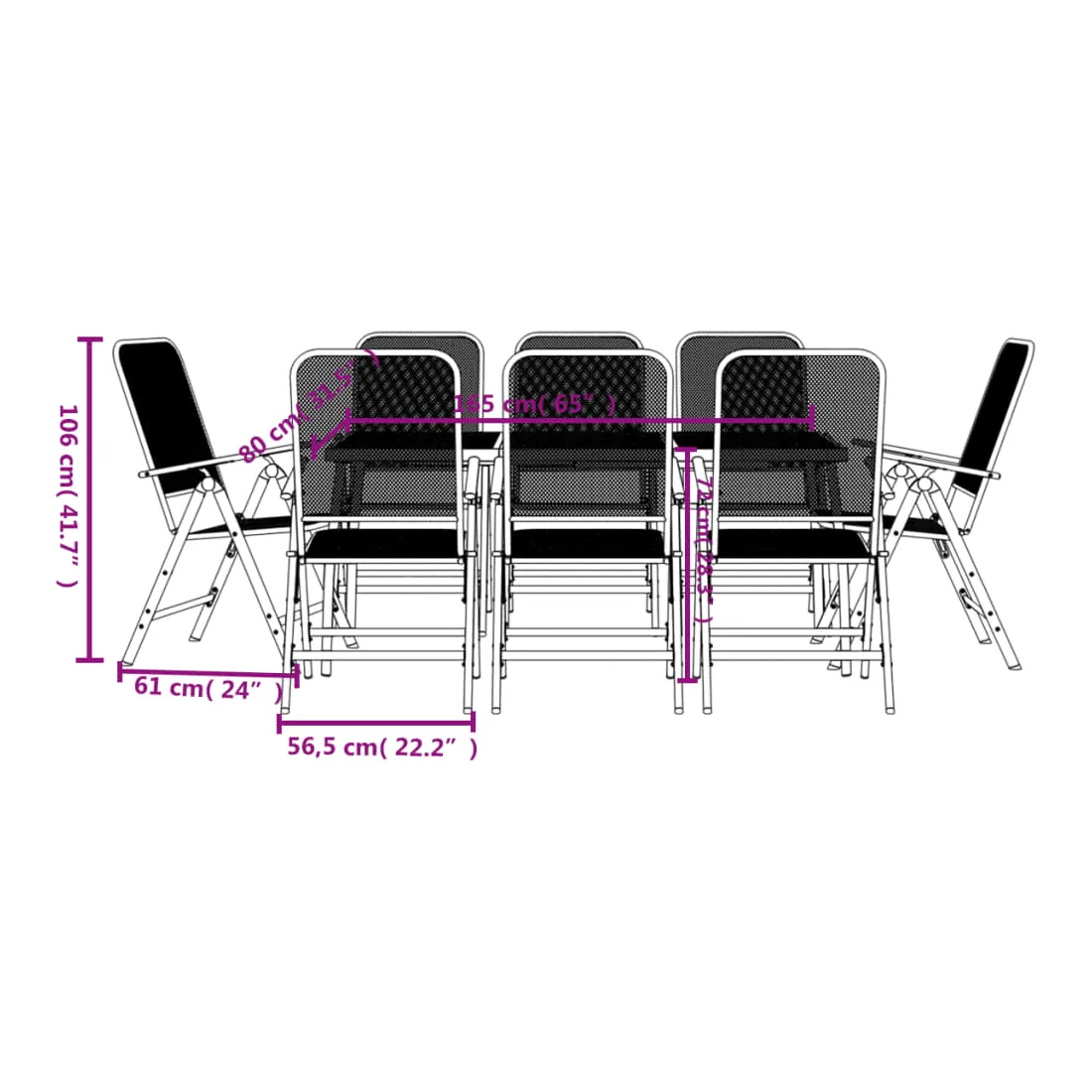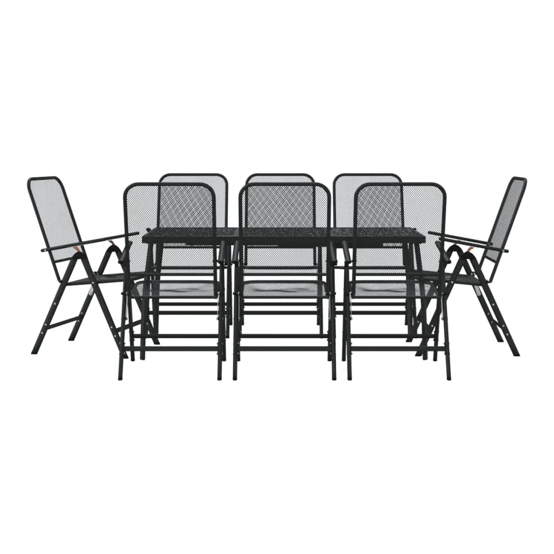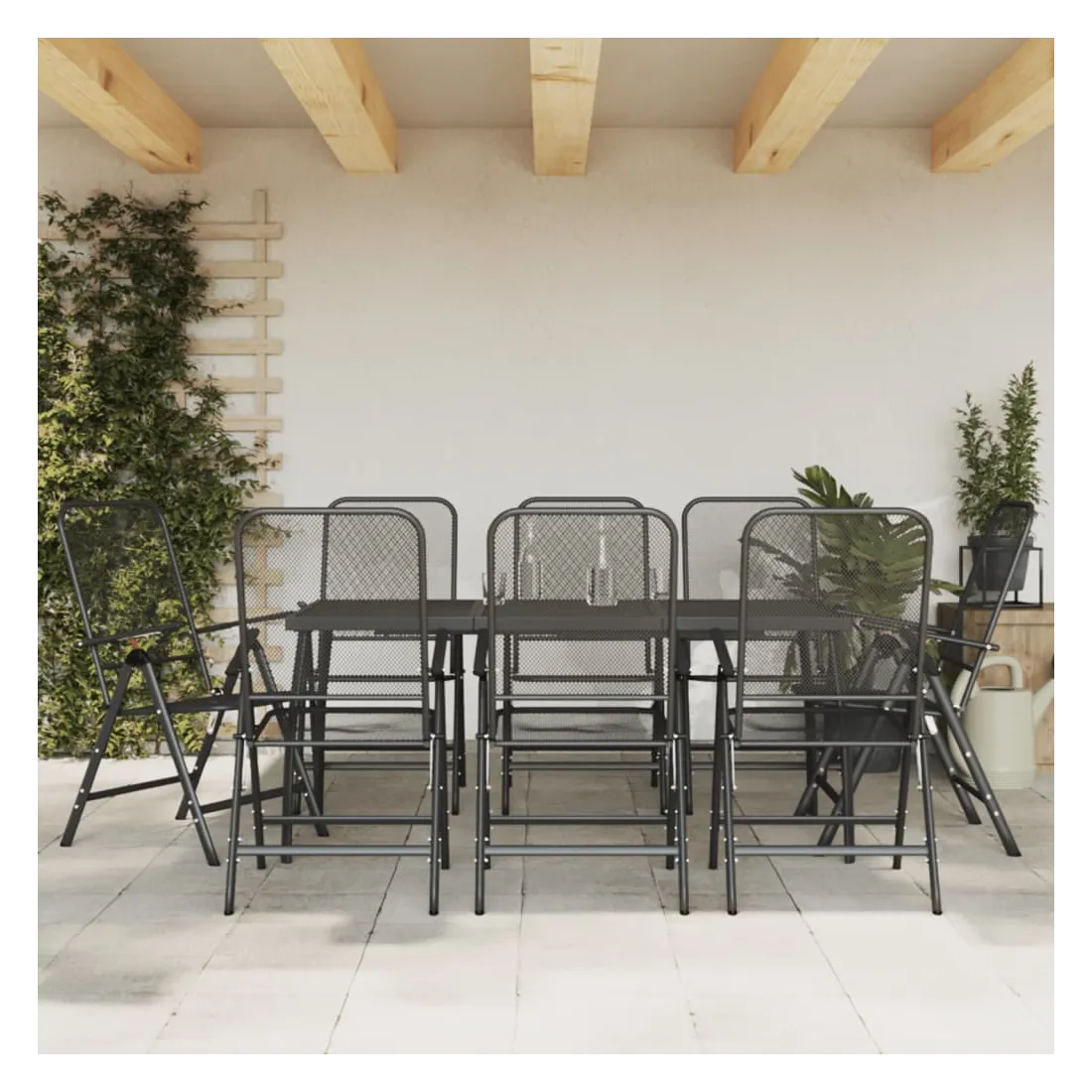 Profitez d'un bon repas ou d'un thé l'après-midi dans votre espace extérieur avec cet ensemble de salle à manger de jardin ! Ayant un design élégant, il deviendra le point central de votre jardin et de votre terrasse ! Cadre robuste : le cadre en métal rend cet ensemble de meubles de jardin robuste et durable, offrant un service à vie.Conception en maille : cet ensemble de salle à manger, avec son design en maille, peut efficacement éviter l'accumulation d'eau, ajoutant une apparence élégante à votre espace de vie extérieur.Dessus de table pratique : le dessus robuste de la table de jardin est parfait pour placer les repas, les boissons et d'autres objets décoratifs.Facile à déplacer : ces chaises à manger de jardin sont pliables pour gagner de la place lorsqu'elles ne sont pas utilisées. Vous pouvez facilement les transporter avec vous lors de vos sorties en plein air.Dossier réglable : ces chaises inclinables ont des dossiers qui s'inclinent dans 7 réglages, de sorte que vous puissiez toujours trouver la position la plus confortable. Bon à savoir :Pour que vos meubles d'extérieur restent beaux, nous vous recommandons de les protéger avec une housse imperméable.