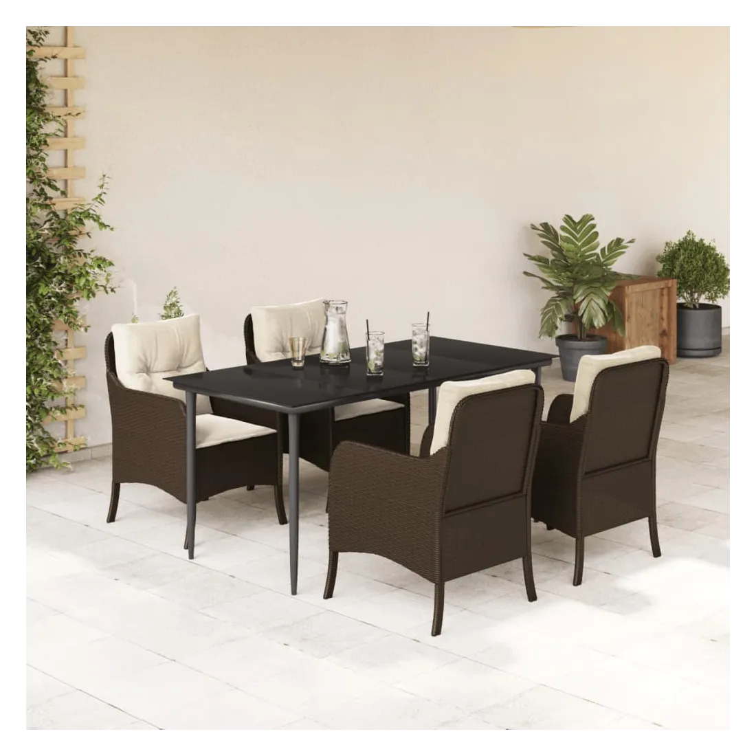 Cet ensemble de salle à manger de jardin est un excellent choix pour les repas en plein air ou pour vous détendre dans le jardin, l'arrière-cour ou le patio. Matériau durable : la résine tressée, également connue sous le nom de poly rotin, est un matériau synthétique solide et nécessitant peu d'entretien qui ressemble au rotin naturel. Il est léger, facile à nettoyer et couramment utilisé pour les meubles d'extérieur en raison de sa durabilité et de ses propriétés de résistance aux intempéries.Expérience d'assise confortable : ce mobilier d'extérieur, doté de coussins épais, offre une expérience d'assise confortable.Housse amovible et lavable : ces coussins de siège sont dotés de housses amovibles pour un lavage et un entretien faciles.Dessus en verre : le dessus de la table d'extérieur est fabriqué en verre trempé solide et durable, ce qui le rend facile à nettoyer avec un chiffon humide et ajoute une touche d'élégance à votre espace extérieur.Cadre robuste et stable : le cadre en acier enduit de poudre assure la solidité et la stabilité du meuble de jardin pour une utilisation quotidienne à l'extérieur. Bon à savoir :Pour que vos meubles d'extérieur restent beaux, nous vous recommandons de les protéger avec une housse imperméable.