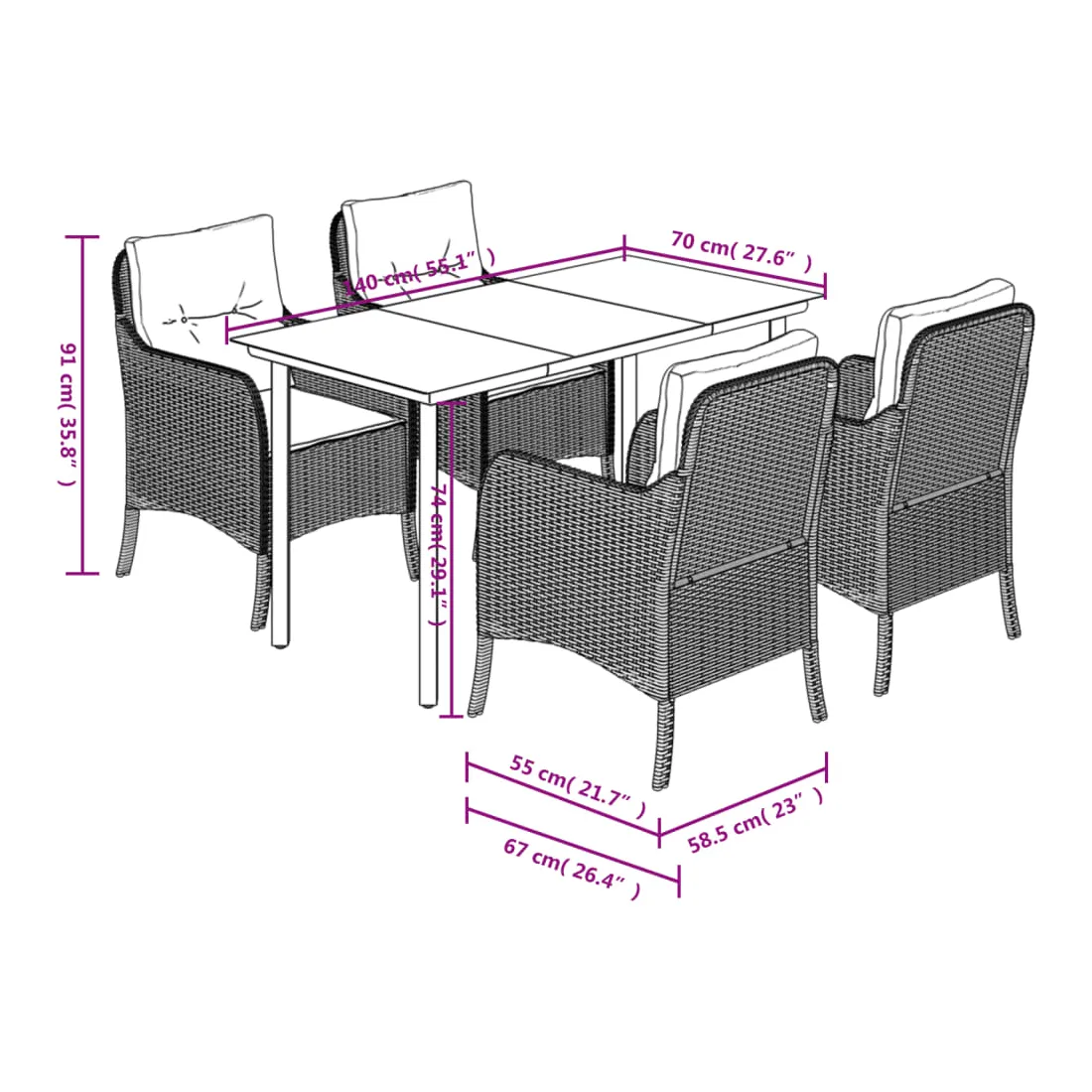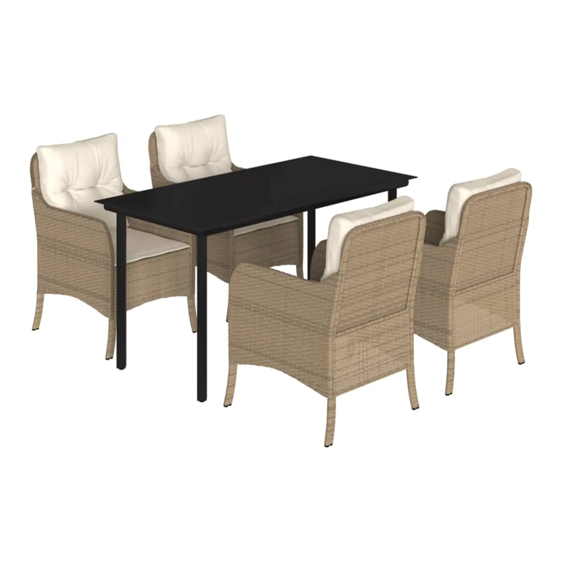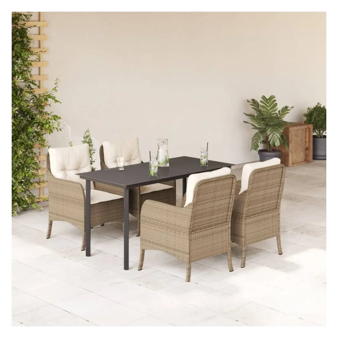 Cet ensemble de salle à manger de jardin est un excellent choix pour les repas en plein air ou pour vous détendre dans le jardin, l'arrière-cour ou le patio. Matériau durable : la résine tressée, également connue sous le nom de poly rotin, est un matériau synthétique solide et nécessitant peu d'entretien qui ressemble au rotin naturel. Il est léger, facile à nettoyer et couramment utilisé pour les meubles d'extérieur en raison de sa durabilité et de ses propriétés de résistance aux intempéries.Expérience d'assise confortable : ce mobilier d'extérieur, doté de coussins épais, offre une expérience d'assise confortable.Housse amovible et lavable : ces coussins de siège sont dotés de housses amovibles pour un lavage et un entretien faciles.Dessus en verre : le dessus de la table d'extérieur est fabriqué en verre trempé solide et durable, ce qui le rend facile à nettoyer avec un chiffon humide et ajoute une touche d'élégance à votre espace extérieur.Cadre robuste et stable : le cadre en acier enduit de poudre assure la solidité et la stabilité du meuble de jardin pour une utilisation quotidienne à l'extérieur. Bon à savoir :Pour que vos meubles d'extérieur restent beaux, nous vous recommandons de les protéger avec une housse imperméable.