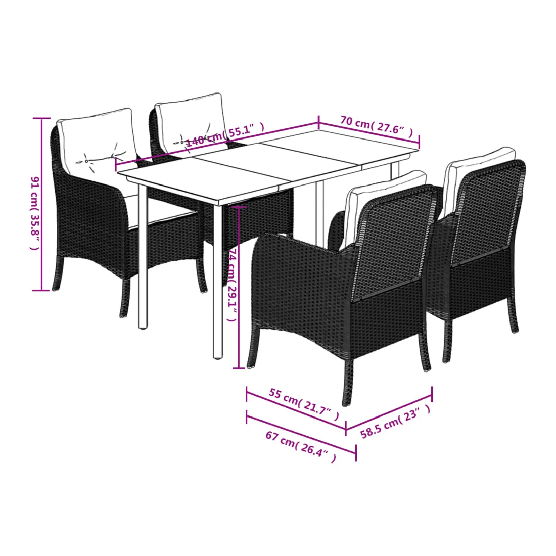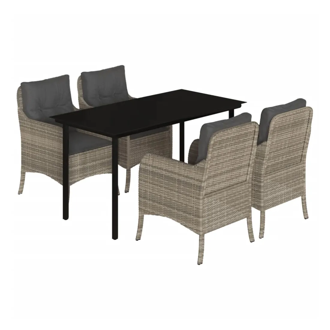 Cet ensemble de salle à manger de jardin est un excellent choix pour les repas en plein air ou pour vous détendre dans le jardin, l'arrière-cour ou le patio. Matériau durable : la résine tressée, également connue sous le nom de poly rotin, est un matériau synthétique solide et nécessitant peu d'entretien qui ressemble au rotin naturel. Il est léger, facile à nettoyer et couramment utilisé pour les meubles d'extérieur en raison de sa durabilité et de ses propriétés de résistance aux intempéries.Expérience d'assise confortable : ce mobilier d'extérieur, doté de coussins épais, offre une expérience d'assise confortable.Housse amovible et lavable : ces coussins de siège sont dotés de housses amovibles pour un lavage et un entretien faciles.Dessus en verre : le dessus de la table d'extérieur est fabriqué en verre trempé solide et durable, ce qui le rend facile à nettoyer avec un chiffon humide et ajoute une touche d'élégance à votre espace extérieur.Cadre robuste et stable : le cadre en acier enduit de poudre assure la solidité et la stabilité du meuble de jardin pour une utilisation quotidienne à l'extérieur. Bon à savoir :Pour que vos meubles d'extérieur restent beaux, nous vous recommandons de les protéger avec une housse imperméable.