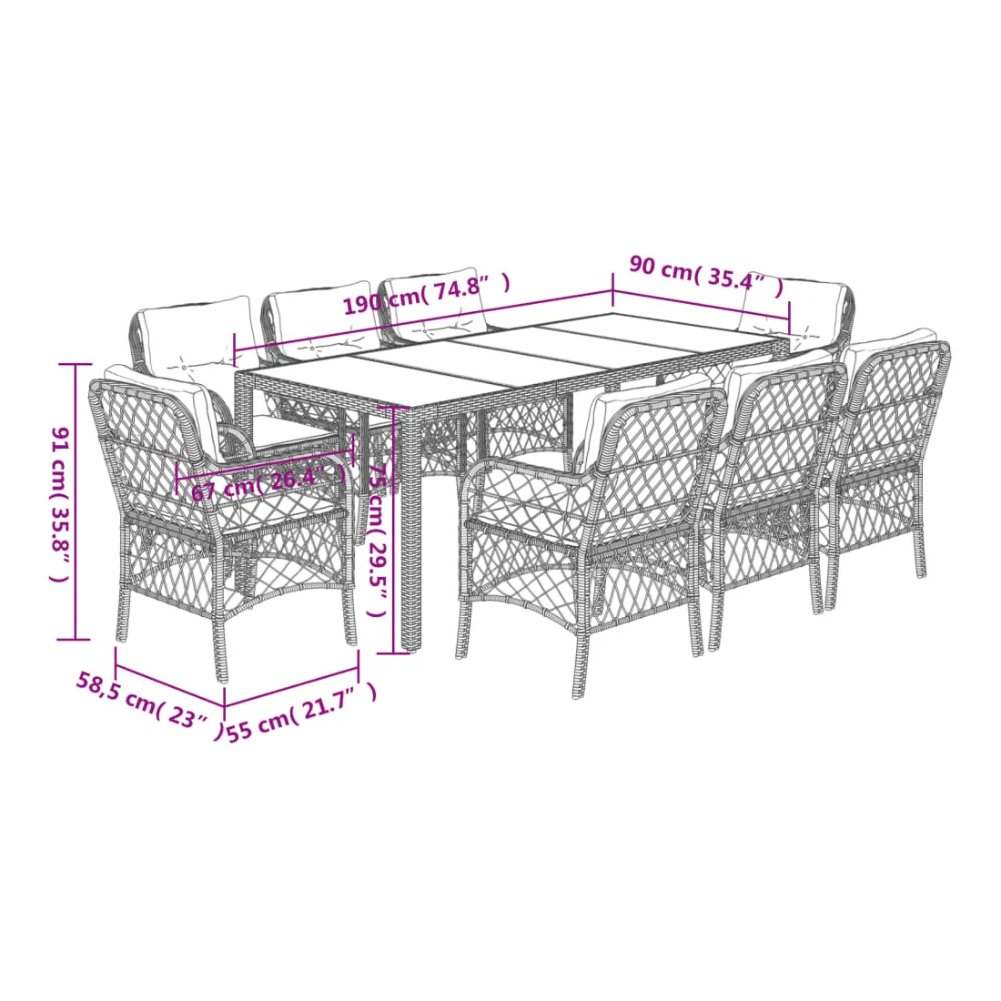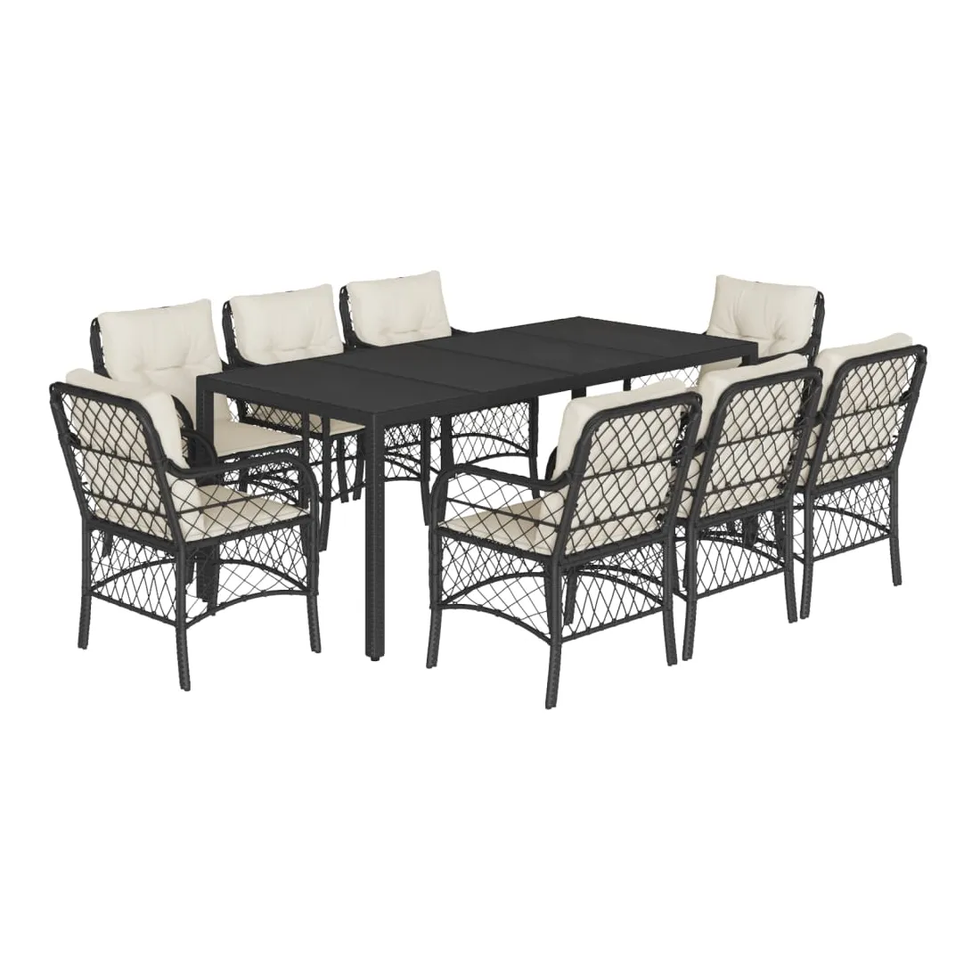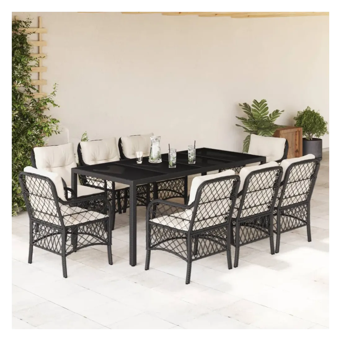 Cet ensemble de salle à manger de jardin est un excellent choix pour les repas en plein air ou pour vous détendre dans le jardin, l'arrière-cour ou le patio. Matériau durable : la résine tressée, également connue sous le nom de poly rotin, est un matériau synthétique solide et nécessitant peu d'entretien qui ressemble au rotin naturel. Il est léger, facile à nettoyer et couramment utilisé pour les meubles d'extérieur en raison de sa durabilité et de ses propriétés de résistance aux intempéries.Expérience d'assise confortable : ce mobilier d'extérieur, doté de coussins épais, offre une expérience d'assise confortable.Housse amovible et lavable : ces coussins de siège sont dotés de housses amovibles pour un lavage et un entretien faciles.Dessus en verre : le dessus de la table d'extérieur est fabriqué en verre trempé solide et durable, ce qui le rend facile à nettoyer avec un chiffon humide et ajoute une touche d'élégance à votre espace extérieur.Cadre robuste et stable : le cadre en acier enduit de poudre assure la solidité et la stabilité du meuble de jardin pour une utilisation quotidienne à l'extérieur. Bon à savoir :Pour que vos meubles d'extérieur restent beaux, nous vous recommandons de les protéger avec une housse imperméable.