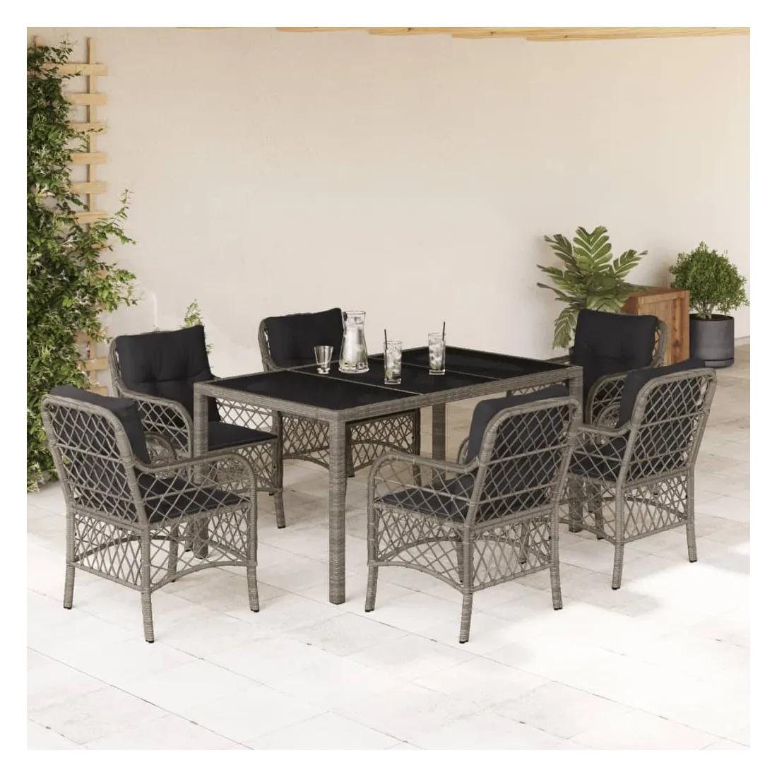 Cet ensemble de salle à manger de jardin est un excellent choix pour les repas en plein air ou pour vous détendre dans le jardin, l'arrière-cour ou le patio. Matériau durable : la résine tressée, également connue sous le nom de poly rotin, est un matériau synthétique solide et nécessitant peu d'entretien qui ressemble au rotin naturel. Il est léger, facile à nettoyer et couramment utilisé pour les meubles d'extérieur en raison de sa durabilité et de ses propriétés de résistance aux intempéries.Expérience d'assise confortable : ce mobilier d'extérieur, doté de coussins épais, offre une expérience d'assise confortable.Housse amovible et lavable : ces coussins de siège sont dotés de housses amovibles pour un lavage et un entretien faciles.Dessus en verre : le dessus de la table d'extérieur est fabriqué en verre trempé solide et durable, ce qui le rend facile à nettoyer avec un chiffon humide et ajoute une touche d'élégance à votre espace extérieur.Cadre robuste et stable : le cadre en acier enduit de poudre assure la solidité et la stabilité du meuble de jardin pour une utilisation quotidienne à l'extérieur. Bon à savoir :Pour que vos meubles d'extérieur restent beaux, nous vous recommandons de les protéger avec une housse imperméable.