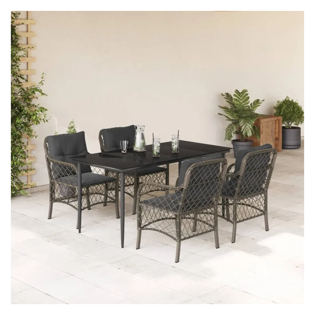 Cet ensemble de salle à manger de jardin est un excellent choix pour les repas en plein air ou pour vous détendre dans le jardin, l'arrière-cour ou le patio. Matériau durable : la résine tressée, également connue sous le nom de poly rotin, est un matériau synthétique solide et nécessitant peu d'entretien qui ressemble au rotin naturel. Il est léger, facile à nettoyer et couramment utilisé pour les meubles d'extérieur en raison de sa durabilité et de ses propriétés de résistance aux intempéries.Expérience d'assise confortable : ce mobilier d'extérieur, doté de coussins épais, offre une expérience d'assise confortable.Housse amovible et lavable : ces coussins de siège sont dotés de housses amovibles pour un lavage et un entretien faciles.Dessus en verre : le dessus de la table d'extérieur est fabriqué en verre trempé solide et durable, ce qui le rend facile à nettoyer avec un chiffon humide et ajoute une touche d'élégance à votre espace extérieur.Cadre robuste et stable : le cadre en acier enduit de poudre assure la solidité et la stabilité du meuble de jardin pour une utilisation quotidienne à l'extérieur. Bon à savoir :Pour que vos meubles d'extérieur restent beaux, nous vous recommandons de les protéger avec une housse imperméable.