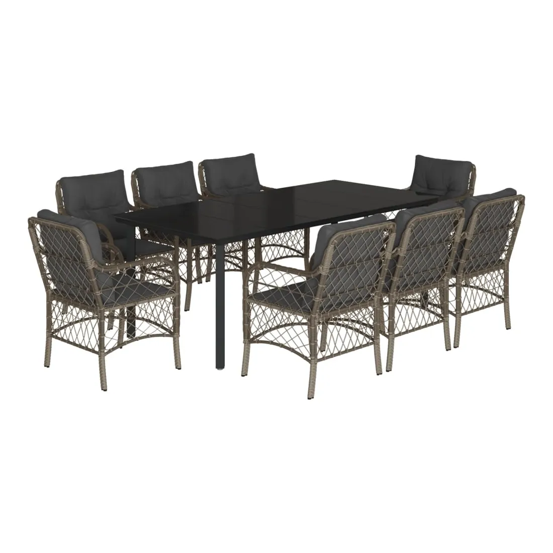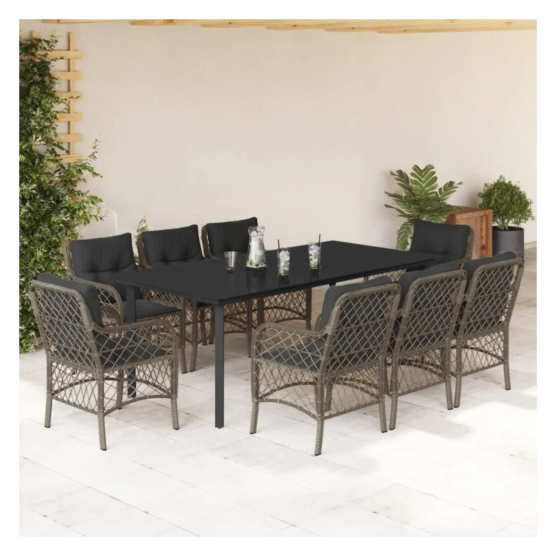 Cet ensemble de salle à manger de jardin est un excellent choix pour les repas en plein air ou pour vous détendre dans le jardin, l'arrière-cour ou le patio. Matériau durable : la résine tressée, également connue sous le nom de poly rotin, est un matériau synthétique solide et nécessitant peu d'entretien qui ressemble au rotin naturel. Il est léger, facile à nettoyer et couramment utilisé pour les meubles d'extérieur en raison de sa durabilité et de ses propriétés de résistance aux intempéries.Expérience d'assise confortable : ce mobilier d'extérieur, doté de coussins épais, offre une expérience d'assise confortable.Housse amovible et lavable : ces coussins de siège sont dotés de housses amovibles pour un lavage et un entretien faciles.Dessus en verre : le dessus de la table d'extérieur est fabriqué en verre trempé solide et durable, ce qui le rend facile à nettoyer avec un chiffon humide et ajoute une touche d'élégance à votre espace extérieur.Cadre robuste et stable : le cadre en acier enduit de poudre assure la solidité et la stabilité du meuble de jardin pour une utilisation quotidienne à l'extérieur. Bon à savoir :Pour que vos meubles d'extérieur restent beaux, nous vous recommandons de les protéger avec une housse imperméable.