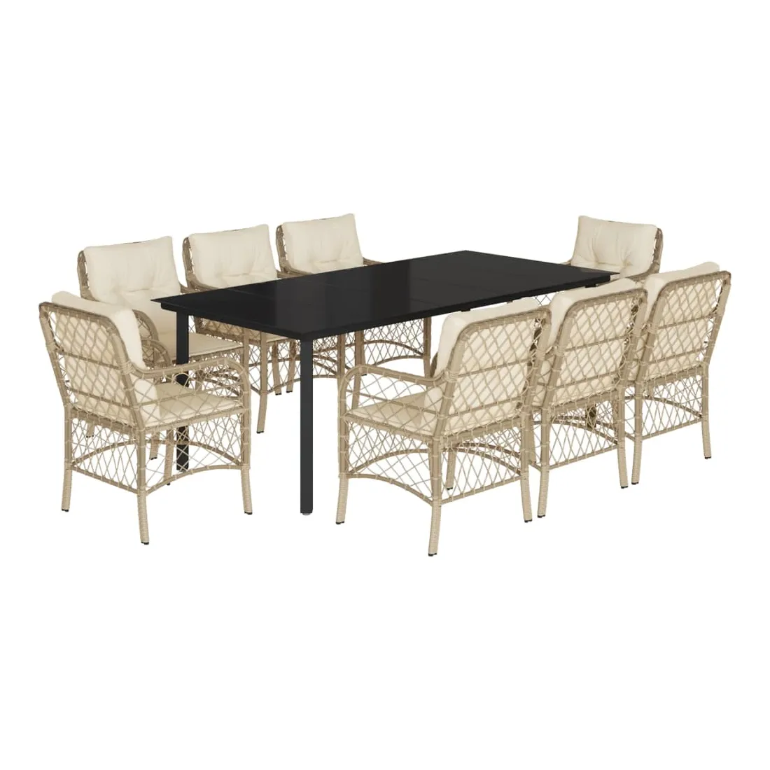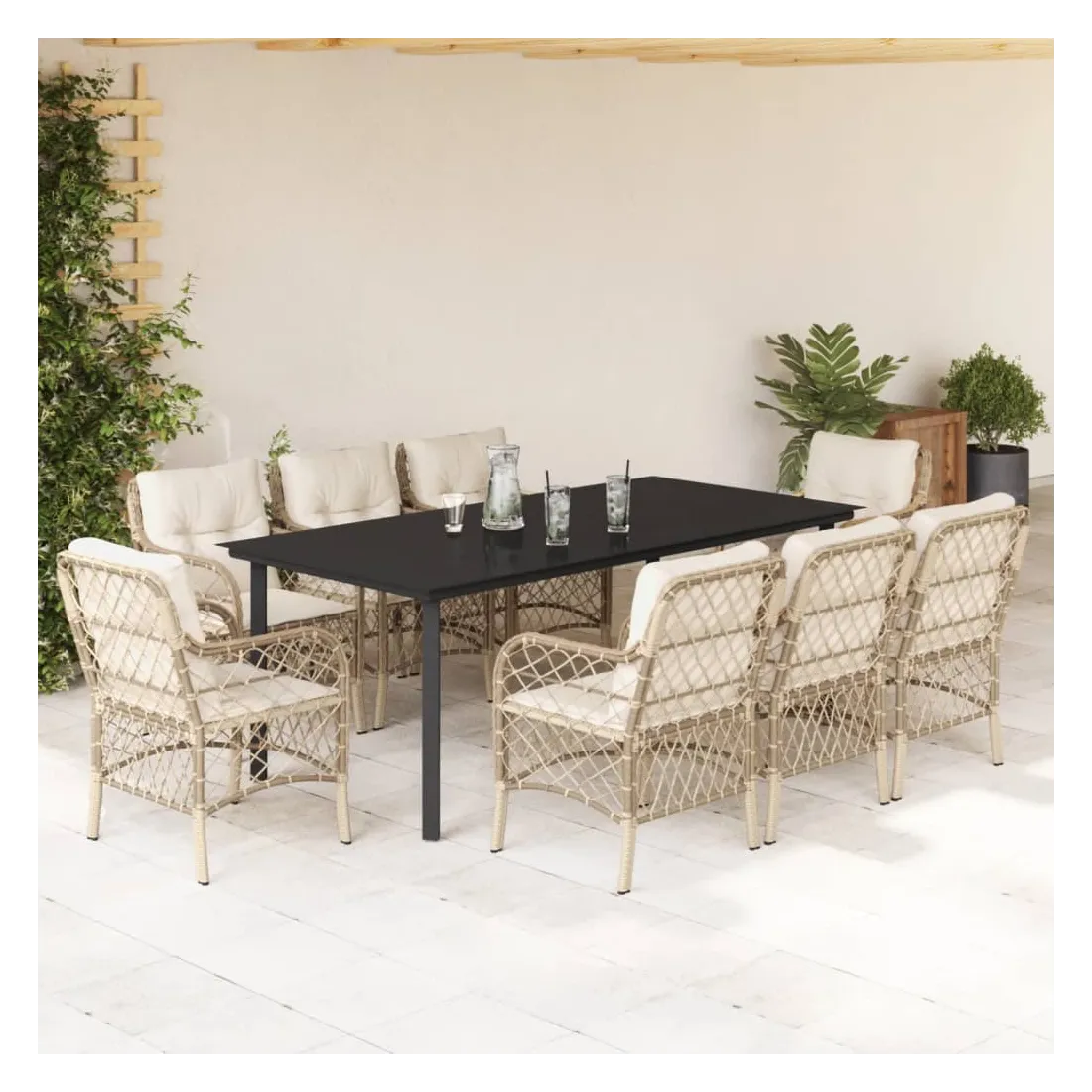 Cet ensemble de salle à manger de jardin est un excellent choix pour les repas en plein air ou pour vous détendre dans le jardin, l'arrière-cour ou le patio. Matériau durable : la résine tressée, également connue sous le nom de poly rotin, est un matériau synthétique solide et nécessitant peu d'entretien qui ressemble au rotin naturel. Il est léger, facile à nettoyer et couramment utilisé pour les meubles d'extérieur en raison de sa durabilité et de ses propriétés de résistance aux intempéries.Expérience d'assise confortable : ce mobilier d'extérieur, doté de coussins épais, offre une expérience d'assise confortable.Housse amovible et lavable : ces coussins de siège sont dotés de housses amovibles pour un lavage et un entretien faciles.Dessus en verre : le dessus de la table d'extérieur est fabriqué en verre trempé solide et durable, ce qui le rend facile à nettoyer avec un chiffon humide et ajoute une touche d'élégance à votre espace extérieur.Cadre robuste et stable : le cadre en acier enduit de poudre assure la solidité et la stabilité du meuble de jardin pour une utilisation quotidienne à l'extérieur. Bon à savoir :Pour que vos meubles d'extérieur restent beaux, nous vous recommandons de les protéger avec une housse imperméable.