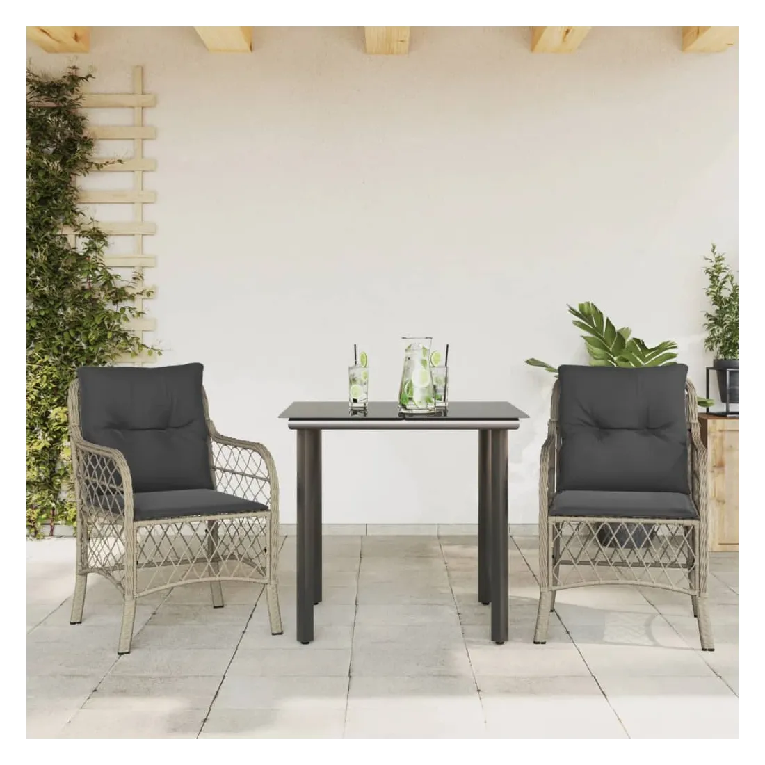 Savourez un café ou discutez avec votre famille et vos amis dans le jardin, l'arrière-cour ou sur le balcon avec cet ensemble de bistro confortable ! Matériau durable : la résine tressée, également connue sous le nom de poly rotin, est un matériau synthétique solide et nécessitant peu d'entretien qui ressemble au rotin naturel. Il est léger, facile à nettoyer et couramment utilisé pour les meubles d'extérieur en raison de sa durabilité et de ses propriétés de résistance aux intempéries.Expérience d'assise confortable : cet ensemble de meubles d'extérieur, doté de coussins épais, offre une expérience d'assise confortable.Housse amovible et lavable : ces coussins de siège sont dotés de housses amovibles pour un lavage et un entretien faciles.Dessus en verre : le dessus de la table d'extérieur est fabriqué en verre trempé solide et durable, ce qui le rend facile à nettoyer avec un chiffon humide et ajoute une touche d'élégance à votre espace extérieur. Bon à savoir :Pour que vos meubles d'extérieur restent beaux, nous vous recommandons de les protéger avec une housse imperméable.