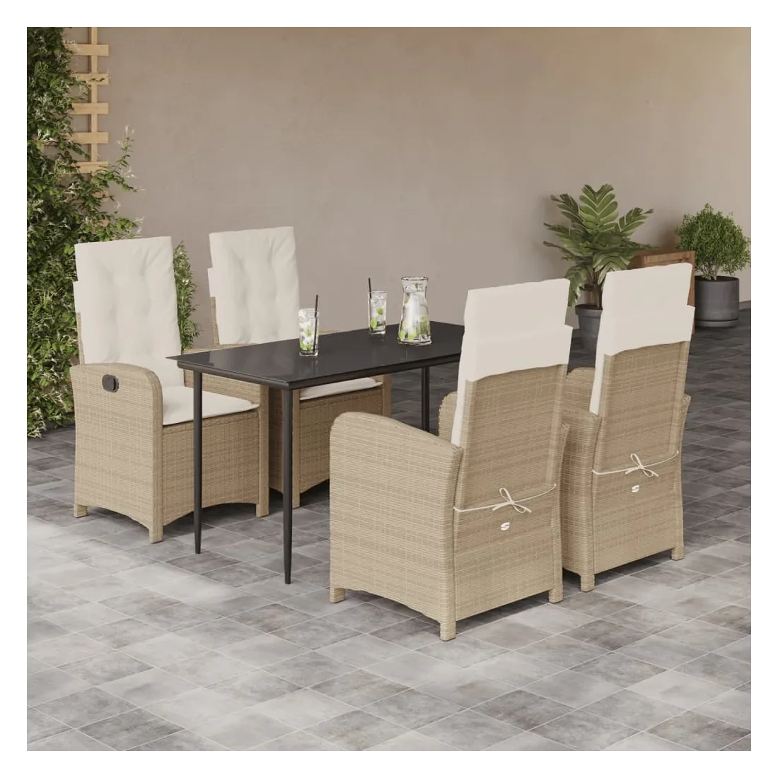 Cet ensemble de salle à manger de jardin est un excellent choix pour les repas en plein air ou pour vous détendre dans le jardin, dans l'arrière-cour ou sur la terrasse. Matériau durable : la résine tressée, également connue sous le nom de poly rotin, est un matériau synthétique solide et nécessitant peu d'entretien qui ressemble au rotin naturel. Il est léger, facile à nettoyer et couramment utilisé pour les meubles d'extérieur en raison de sa durabilité et de ses propriétés de résistance aux intempéries.Dossier réglable : ce siège de jardin est doté d'une poignée. Vous pouvez régler le dossier dans n'importe quelle position en tirant sur la poignée et le remettre rapidement dans sa position initiale.Expérience d'assise confortable : ce mobilier d'extérieur, doté de coussins épais, offre une expérience d'assise confortable.Housse amovible et lavable : ces coussins de siège sont dotés de housses amovibles pour un lavage et un entretien faciles. Les coussins de dossier ont un rabat à l'arrière pour une fixation facile aux dossiers.Dessus en verre : le dessus de la table d'extérieur est fabriqué en verre trempé solide et durable, ce qui le rend facile à nettoyer avec un chiffon humide et ajoute une touche d'élégance à votre espace extérieur. Bon à savoir :Pour que vos meubles d'extérieur restent beaux, nous vous recommandons de les protéger avec une housse imperméable.