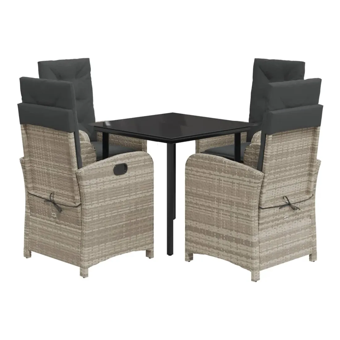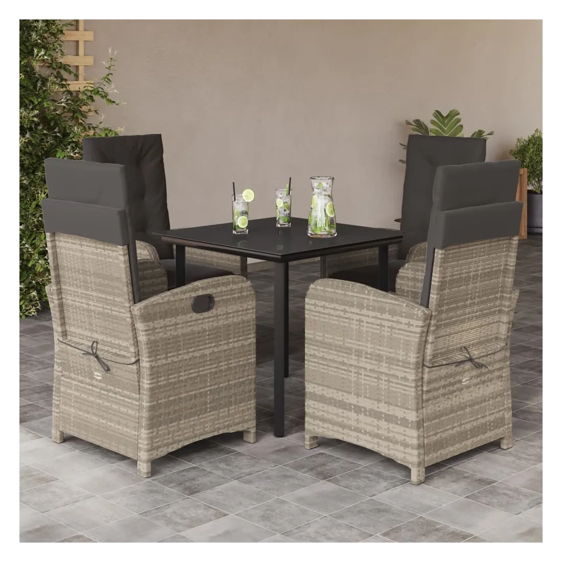 Cet ensemble de salle à manger de jardin est un excellent choix pour les repas en plein air ou pour vous détendre dans le jardin, dans l'arrière-cour ou sur la terrasse. Matériau durable : la résine tressée, également connue sous le nom de poly rotin, est un matériau synthétique solide et nécessitant peu d'entretien qui ressemble au rotin naturel. Il est léger, facile à nettoyer et couramment utilisé pour les meubles d'extérieur en raison de sa durabilité et de ses propriétés de résistance aux intempéries.Dossier réglable : ce siège de jardin est doté d'une poignée. Vous pouvez régler le dossier dans n'importe quelle position en tirant sur la poignée et le remettre rapidement dans sa position initiale.Expérience d'assise confortable : ce mobilier d'extérieur, doté de coussins épais, offre une expérience d'assise confortable.Housse amovible et lavable : ces coussins de siège sont dotés de housses amovibles pour un lavage et un entretien faciles. Les coussins de dossier ont un rabat à l'arrière pour une fixation facile aux dossiers.Dessus en verre : le dessus de la table d'extérieur est fabriqué en verre trempé solide et durable, ce qui le rend facile à nettoyer avec un chiffon humide et ajoute une touche d'élégance à votre espace extérieur. Bon à savoir :Pour que vos meubles d'extérieur restent beaux, nous vous recommandons de les protéger avec une housse imperméable.