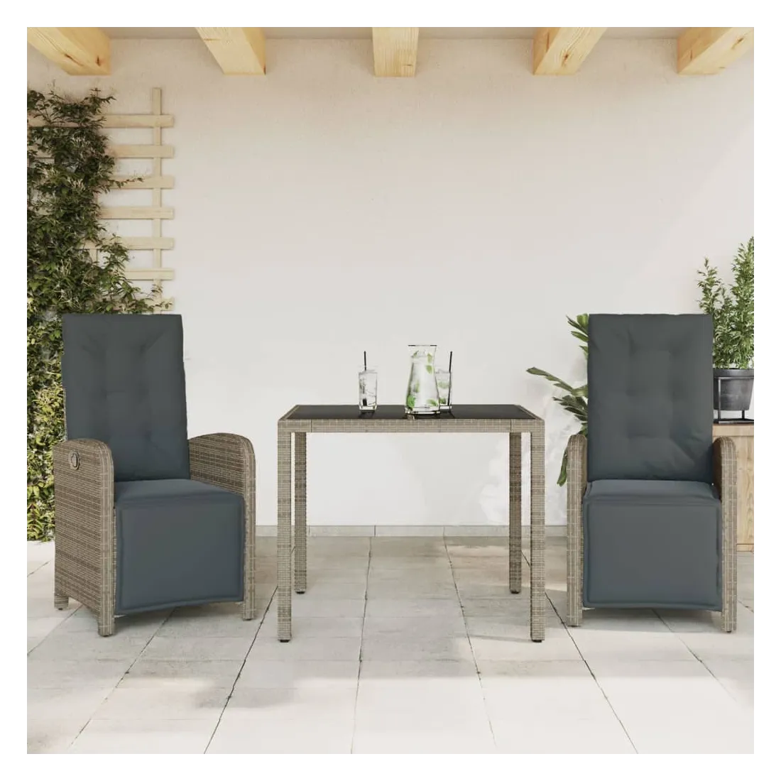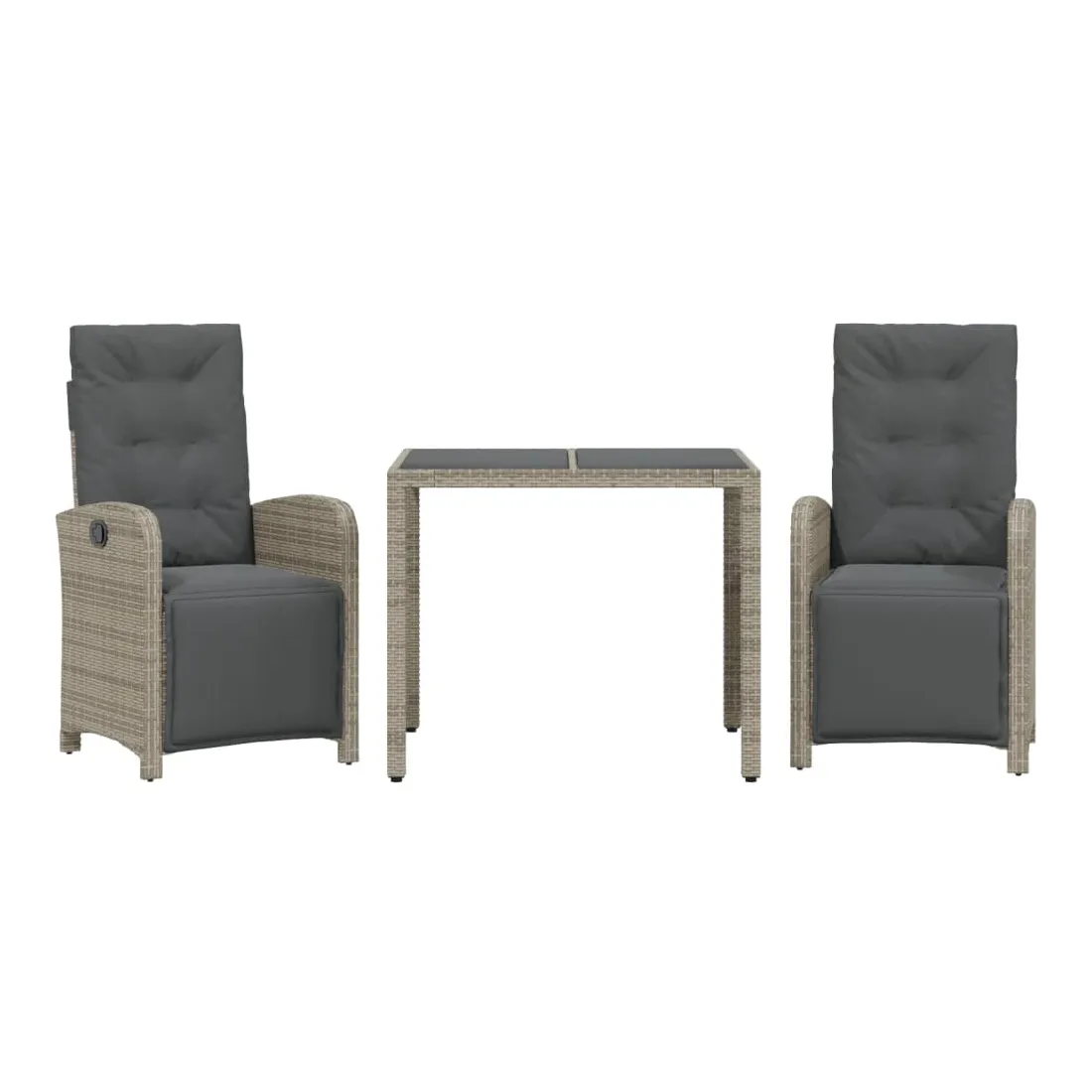 vidaXLSavourez une tasse de café ou discutez avec votre famille et vos amis dans le jardin, l'arrière-cour ou sur le balcon avec cet ensemble de bistro confortable ! Matériau durable : la résine tressée, également connue sous le nom de poly rotin, est un matériau synthétique solide et nécessitant peu d'entretien qui ressemble au rotin naturel. Il est léger, facile à nettoyer et couramment utilisé pour les meubles d'extérieur en raison de sa durabilité et de ses propriétés de résistance aux intempéries.Dossier et repose-pied réglables : ce siège de jardin est doté d'une poignée. Vous pouvez régler le dossier et le repose-pied dans n'importe quelle position en tirant sur la poignée, et les remettre rapidement dans leur position initiale.Expérience d'assise confortable : ce mobilier d'extérieur, doté de coussins épais, offre une expérience d'assise confortable.Housse amovible et lavable : ces coussins de siège sont dotés de housses amovibles pour un lavage et un entretien faciles. Les coussins de dossier ont un rabat à l'arrière pour une fixation facile aux dossiers.Dessus en verre : le dessus de la table d'extérieur est fabriqué en verre trempé solide et durable, ce qui le rend facile à nettoyer avec un chiffon humide et ajoute une touche d'élégance à votre espace extérieur. Bon à savoir :Pour que vos meubles d'extérieur restent beaux, nous vous recommandons de les protéger avec une housse imperméable.