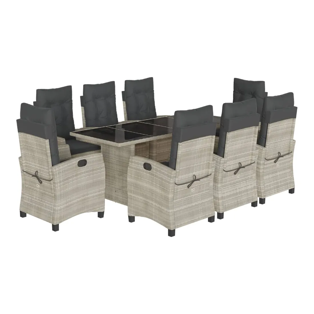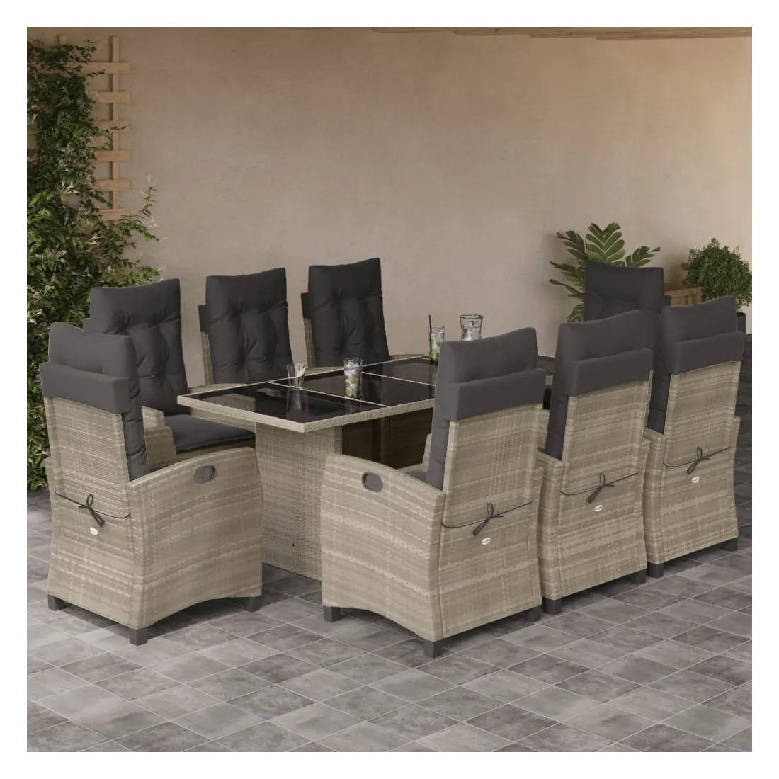 Cet ensemble de salle à manger de jardin est un excellent choix pour les repas en plein air ou pour vous détendre dans le jardin, l'arrière-cour ou le patio. Matériau durable : la résine tressée, également connue sous le nom de poly rotin, est un matériau synthétique solide et nécessitant peu d'entretien qui ressemble au rotin naturel. Il est léger, facile à nettoyer et couramment utilisé pour les meubles d'extérieur en raison de sa durabilité et de ses propriétés de résistance aux intempéries. Dossier réglable : ce siège de jardin est doté d'une poignée. Vous pouvez régler le dossier dans n'importe quelle position en tirant sur la poignée et le remettre rapidement dans sa position initiale.Dessus en verre : le dessus de la table d'extérieur est fabriqué en verre trempé solide et durable, ce qui le rend facile à nettoyer avec un chiffon humide et ajoute une touche d'élégance à votre espace extérieur. Expérience d'assise confortable : ce mobilier d'extérieur, doté de coussins épais, offre une expérience d'assise confortable. Housse amovible et lavable : ces coussins de siège sont dotés de housses amovibles pour un lavage et un entretien faciles. Bon à savoir :Pour que vos meubles d'extérieur restent beaux, nous vous recommandons de les protéger avec une housse imperméable.