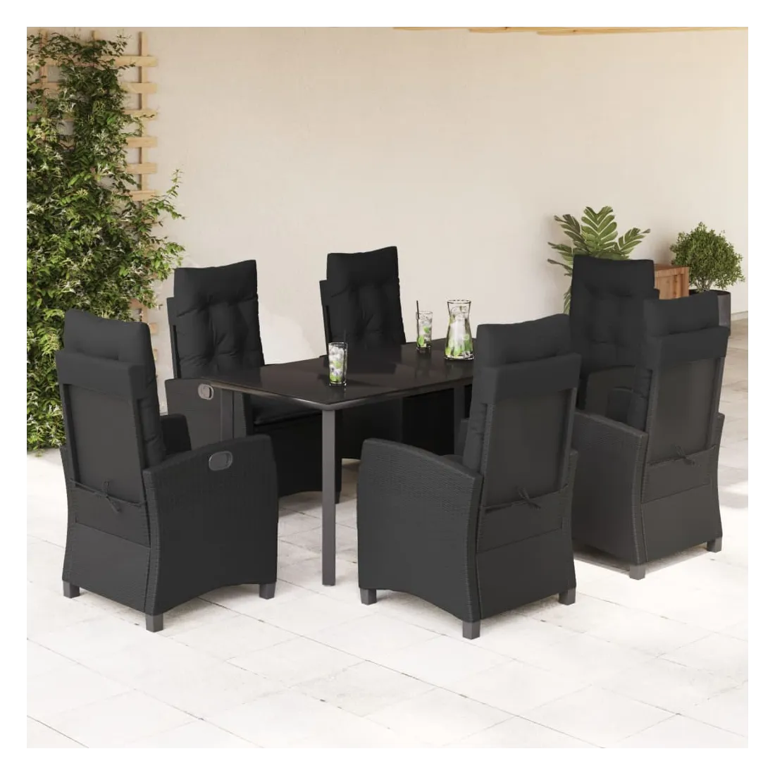 Cet ensemble de salle à manger de jardin est un excellent choix pour les repas en plein air ou pour vous détendre dans le jardin, l'arrière-cour ou le patio. Matériau durable : la résine tressée, également connue sous le nom de poly rotin, est un matériau synthétique solide et nécessitant peu d'entretien qui ressemble au rotin naturel. Il est léger, facile à nettoyer et couramment utilisé pour les meubles d'extérieur en raison de sa durabilité et de ses propriétés de résistance aux intempéries. Dossier réglable : ce siège de jardin est doté d'une poignée. Vous pouvez régler le dossier dans n'importe quelle position en tirant sur la poignée et le remettre rapidement dans sa position initiale.Dessus en verre : le dessus de la table d'extérieur est fabriqué en verre trempé solide et durable, ce qui le rend facile à nettoyer avec un chiffon humide et ajoute une touche d'élégance à votre espace extérieur. Expérience d'assise confortable : ce mobilier d'extérieur, doté de coussins épais, offre une expérience d'assise confortable. Housse amovible et lavable : ces coussins de siège sont dotés de housses amovibles pour un lavage et un entretien faciles. Bon à savoir :Pour que vos meubles d'extérieur restent beaux, nous vous recommandons de les protéger avec une housse imperméable.