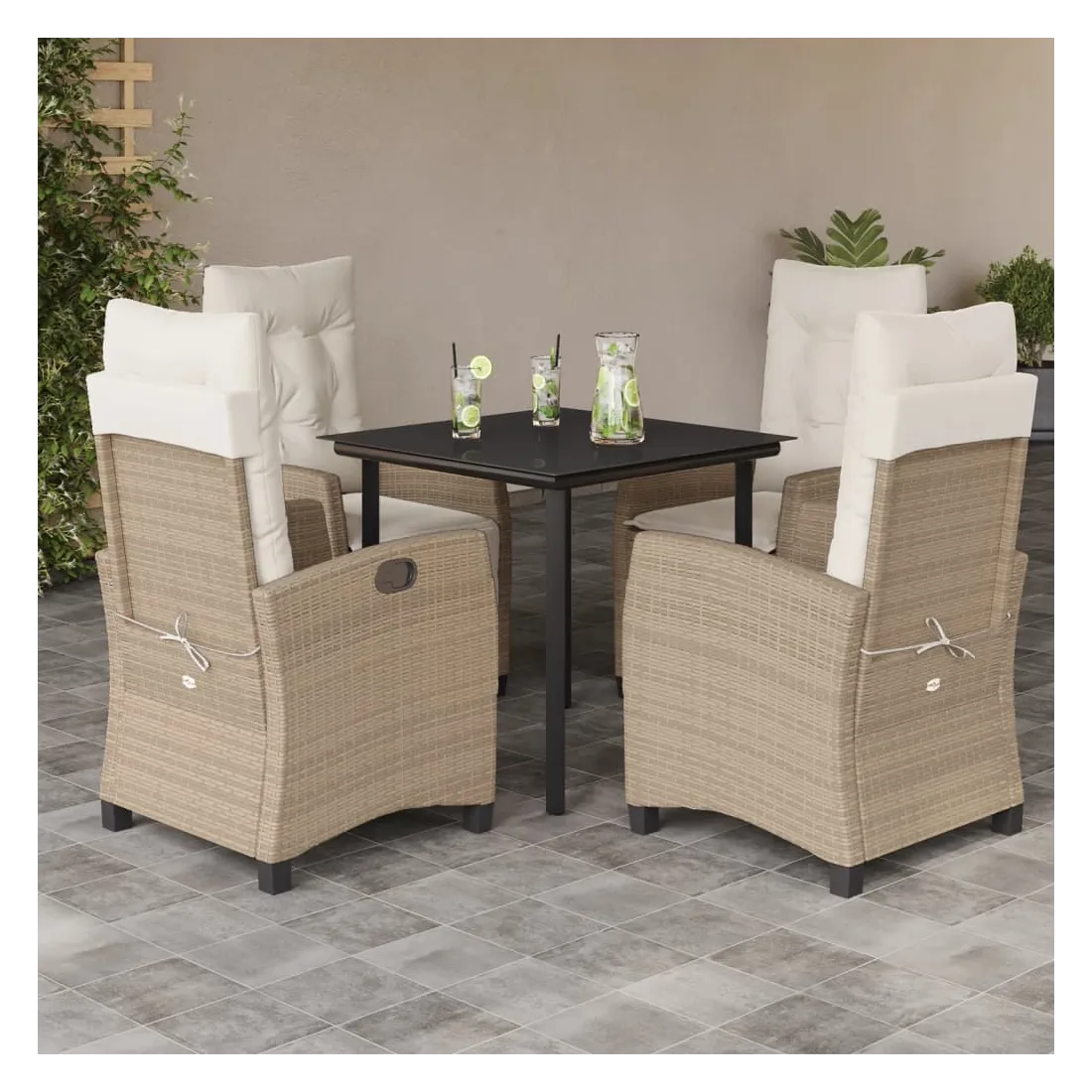 Cet ensemble de salle à manger de jardin est un excellent choix pour les repas en plein air ou pour vous détendre dans le jardin, l'arrière-cour ou le patio. Matériau durable : la résine tressée, également connue sous le nom de poly rotin, est un matériau synthétique solide et nécessitant peu d'entretien qui ressemble au rotin naturel. Il est léger, facile à nettoyer et couramment utilisé pour les meubles d'extérieur en raison de sa durabilité et de ses propriétés de résistance aux intempéries. Dossier réglable : ce siège de jardin est doté d'une poignée. Vous pouvez régler le dossier dans n'importe quelle position en tirant sur la poignée et le remettre rapidement dans sa position initiale.Dessus en verre : le dessus de la table d'extérieur est fabriqué en verre trempé solide et durable, ce qui le rend facile à nettoyer avec un chiffon humide et ajoute une touche d'élégance à votre espace extérieur. Expérience d'assise confortable : ce mobilier d'extérieur, doté de coussins épais, offre une expérience d'assise confortable. Housse amovible et lavable : ces coussins de siège sont dotés de housses amovibles pour un lavage et un entretien faciles. Bon à savoir :Pour que vos meubles d'extérieur restent beaux, nous vous recommandons de les protéger avec une housse imperméable.