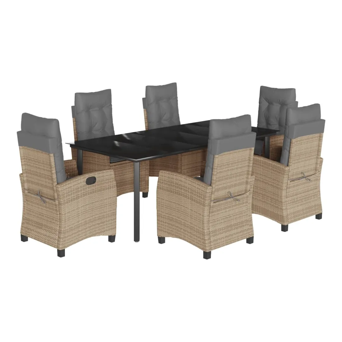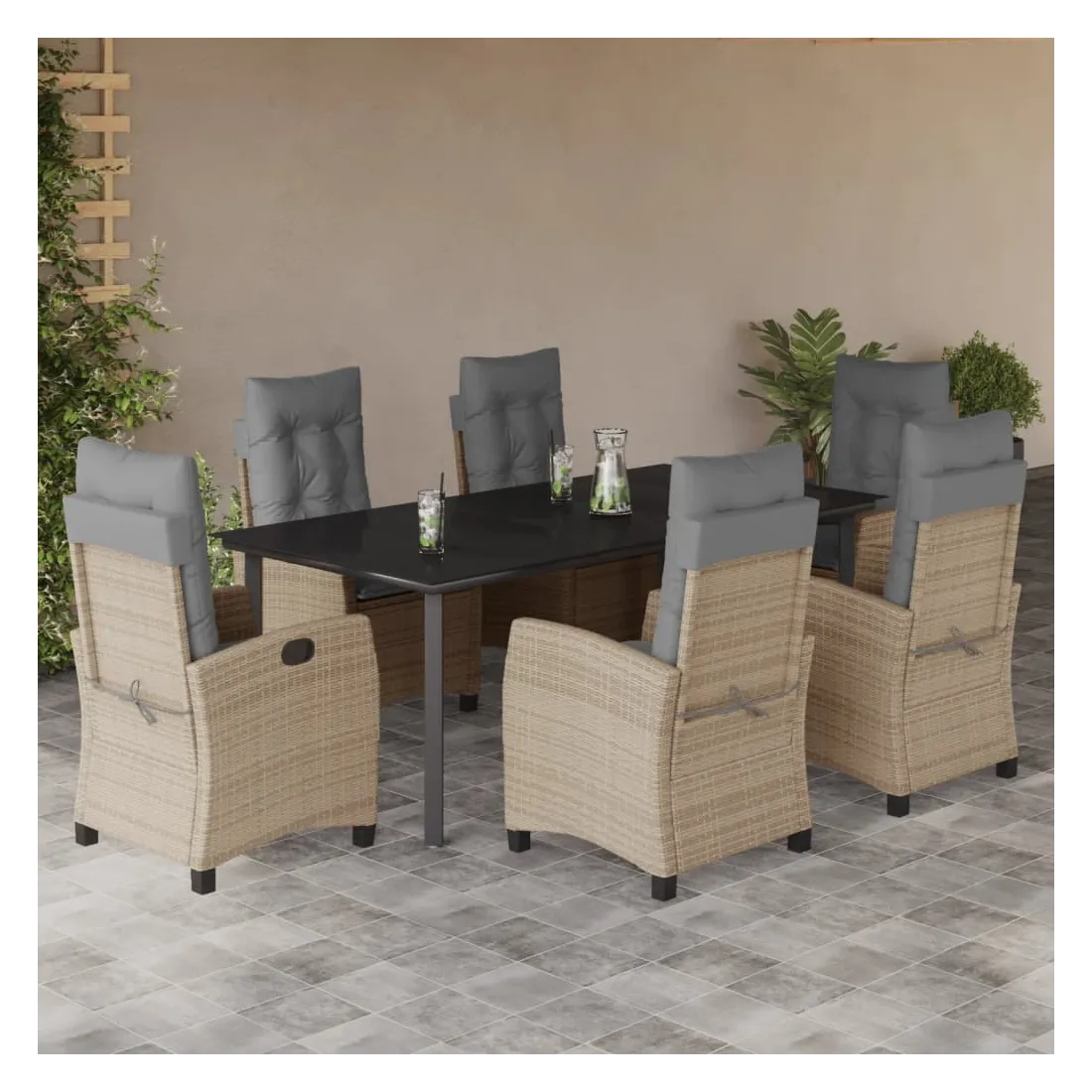 Cet ensemble de salle à manger de jardin est un excellent choix pour les repas en plein air ou pour vous détendre dans le jardin, l'arrière-cour ou le patio. Matériau durable : la résine tressée, également connue sous le nom de poly rotin, est un matériau synthétique solide et nécessitant peu d'entretien qui ressemble au rotin naturel. Il est léger, facile à nettoyer et couramment utilisé pour les meubles d'extérieur en raison de sa durabilité et de ses propriétés de résistance aux intempéries. Dossier réglable : ce siège de jardin est doté d'une poignée. Vous pouvez régler le dossier dans n'importe quelle position en tirant sur la poignée et le remettre rapidement dans sa position initiale.Dessus en verre : le dessus de la table d'extérieur est fabriqué en verre trempé solide et durable, ce qui le rend facile à nettoyer avec un chiffon humide et ajoute une touche d'élégance à votre espace extérieur. Expérience d'assise confortable : ce mobilier d'extérieur, doté de coussins épais, offre une expérience d'assise confortable. Housse amovible et lavable : ces coussins de siège sont dotés de housses amovibles pour un lavage et un entretien faciles. Bon à savoir :Pour que vos meubles d'extérieur restent beaux, nous vous recommandons de les protéger avec une housse imperméable.