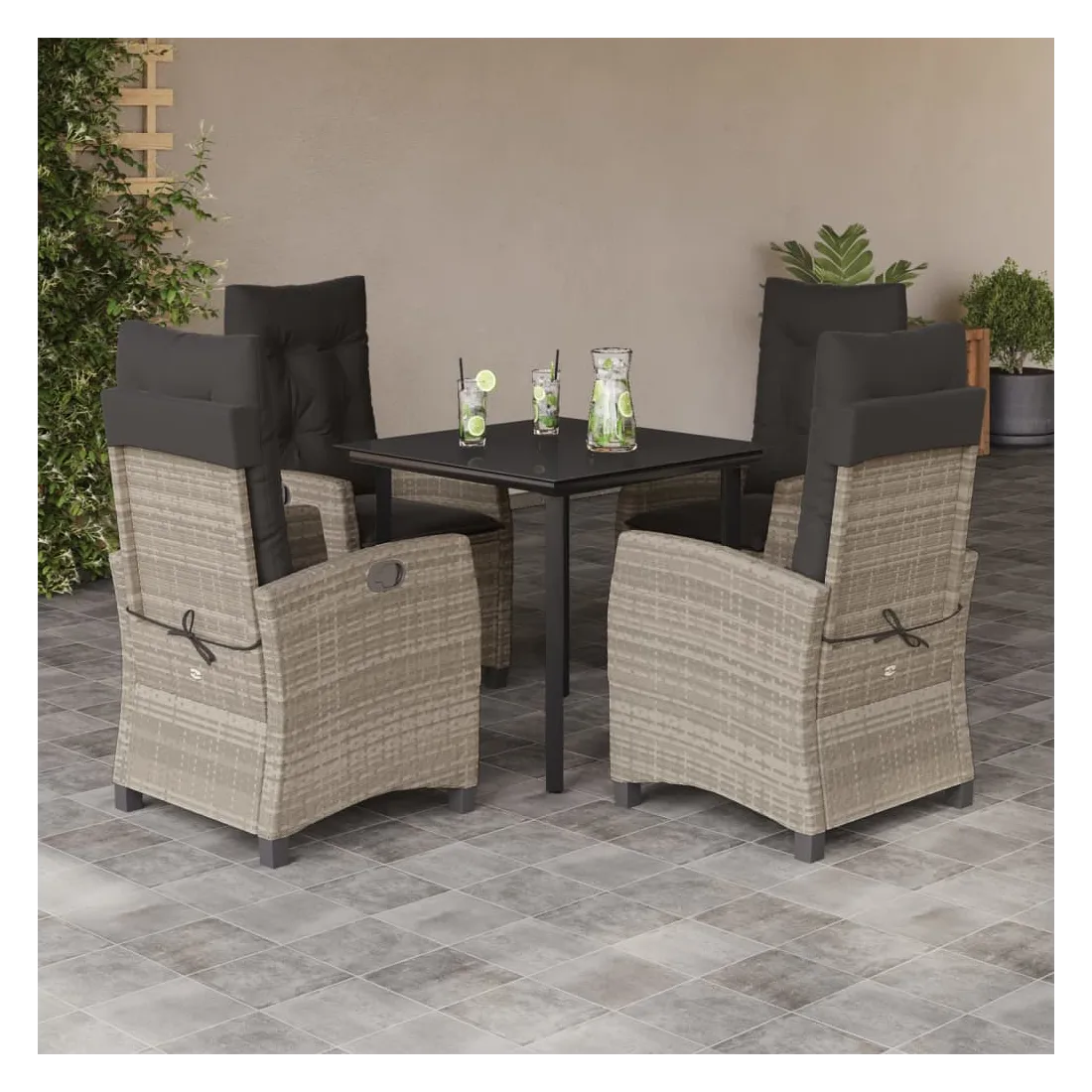 Cet ensemble de salle à manger de jardin est un excellent choix pour les repas en plein air ou pour vous détendre dans le jardin, l'arrière-cour ou le patio. Matériau durable : la résine tressée, également connue sous le nom de poly rotin, est un matériau synthétique solide et nécessitant peu d'entretien qui ressemble au rotin naturel. Il est léger, facile à nettoyer et couramment utilisé pour les meubles d'extérieur en raison de sa durabilité et de ses propriétés de résistance aux intempéries. Dossier réglable : ce siège de jardin est doté d'une poignée. Vous pouvez régler le dossier dans n'importe quelle position en tirant sur la poignée et le remettre rapidement dans sa position initiale.Dessus en verre : le dessus de la table d'extérieur est fabriqué en verre trempé solide et durable, ce qui le rend facile à nettoyer avec un chiffon humide et ajoute une touche d'élégance à votre espace extérieur. Expérience d'assise confortable : ce mobilier d'extérieur, doté de coussins épais, offre une expérience d'assise confortable. Housse amovible et lavable : ces coussins de siège sont dotés de housses amovibles pour un lavage et un entretien faciles. Bon à savoir :Pour que vos meubles d'extérieur restent beaux, nous vous recommandons de les protéger avec une housse imperméable.