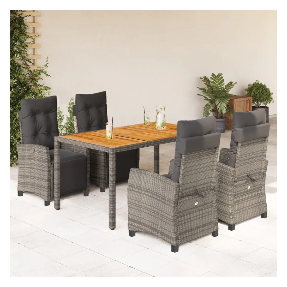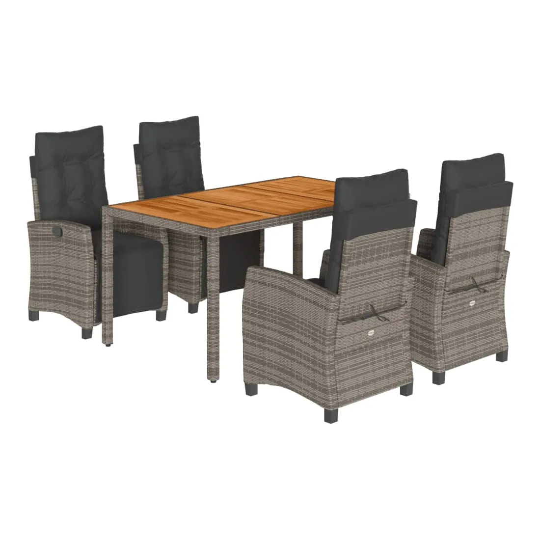 Cet ensemble de salle à manger de jardin est un excellent choix pour les repas en plein air ou pour vous détendre dans le jardin, l'arrière-cour ou le patio. Matériau durable : la résine tressée, également connue sous le nom de poly rotin, est un matériau synthétique solide et nécessitant peu d'entretien qui ressemble au rotin naturel. Il est léger, facile à nettoyer et couramment utilisé pour les meubles d'extérieur en raison de sa durabilité et de ses propriétés de résistance aux intempéries.Dossier et repose-pied réglables : ce siège de jardin est doté d'une poignée. Vous pouvez régler le dossier et le repose-pied dans n'importe quelle position en tirant sur la poignée, et les remettre rapidement dans leur position initiale.Dessus stable et facile à nettoyer : cette table de jardin a un dessus en bois d'acacia robuste, durable et facile à nettoyer avec un chiffon humide.Expérience d'assise confortable : ce mobilier d'extérieur, doté de coussins épais, offre une expérience d'assise confortable.Housse amovible et lavable : ces coussins de siège sont dotés de housses amovibles pour un lavage et un entretien faciles. Bon à savoir :Pour que vos meubles d'extérieur restent beaux, nous vous recommandons de les protéger avec une housse imperméable.
