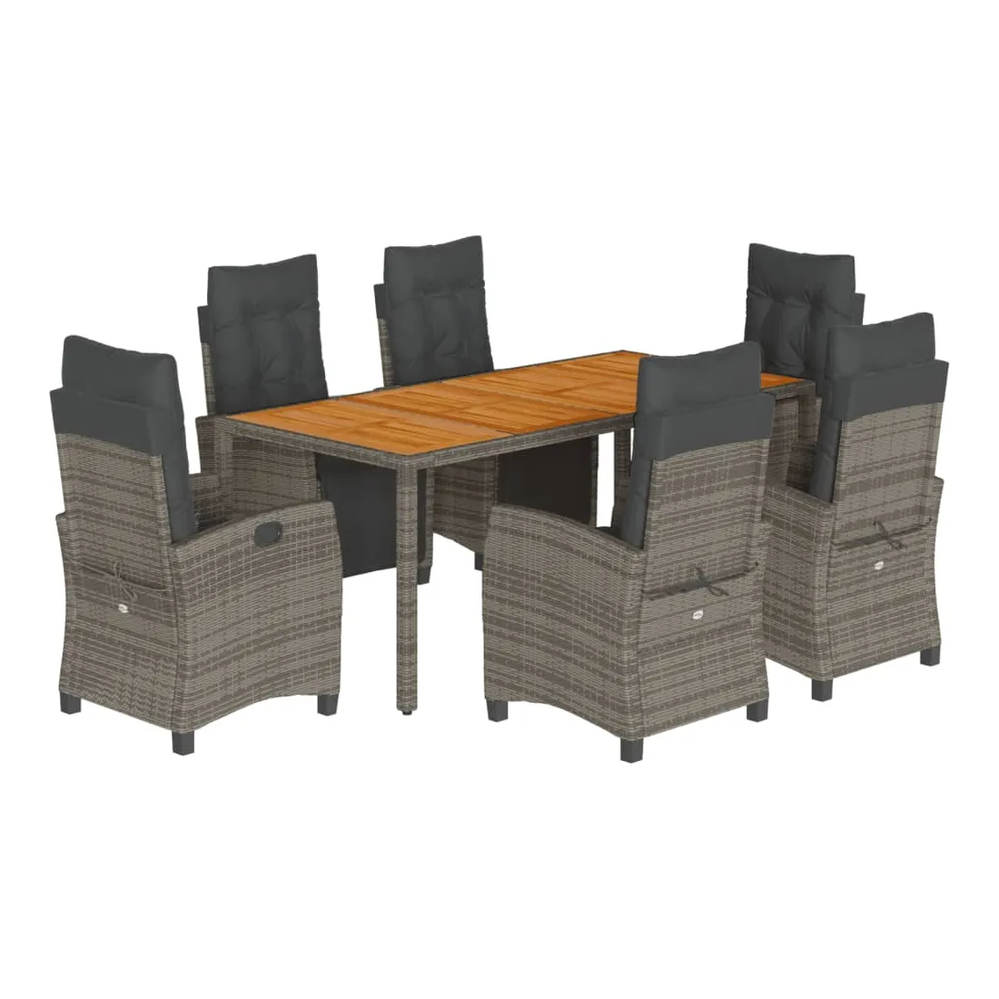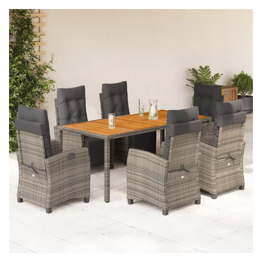Cet ensemble de salle à manger de jardin est un excellent choix pour les repas en plein air ou pour vous détendre dans le jardin, l'arrière-cour ou le patio. Matériau durable : la résine tressée, également connue sous le nom de poly rotin, est un matériau synthétique solide et nécessitant peu d'entretien qui ressemble au rotin naturel. Il est léger, facile à nettoyer et couramment utilisé pour les meubles d'extérieur en raison de sa durabilité et de ses propriétés de résistance aux intempéries.Dossier et repose-pied réglables : ce siège de jardin est doté d'une poignée. Vous pouvez régler le dossier et le repose-pied dans n'importe quelle position en tirant sur la poignée, et les remettre rapidement dans leur position initiale.Dessus stable et facile à nettoyer : cette table de jardin a un dessus en bois d'acacia robuste, durable et facile à nettoyer avec un chiffon humide.Expérience d'assise confortable : ce mobilier d'extérieur, doté de coussins épais, offre une expérience d'assise confortable.Housse amovible et lavable : ces coussins de siège sont dotés de housses amovibles pour un lavage et un entretien faciles. Bon à savoir :Pour que vos meubles d'extérieur restent beaux, nous vous recommandons de les protéger avec une housse imperméable.