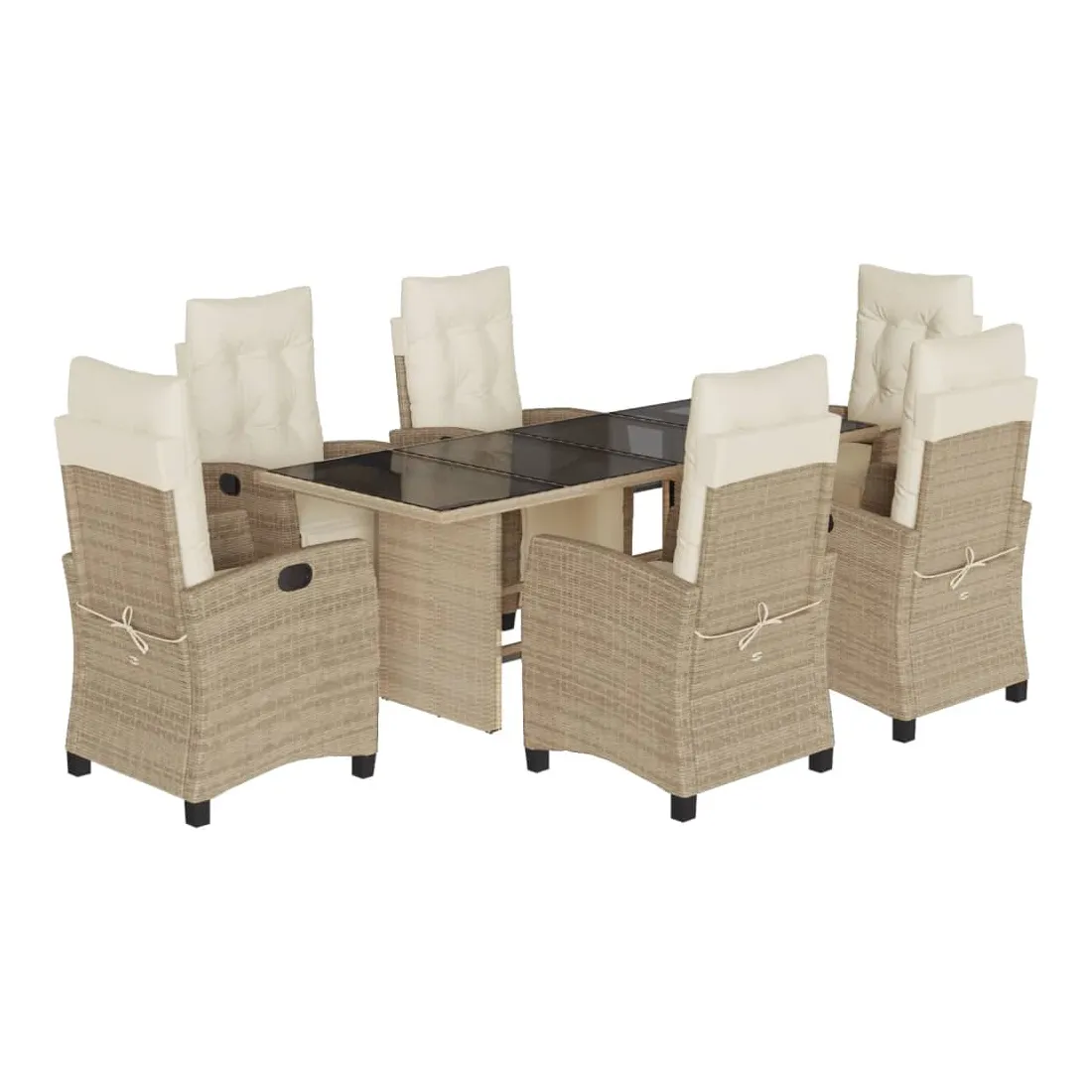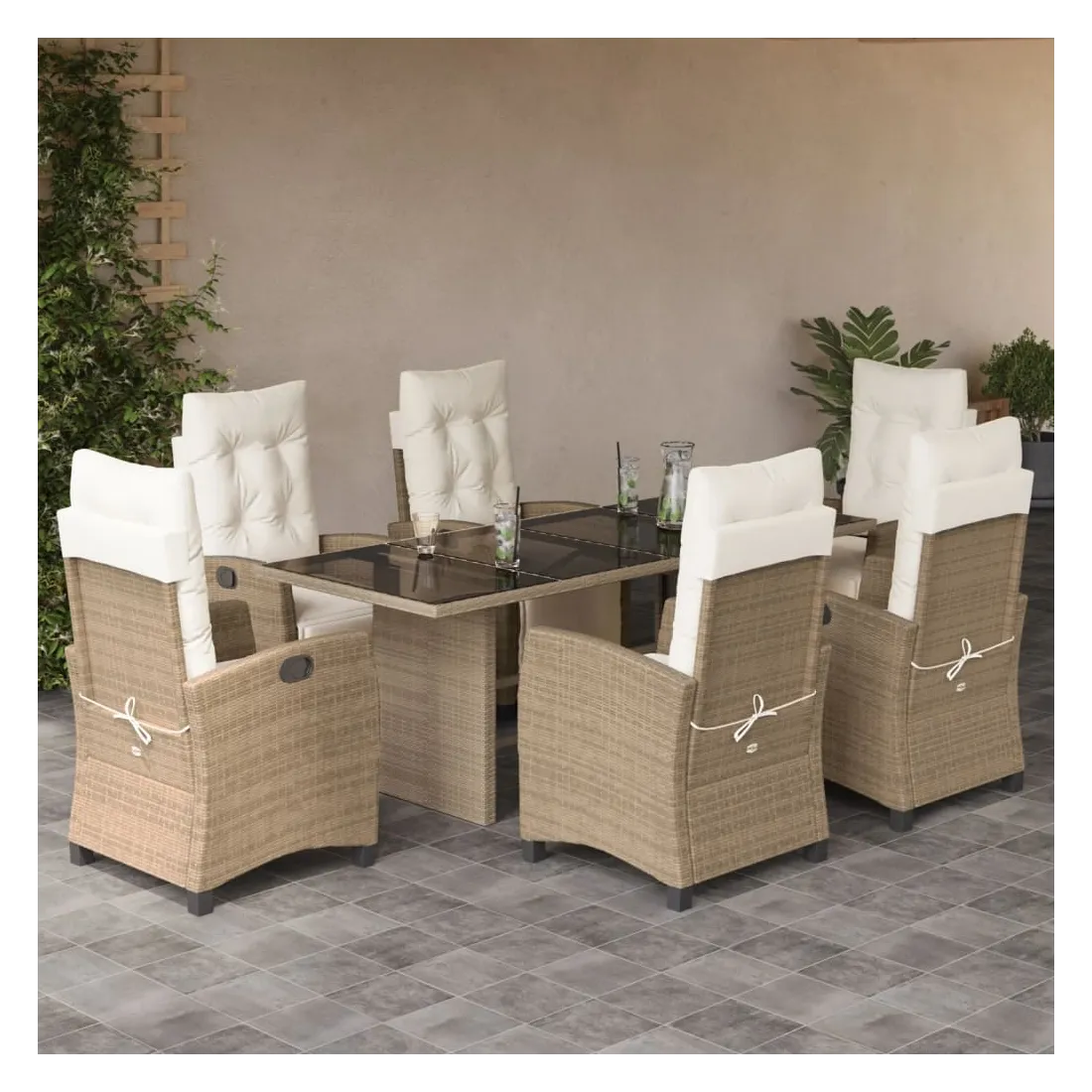 Cet ensemble de salle à manger de jardin est un excellent choix pour les repas en plein air ou pour vous détendre dans le jardin, l'arrière-cour ou le patio. Matériau durable : la résine tressée, également connue sous le nom de poly rotin, est un matériau synthétique solide et nécessitant peu d'entretien qui ressemble au rotin naturel. Il est léger, facile à nettoyer et couramment utilisé pour les meubles d'extérieur en raison de sa durabilité et de ses propriétés de résistance aux intempéries.Dossier et repose-pied réglables : ce siège de jardin est doté d'une poignée. Vous pouvez régler le dossier et le repose-pied dans n'importe quelle position en tirant sur la poignée, et les remettre rapidement dans leur position initiale.Dessus en verre : le dessus de la table d'extérieur est fabriqué en verre trempé solide et durable, ce qui le rend facile à nettoyer avec un chiffon humide et ajoute une touche d'élégance à votre espace extérieur.Expérience d'assise confortable : ce mobilier d'extérieur, doté de coussins épais, offre une expérience d'assise confortable.Housse amovible et lavable : ces coussins de siège sont dotés de housses amovibles pour un lavage et un entretien faciles. Bon à savoir :Pour que vos meubles d'extérieur restent beaux, nous vous recommandons de les protéger avec une housse imperméable.