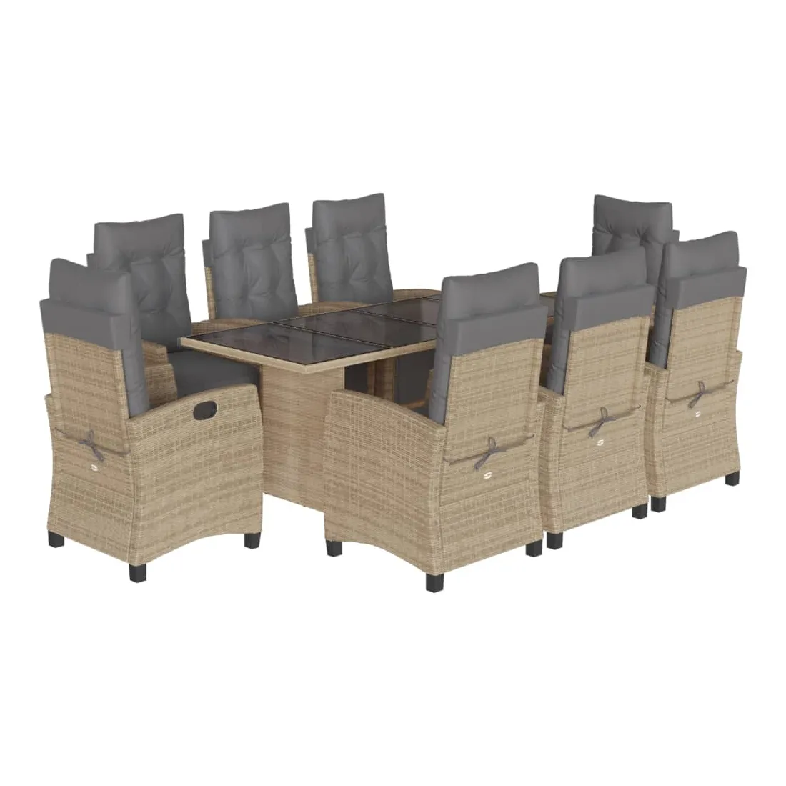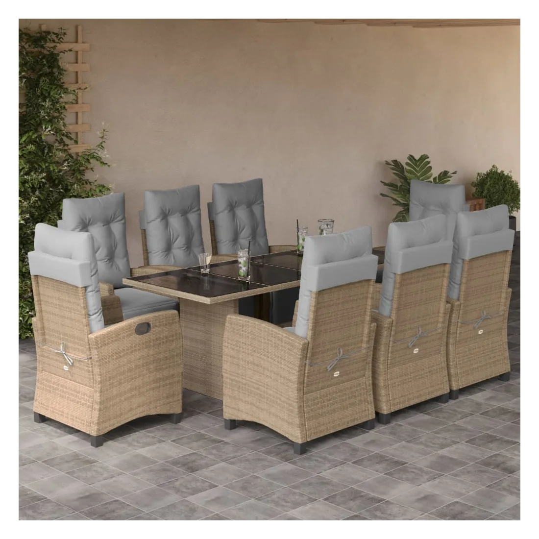 vidaXLCet ensemble de salle à manger de jardin est un excellent choix pour les repas en plein air ou pour vous détendre dans le jardin, l'arrière-cour ou le patio. Matériau durable : la résine tressée, également connue sous le nom de poly rotin, est un matériau synthétique solide et nécessitant peu d'entretien qui ressemble au rotin naturel. Il est léger, facile à nettoyer et couramment utilisé pour les meubles d'extérieur en raison de sa durabilité et de ses propriétés de résistance aux intempéries.Dossier et repose-pied réglables : ce siège de jardin est doté d'une poignée. Vous pouvez régler le dossier et le repose-pied dans n'importe quelle position en tirant sur la poignée, et les remettre rapidement dans leur position initiale.Dessus en verre : le dessus de la table d'extérieur est fabriqué en verre trempé solide et durable, ce qui le rend facile à nettoyer avec un chiffon humide et ajoute une touche d'élégance à votre espace extérieur.Expérience d'assise confortable : ce mobilier d'extérieur, doté de coussins épais, offre une expérience d'assise confortable.Housse amovible et lavable : ces coussins de siège sont dotés de housses amovibles pour un lavage et un entretien faciles. Bon à savoir :Pour que vos meubles d'extérieur restent beaux, nous vous recommandons de les protéger avec une housse imperméable.