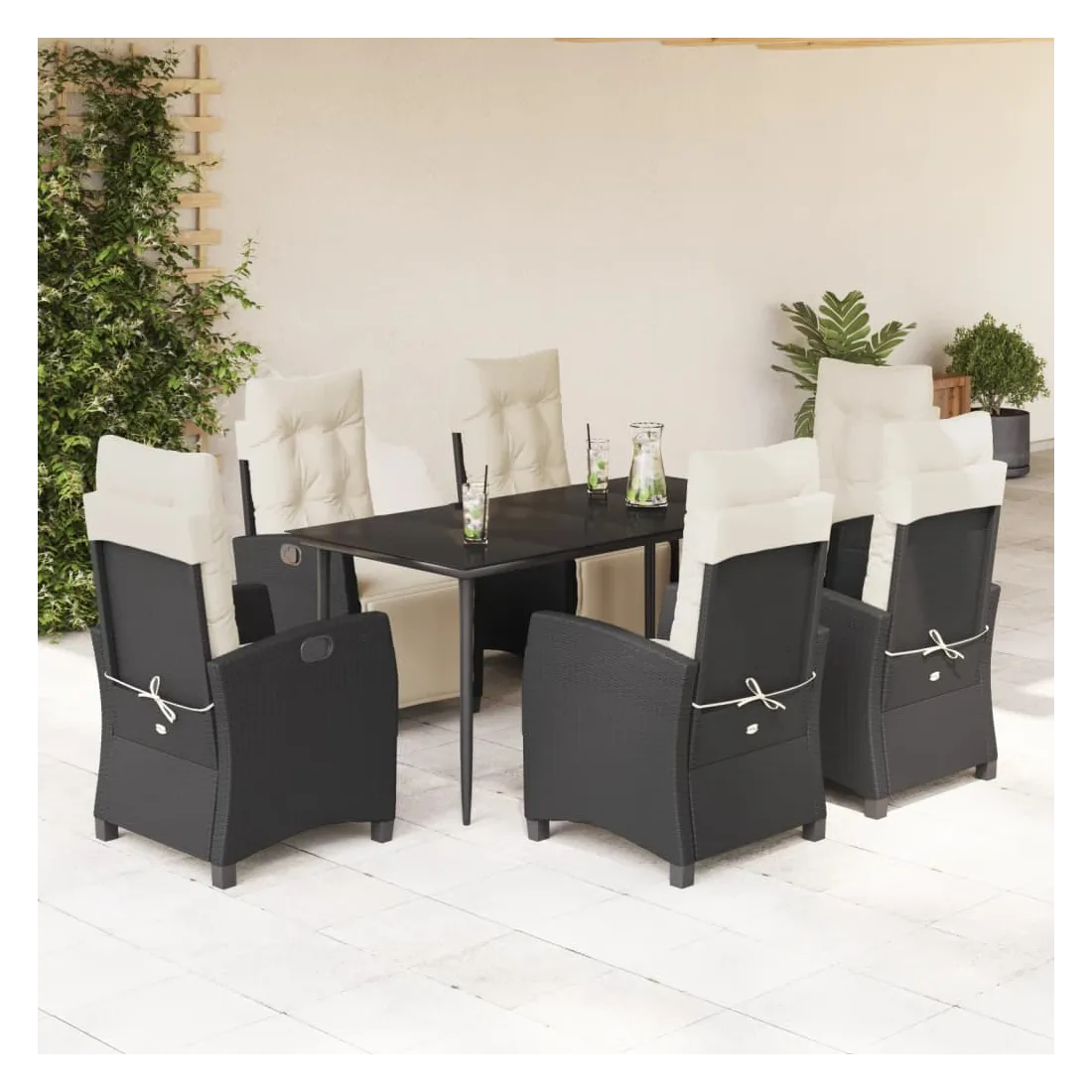 Cet ensemble de salle à manger de jardin est un excellent choix pour les repas en plein air ou pour vous détendre dans le jardin, l'arrière-cour ou le patio. Matériau durable : la résine tressée, également connue sous le nom de poly rotin, est un matériau synthétique solide et nécessitant peu d'entretien qui ressemble au rotin naturel. Il est léger, facile à nettoyer et couramment utilisé pour les meubles d'extérieur en raison de sa durabilité et de ses propriétés de résistance aux intempéries.Dossier et repose-pied réglables : ce siège de jardin est doté d'une poignée. Vous pouvez régler le dossier et le repose-pied dans n'importe quelle position en tirant sur la poignée, et les remettre rapidement dans leur position initiale.Dessus en verre : le dessus de la table d'extérieur est fabriqué en verre trempé solide et durable, ce qui le rend facile à nettoyer avec un chiffon humide et ajoute une touche d'élégance à votre espace extérieur.Expérience d'assise confortable : ce mobilier d'extérieur, doté de coussins épais, offre une expérience d'assise confortable.Housse amovible et lavable : ces coussins de siège sont dotés de housses amovibles pour un lavage et un entretien faciles. Bon à savoir :Pour que vos meubles d'extérieur restent beaux, nous vous recommandons de les protéger avec une housse imperméable.