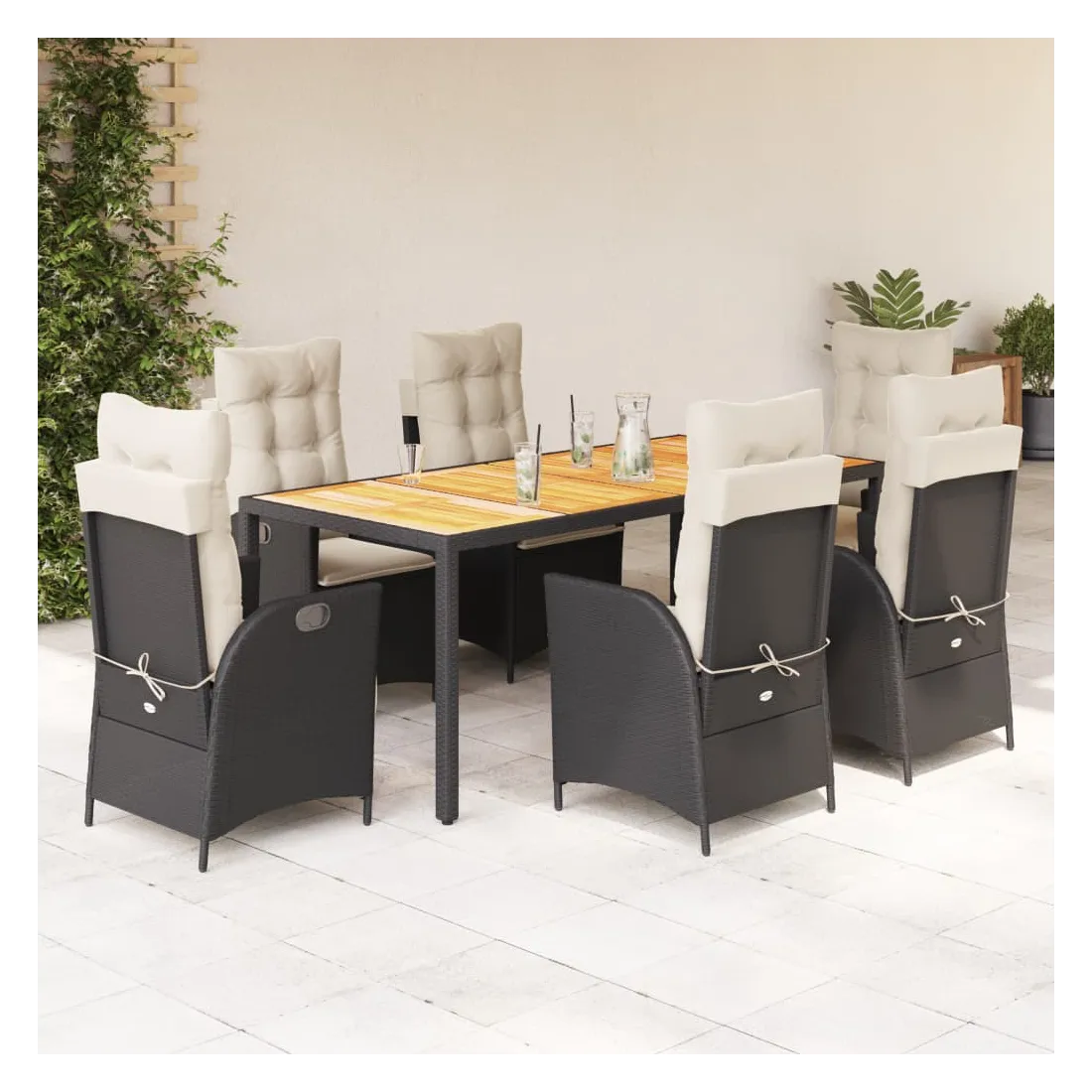 Cet ensemble de salle à manger de jardin est un excellent choix pour les repas en plein air ou pour vous détendre dans le jardin, dans l'arrière-cour ou sur la terrasse. Matériau durable : la résine tressée, également connue sous le nom de poly rotin, est un matériau synthétique solide et nécessitant peu d'entretien qui ressemble au rotin naturel. Il est léger, facile à nettoyer et couramment utilisé pour les meubles d'extérieur en raison de sa durabilité et de ses propriétés de résistance aux intempéries.Dossier réglable : ce siège de jardin est doté d'une poignée. Vous pouvez régler le dossier dans n'importe quelle position en tirant sur la poignée et le remettre rapidement dans sa position initiale.Expérience d'assise confortable : ce mobilier d'extérieur, doté de coussins épais, offre une expérience d'assise confortable.Housse amovible et lavable : ces coussins de siège sont dotés de housses amovibles pour un lavage et un entretien faciles. Les coussins de dossier ont un rabat à l'arrière pour une fixation facile aux dossiers.Dessus stable et facile à nettoyer : cette table de jardin a un dessus en bois d'acacia robuste, durable et facile à nettoyer avec un chiffon humide. Bon à savoir : Pour que vos meubles d'extérieur restent beaux, nous vous recommandons de les protéger avec une housse imperméable.