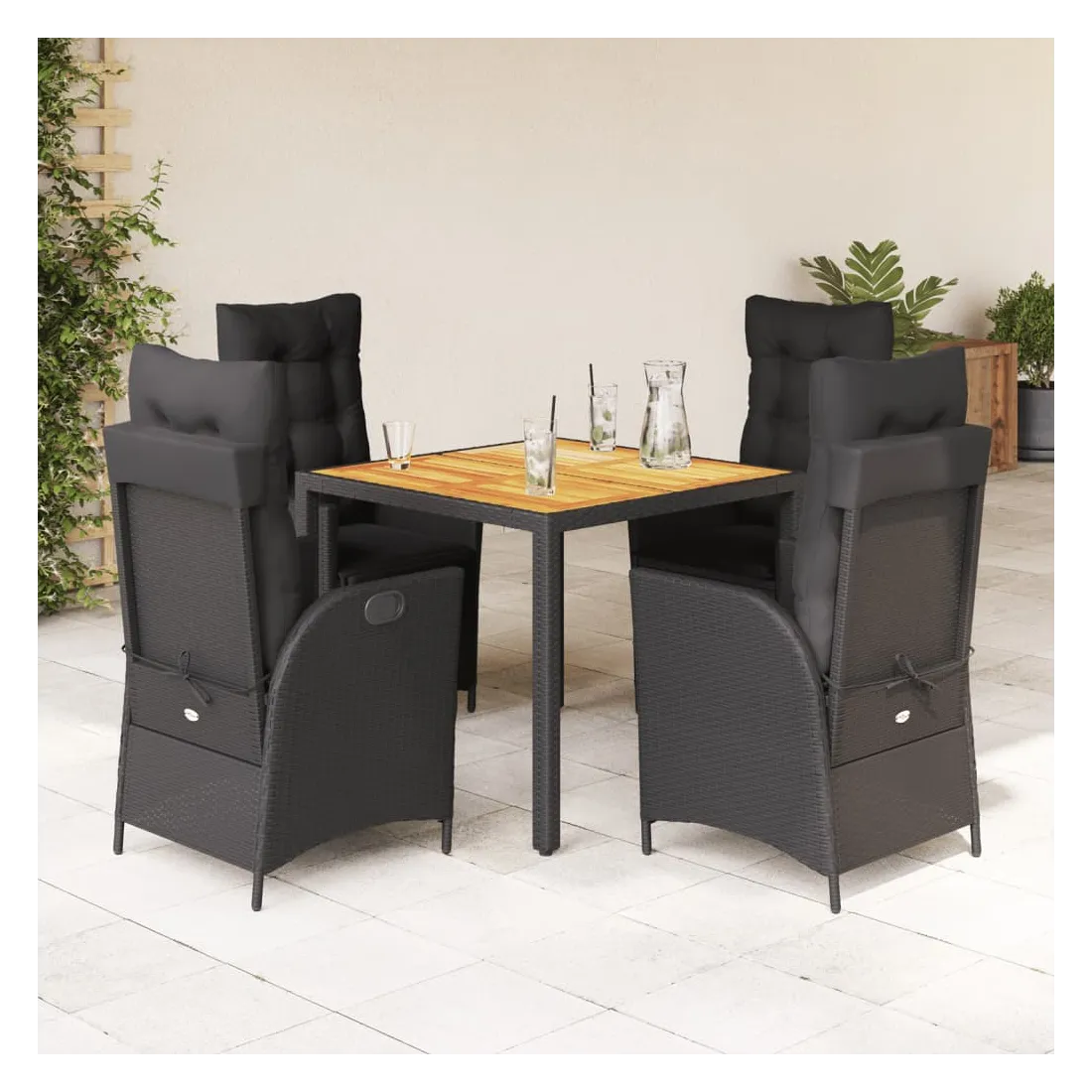 Cet ensemble de salle à manger de jardin est un excellent choix pour les repas en plein air ou pour vous détendre dans le jardin, dans l'arrière-cour ou sur la terrasse. Matériau durable : la résine tressée, également connue sous le nom de poly rotin, est un matériau synthétique solide et nécessitant peu d'entretien qui ressemble au rotin naturel. Il est léger, facile à nettoyer et couramment utilisé pour les meubles d'extérieur en raison de sa durabilité et de ses propriétés de résistance aux intempéries.Dossier réglable : ce siège de jardin est doté d'une poignée. Vous pouvez régler le dossier dans n'importe quelle position en tirant sur la poignée et le remettre rapidement dans sa position initiale.Expérience d'assise confortable : ce mobilier d'extérieur, doté de coussins épais, offre une expérience d'assise confortable.Housse amovible et lavable : ces coussins de siège sont dotés de housses amovibles pour un lavage et un entretien faciles. Les coussins de dossier ont un rabat à l'arrière pour une fixation facile aux dossiers.Dessus stable et facile à nettoyer : cette table de jardin a un dessus en bois d'acacia robuste, durable et facile à nettoyer avec un chiffon humide. Bon à savoir : Pour que vos meubles d'extérieur restent beaux, nous vous recommandons de les protéger avec une housse imperméable.