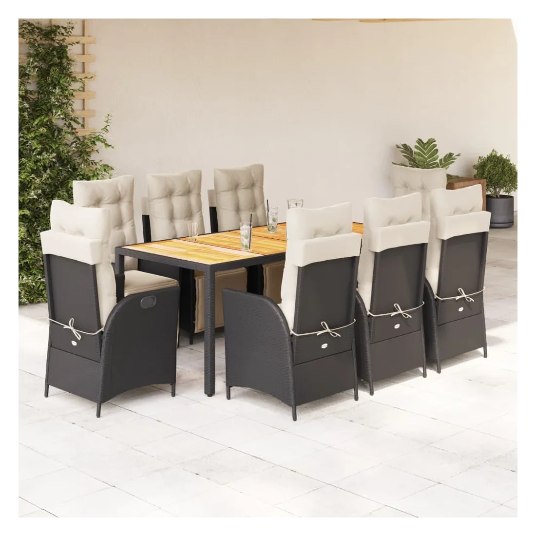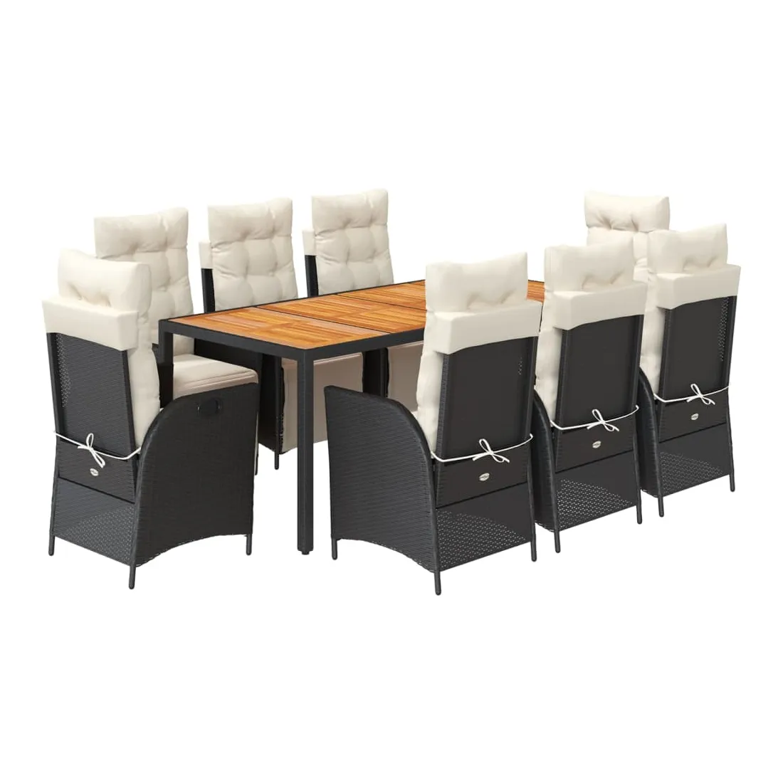 Cet ensemble de salle à manger de jardin est un excellent choix pour les repas en plein air ou pour vous détendre dans le jardin, l'arrière-cour ou le patio. Matériau durable : la résine tressée, également connue sous le nom de poly rotin, est un matériau synthétique solide et nécessitant peu d'entretien qui ressemble au rotin naturel. Il est léger, facile à nettoyer et couramment utilisé pour les meubles d'extérieur en raison de sa durabilité et de ses propriétés de résistance aux intempéries.Dossier et repose-pied réglables : ce siège de jardin est doté d'une poignée. Vous pouvez régler le dossier et le repose-pied dans n'importe quelle position en tirant sur la poignée, et les remettre rapidement dans leur position initiale.Expérience d'assise confortable : ce mobilier d'extérieur, doté de coussins épais, offre une expérience d'assise confortable.Housse amovible et lavable : ces coussins de siège sont dotés de housses amovibles pour un lavage et un entretien faciles. Les coussins de dossier ont un rabat à l'arrière pour une fixation facile aux dossiers.Dessus stable et facile à nettoyer : cette table de jardin a un dessus en bois d'acacia robuste, durable et facile à nettoyer avec un chiffon humide. Bon à savoir :Pour que vos meubles d'extérieur restent beaux, nous vous recommandons de les protéger avec une housse imperméable.