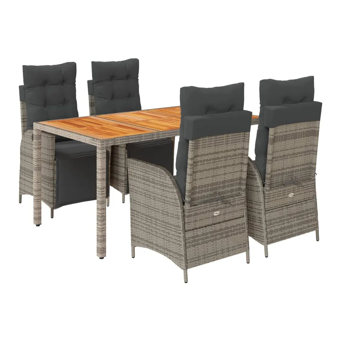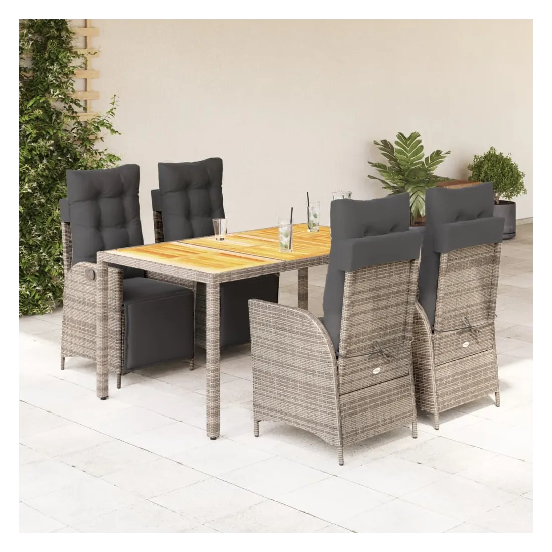 Cet ensemble de salle à manger de jardin est un excellent choix pour les repas en plein air ou pour vous détendre dans le jardin, l'arrière-cour ou le patio. Matériau durable : la résine tressée, également connue sous le nom de poly rotin, est un matériau synthétique solide et nécessitant peu d'entretien qui ressemble au rotin naturel. Il est léger, facile à nettoyer et couramment utilisé pour les meubles d'extérieur en raison de sa durabilité et de ses propriétés de résistance aux intempéries.Dossier et repose-pied réglables : ce siège de jardin est doté d'une poignée. Vous pouvez régler le dossier et le repose-pied dans n'importe quelle position en tirant sur la poignée, et les remettre rapidement dans leur position initiale.Expérience d'assise confortable : ce mobilier d'extérieur, doté de coussins épais, offre une expérience d'assise confortable.Housse amovible et lavable : ces coussins de siège sont dotés de housses amovibles pour un lavage et un entretien faciles. Les coussins de dossier ont un rabat à l'arrière pour une fixation facile aux dossiers.Dessus stable et facile à nettoyer : cette table de jardin a un dessus en bois d'acacia robuste, durable et facile à nettoyer avec un chiffon humide. Bon à savoir :Pour que vos meubles d'extérieur restent beaux, nous vous recommandons de les protéger avec une housse imperméable.