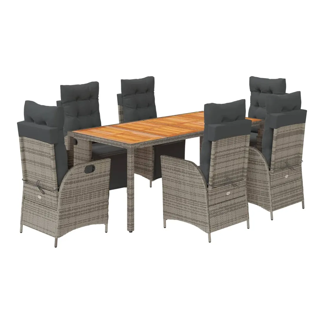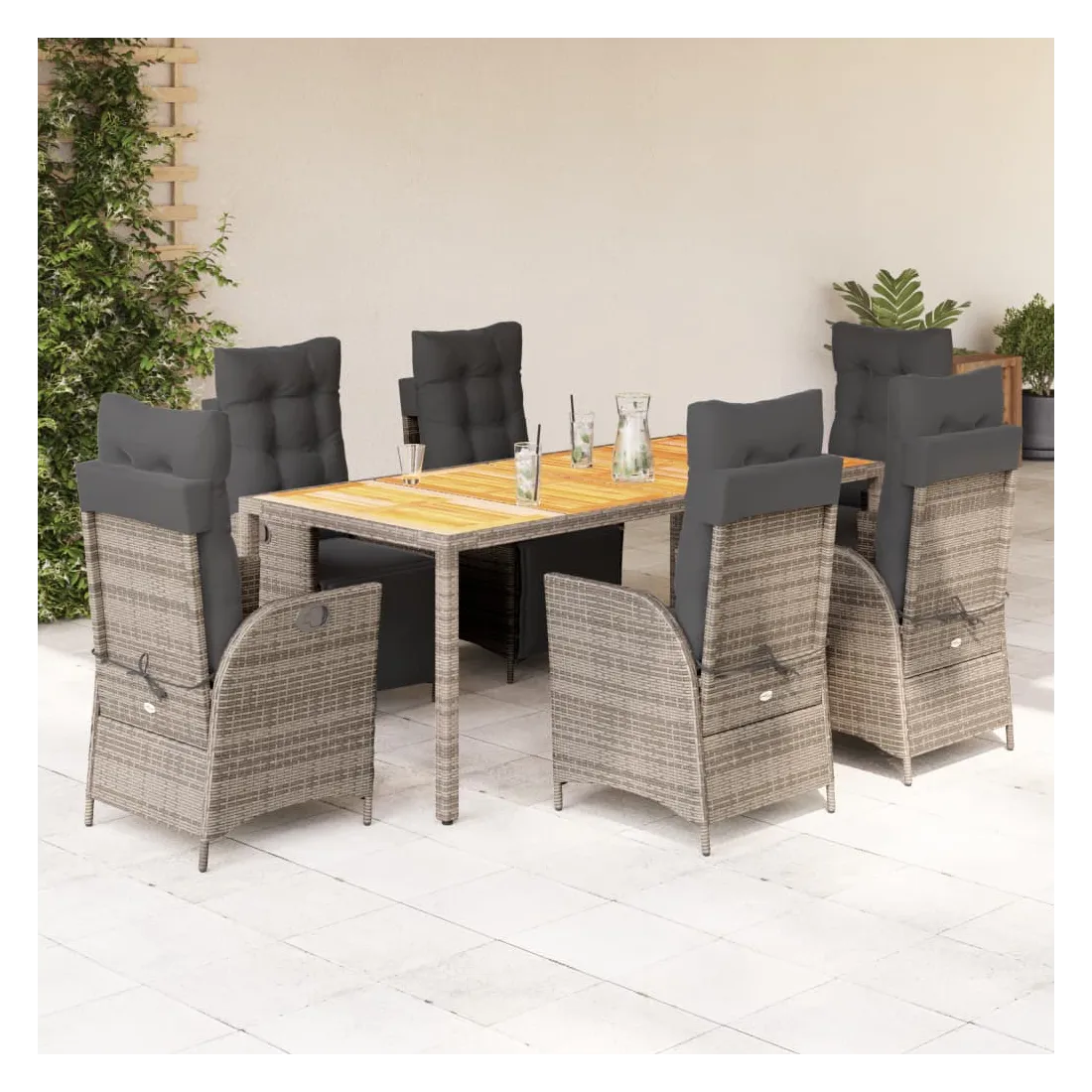 Cet ensemble de salle à manger de jardin est un excellent choix pour les repas en plein air ou pour vous détendre dans le jardin, l'arrière-cour ou le patio. Matériau durable : la résine tressée, également connue sous le nom de poly rotin, est un matériau synthétique solide et nécessitant peu d'entretien qui ressemble au rotin naturel. Il est léger, facile à nettoyer et couramment utilisé pour les meubles d'extérieur en raison de sa durabilité et de ses propriétés de résistance aux intempéries.Dossier et repose-pied réglables : ce siège de jardin est doté d'une poignée. Vous pouvez régler le dossier et le repose-pied dans n'importe quelle position en tirant sur la poignée, et les remettre rapidement dans leur position initiale.Expérience d'assise confortable : ce mobilier d'extérieur, doté de coussins épais, offre une expérience d'assise confortable.Housse amovible et lavable : ces coussins de siège sont dotés de housses amovibles pour un lavage et un entretien faciles. Les coussins de dossier ont un rabat à l'arrière pour une fixation facile aux dossiers.Dessus stable et facile à nettoyer : cette table de jardin a un dessus en bois d'acacia robuste, durable et facile à nettoyer avec un chiffon humide. Bon à savoir :Pour que vos meubles d'extérieur restent beaux, nous vous recommandons de les protéger avec une housse imperméable.