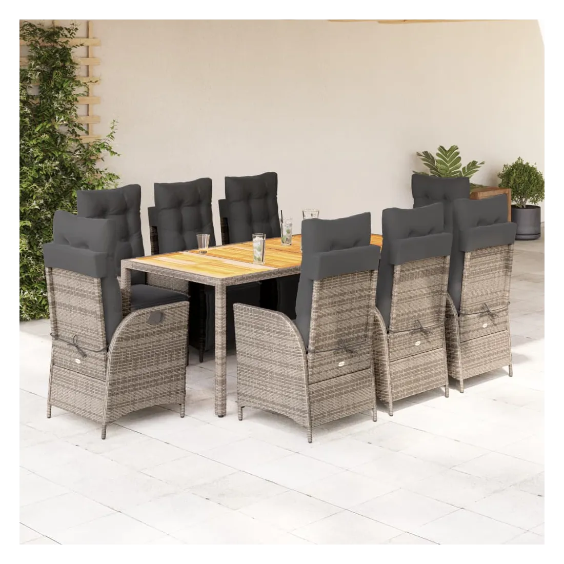 Cet ensemble de salle à manger de jardin est un excellent choix pour les repas en plein air ou pour vous détendre dans le jardin, l'arrière-cour ou le patio. Matériau durable : la résine tressée, également connue sous le nom de poly rotin, est un matériau synthétique solide et nécessitant peu d'entretien qui ressemble au rotin naturel. Il est léger, facile à nettoyer et couramment utilisé pour les meubles d'extérieur en raison de sa durabilité et de ses propriétés de résistance aux intempéries.Dossier et repose-pied réglables : ce siège de jardin est doté d'une poignée. Vous pouvez régler le dossier et le repose-pied dans n'importe quelle position en tirant sur la poignée, et les remettre rapidement dans leur position initiale.Expérience d'assise confortable : ce mobilier d'extérieur, doté de coussins épais, offre une expérience d'assise confortable.Housse amovible et lavable : ces coussins de siège sont dotés de housses amovibles pour un lavage et un entretien faciles. Les coussins de dossier ont un rabat à l'arrière pour une fixation facile aux dossiers.Dessus stable et facile à nettoyer : cette table de jardin a un dessus en bois d'acacia robuste, durable et facile à nettoyer avec un chiffon humide. Bon à savoir :Pour que vos meubles d'extérieur restent beaux, nous vous recommandons de les protéger avec une housse imperméable.