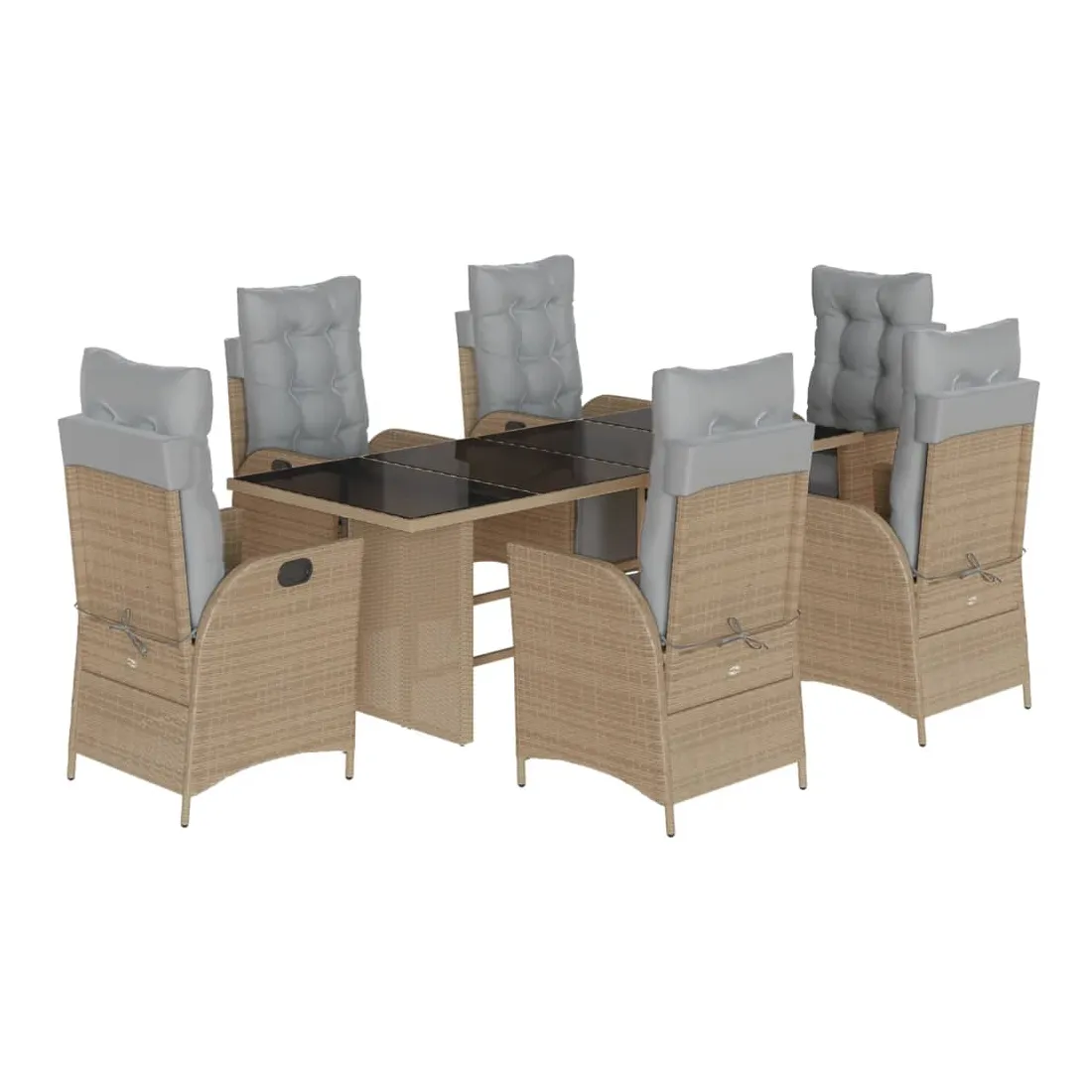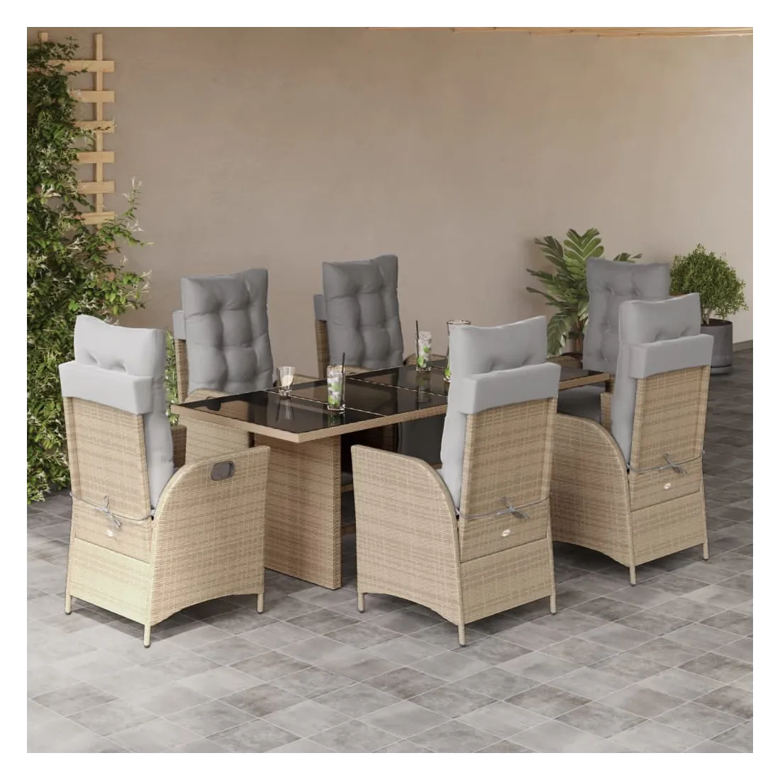 Cet ensemble de salle à manger de jardin est un excellent choix pour les repas en plein air ou pour vous détendre dans le jardin, l'arrière-cour ou le patio. Matériau durable : la résine tressée, également connue sous le nom de poly rotin, est un matériau synthétique solide et nécessitant peu d'entretien qui ressemble au rotin naturel. Il est léger, facile à nettoyer et couramment utilisé pour les meubles d'extérieur en raison de sa durabilité et de ses propriétés de résistance aux intempéries.Dossier et repose-pied réglables : ce siège de jardin est doté d'une poignée. Vous pouvez régler le dossier et le repose-pied dans n'importe quelle position en tirant sur la poignée, et les remettre rapidement dans leur position initiale.Expérience d'assise confortable : ce mobilier d'extérieur, doté de coussins épais, offre une expérience d'assise confortable.Housse amovible et lavable : ces coussins de siège sont dotés de housses amovibles pour un lavage et un entretien faciles. Les coussins de dossier ont un rabat à l'arrière pour une fixation facile aux dossiers.Dessus en verre : le dessus de la table d'extérieur est fabriqué en verre trempé solide et durable, ce qui le rend facile à nettoyer avec un chiffon humide et ajoute une touche d'élégance à votre espace extérieur. Bon à savoir :Pour que vos meubles d'extérieur restent beaux, nous vous recommandons de les protéger avec une housse imperméable.