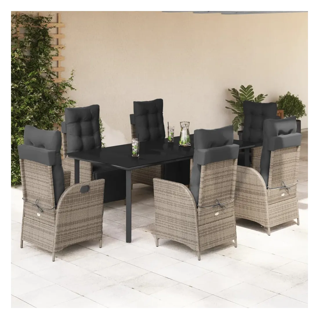 Cet ensemble de salle à manger de jardin est un excellent choix pour les repas en plein air ou pour vous détendre dans le jardin, l'arrière-cour ou le patio. Matériau durable : la résine tressée, également connue sous le nom de poly rotin, est un matériau synthétique solide et nécessitant peu d'entretien qui ressemble au rotin naturel. Il est léger, facile à nettoyer et couramment utilisé pour les meubles d'extérieur en raison de sa durabilité et de ses propriétés de résistance aux intempéries.Dossier et repose-pied réglables : ce siège de jardin est doté d'une poignée. Vous pouvez régler le dossier et le repose-pied dans n'importe quelle position en tirant sur la poignée, et les remettre rapidement dans leur position initiale.Expérience d'assise confortable : ce mobilier d'extérieur, doté de coussins épais, offre une expérience d'assise confortable.Housse amovible et lavable : ces coussins de siège sont dotés de housses amovibles pour un lavage et un entretien faciles. Les coussins de dossier ont un rabat à l'arrière pour une fixation facile aux dossiers.Dessus en verre : le dessus de la table d'extérieur est fabriqué en verre trempé solide et durable, ce qui le rend facile à nettoyer avec un chiffon humide et ajoute une touche d'élégance à votre espace extérieur. Bon à savoir :Pour que vos meubles d'extérieur restent beaux, nous vous recommandons de les protéger avec une housse imperméable.