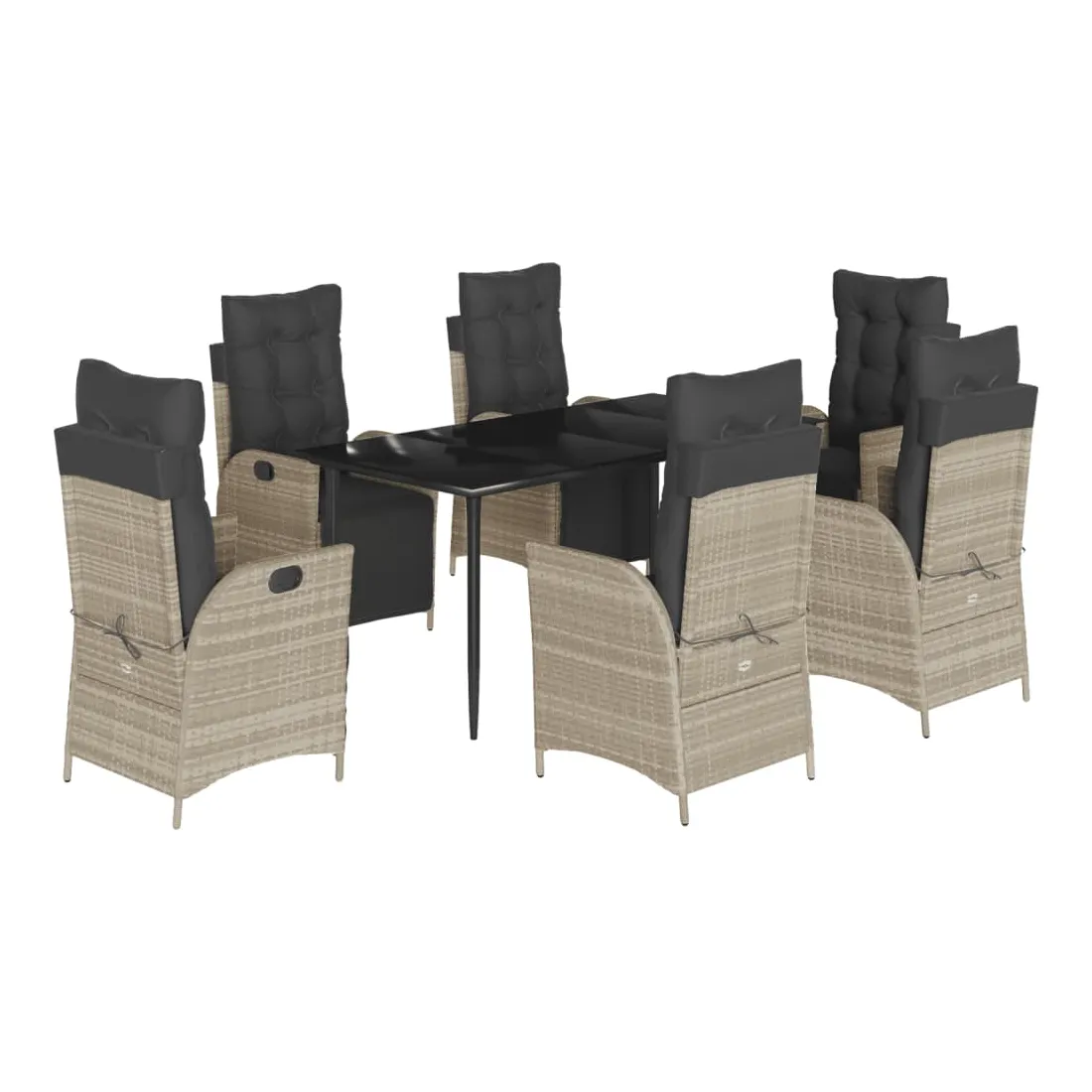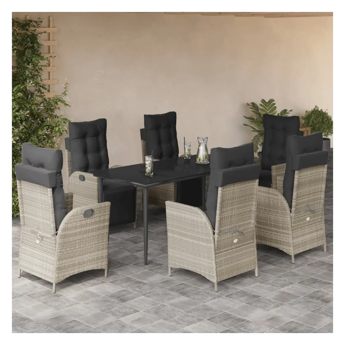 Cet ensemble de salle à manger de jardin est un excellent choix pour les repas en plein air ou pour vous détendre dans le jardin, l'arrière-cour ou le patio. Matériau durable : la résine tressée, également connue sous le nom de poly rotin, est un matériau synthétique solide et nécessitant peu d'entretien qui ressemble au rotin naturel. Il est léger, facile à nettoyer et couramment utilisé pour les meubles d'extérieur en raison de sa durabilité et de ses propriétés de résistance aux intempéries.Dossier et repose-pied réglables : ce siège de jardin est doté d'une poignée. Vous pouvez régler le dossier et le repose-pied dans n'importe quelle position en tirant sur la poignée, et les remettre rapidement dans leur position initiale.Expérience d'assise confortable : ce mobilier d'extérieur, doté de coussins épais, offre une expérience d'assise confortable.Housse amovible et lavable : ces coussins de siège sont dotés de housses amovibles pour un lavage et un entretien faciles. Les coussins de dossier ont un rabat à l'arrière pour une fixation facile aux dossiers.Dessus en verre : le dessus de la table d'extérieur est fabriqué en verre trempé solide et durable, ce qui le rend facile à nettoyer avec un chiffon humide et ajoute une touche d'élégance à votre espace extérieur. Bon à savoir :Pour que vos meubles d'extérieur restent beaux, nous vous recommandons de les protéger avec une housse imperméable.