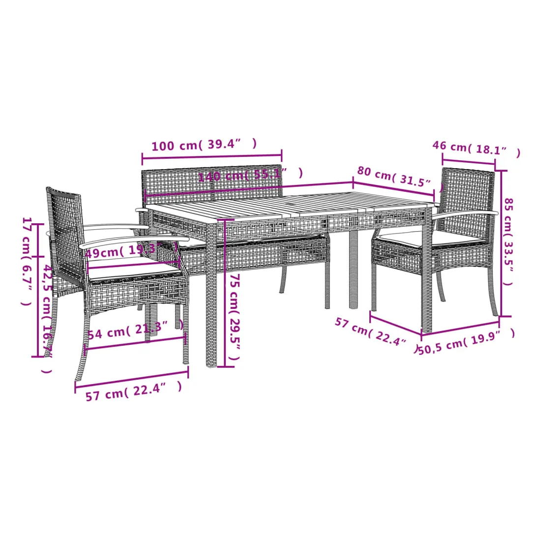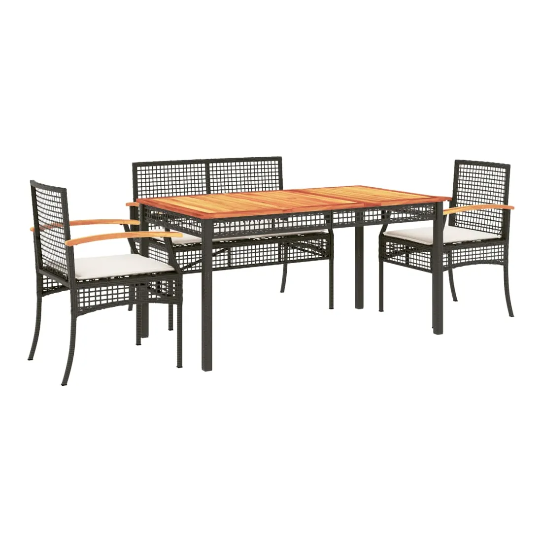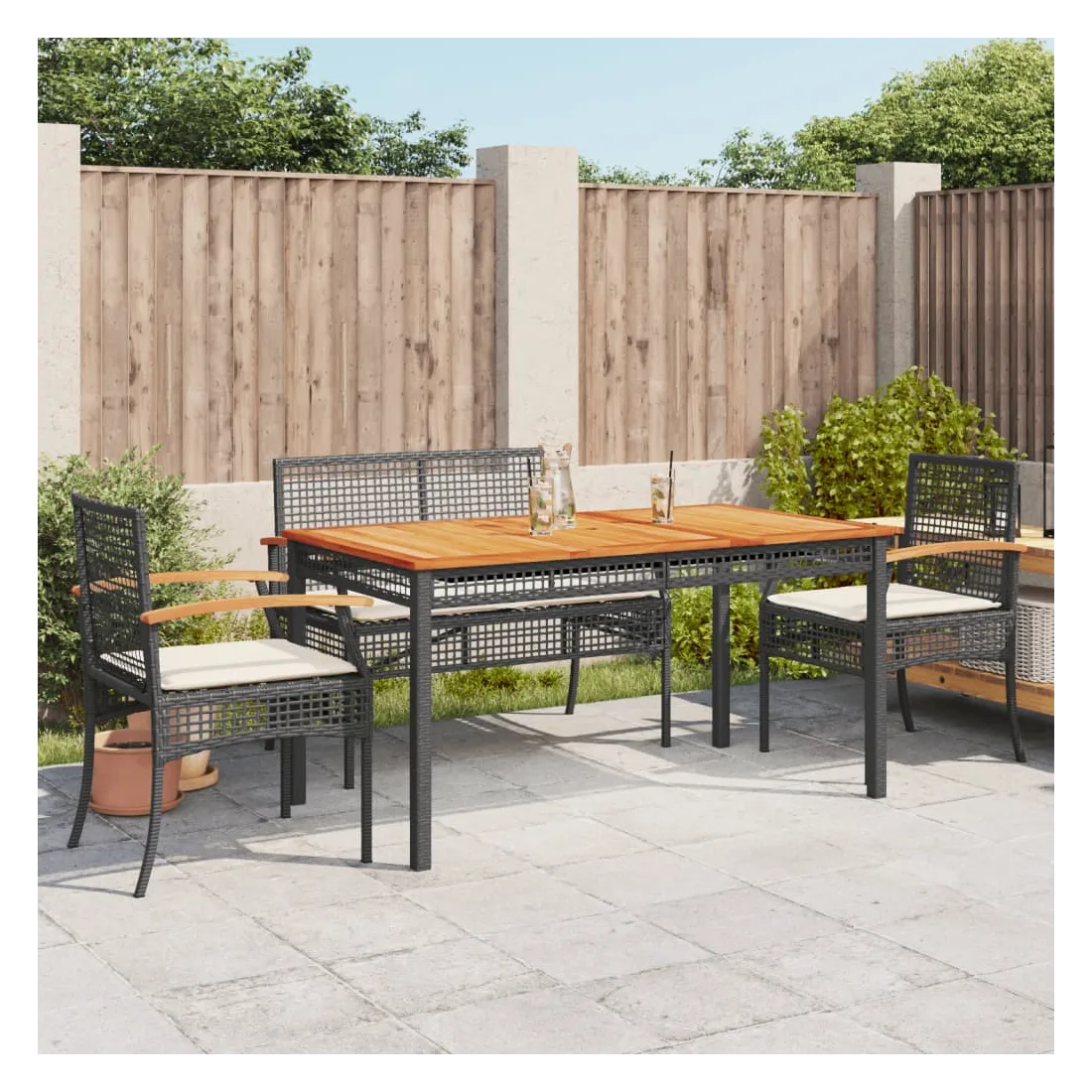 Cet ensemble de salle à manger de jardin est un excellent choix pour les repas en plein air ou pour vous détendre dans le jardin, dans l'arrière-cour ou sur la terrasse. Matériau durable : la résine tressée, également connue sous le nom de poly rotin, est un matériau synthétique solide et nécessitant peu d'entretien qui ressemble au rotin naturel. Il est léger, facile à nettoyer et couramment utilisé pour les meubles d'extérieur en raison de sa durabilité et de ses propriétés de résistance aux intempéries.Expérience d'assise confortable : ce mobilier d'extérieur, doté de coussins épais, offre une expérience d'assise confortable.Housse amovible et lavable : ces coussins de siège sont dotés de housses amovibles pour un lavage et un entretien faciles.Dessus stable et facile à nettoyer : cette table de jardin a un dessus en bois d'acacia robuste, durable et facile à nettoyer avec un chiffon humide.Cadre robuste et stable : le cadre en acier enduit de poudre assure la solidité et la stabilité du meuble de jardin pour une utilisation quotidienne à l'extérieur. Bon à savoir :Pour que vos meubles d'extérieur restent beaux, nous vous recommandons de les protéger avec une housse imperméable.
