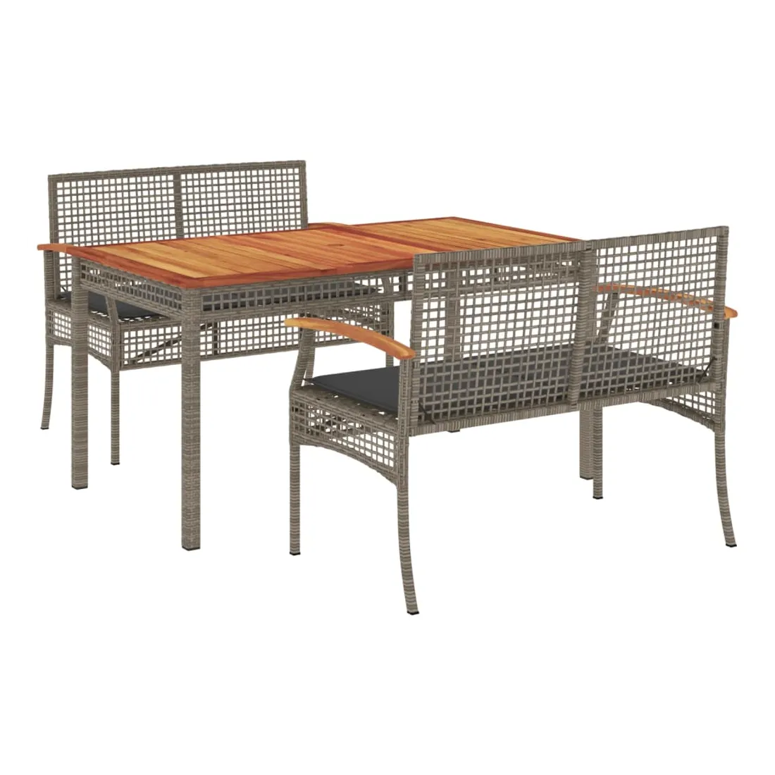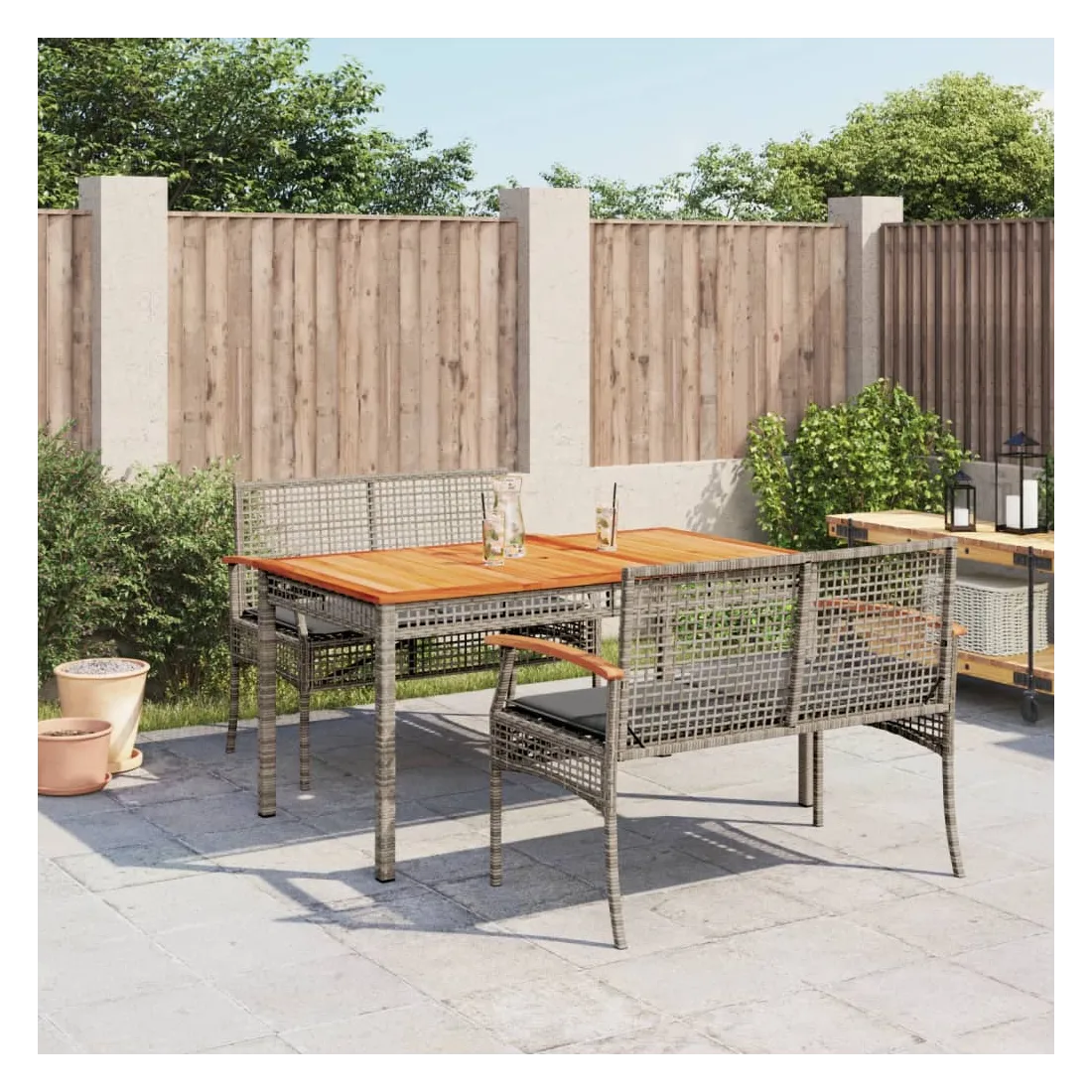 Cet ensemble de salle à manger de jardin est un excellent choix pour les repas en plein air ou pour vous détendre dans le jardin, dans l'arrière-cour ou sur la terrasse. Matériau durable : la résine tressée, également connue sous le nom de poly rotin, est un matériau synthétique solide et nécessitant peu d'entretien qui ressemble au rotin naturel. Il est léger, facile à nettoyer et couramment utilisé pour les meubles d'extérieur en raison de sa durabilité et de ses propriétés de résistance aux intempéries.Expérience d'assise confortable : ce mobilier d'extérieur, doté de coussins épais, offre une expérience d'assise confortable.Housse amovible et lavable : ces coussins de siège sont dotés de housses amovibles pour un lavage et un entretien faciles.Dessus stable et facile à nettoyer : cette table de jardin a un dessus en bois d'acacia robuste, durable et facile à nettoyer avec un chiffon humide.Cadre robuste et stable : le cadre en acier enduit de poudre assure la solidité et la stabilité du meuble de jardin pour une utilisation quotidienne à l'extérieur. Bon à savoir :Pour que vos meubles d'extérieur restent beaux, nous vous recommandons de les protéger avec une housse imperméable.