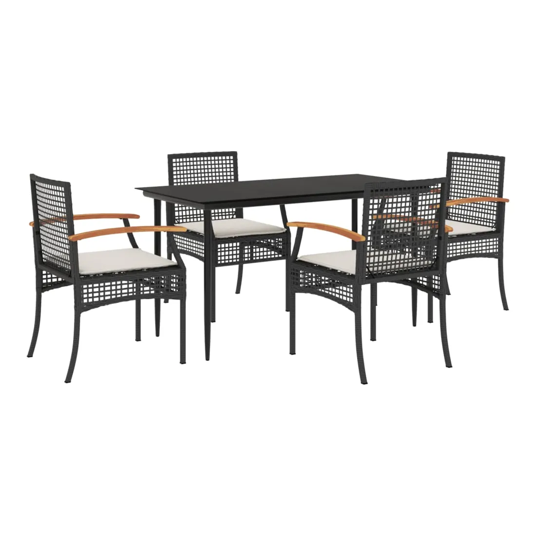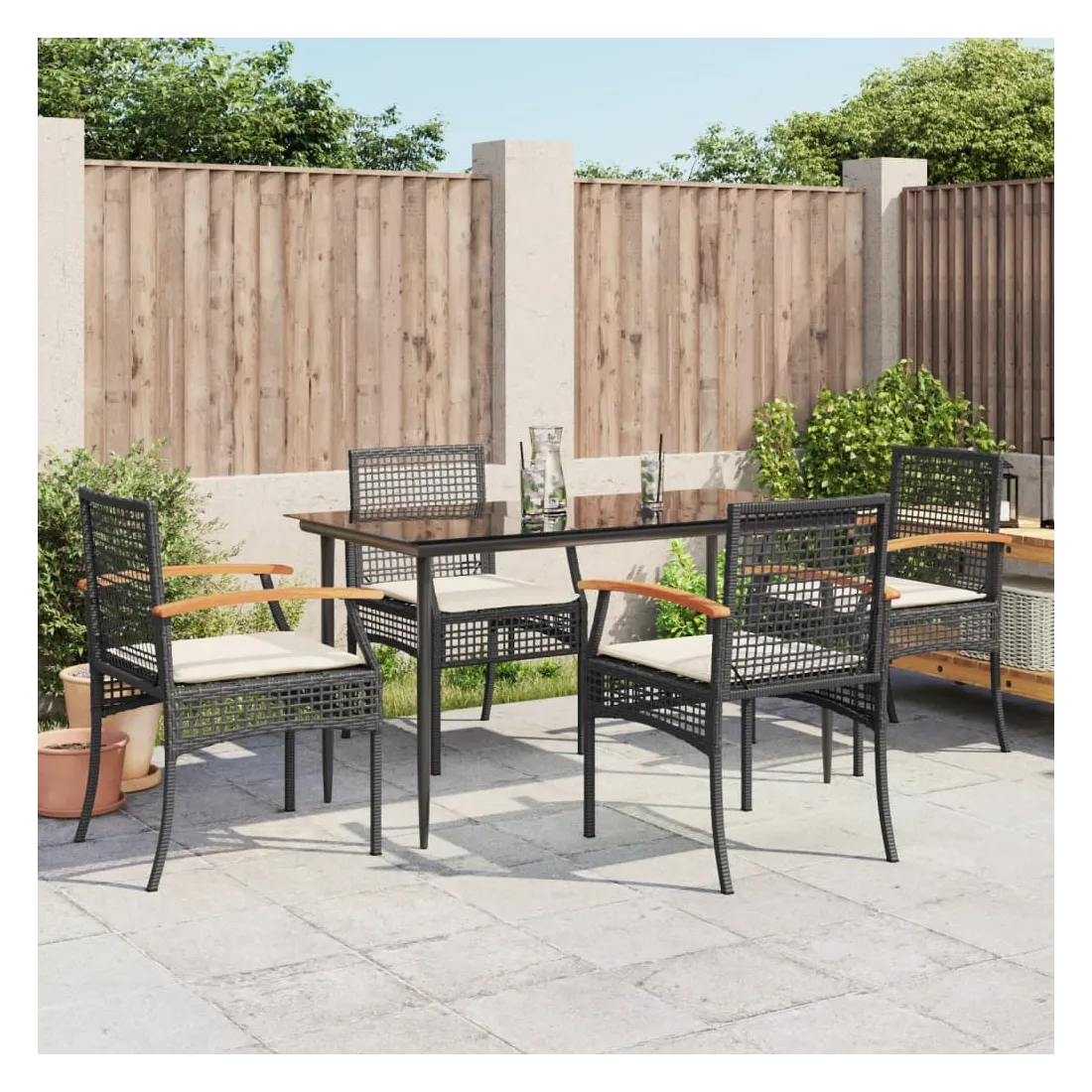 Cet ensemble de salle à manger de jardin est un excellent choix pour les repas en plein air ou pour vous détendre dans le jardin, dans l'arrière-cour ou sur la terrasse. Matériau durable : la résine tressée, également connue sous le nom de poly rotin, est un matériau synthétique solide et nécessitant peu d'entretien qui ressemble au rotin naturel. Il est léger, facile à nettoyer et couramment utilisé pour les meubles d'extérieur en raison de sa durabilité et de ses propriétés de résistance aux intempéries.Expérience d'assise confortable : ce mobilier d'extérieur, doté de coussins épais, offre une expérience d'assise confortable.Housse amovible et lavable : ces coussins de siège sont dotés de housses amovibles pour un lavage et un entretien faciles.Dessus en verre : le dessus de la table d'extérieur est fabriqué en verre trempé solide et durable, ce qui le rend facile à nettoyer avec un chiffon humide et ajoute une touche d'élégance à votre espace extérieur.Cadre robuste et stable : le cadre en acier enduit de poudre assure la solidité et la stabilité du meuble de jardin pour une utilisation quotidienne à l'extérieur. Bon à savoir :Pour que vos meubles d'extérieur restent beaux, nous vous recommandons de les protéger avec une housse imperméable.