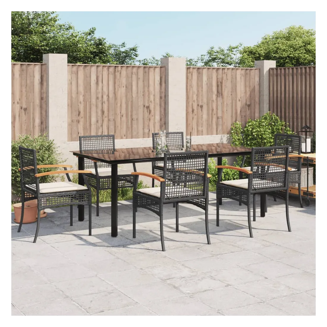 Cet ensemble de salle à manger de jardin est un excellent choix pour les repas en plein air ou pour vous détendre dans le jardin, dans l'arrière-cour ou sur la terrasse. Matériau durable : la résine tressée, également connue sous le nom de poly rotin, est un matériau synthétique solide et nécessitant peu d'entretien qui ressemble au rotin naturel. Il est léger, facile à nettoyer et couramment utilisé pour les meubles d'extérieur en raison de sa durabilité et de ses propriétés de résistance aux intempéries.Expérience d'assise confortable : ce mobilier d'extérieur, doté de coussins épais, offre une expérience d'assise confortable.Housse amovible et lavable : ces coussins de siège sont dotés de housses amovibles pour un lavage et un entretien faciles.Dessus en verre : le dessus de la table d'extérieur est fabriqué en verre trempé solide et durable, ce qui le rend facile à nettoyer avec un chiffon humide et ajoute une touche d'élégance à votre espace extérieur.Cadre robuste et stable : le cadre en acier enduit de poudre assure la solidité et la stabilité du meuble de jardin pour une utilisation quotidienne à l'extérieur. Bon à savoir :Pour que vos meubles d'extérieur restent beaux, nous vous recommandons de les protéger avec une housse imperméable.
