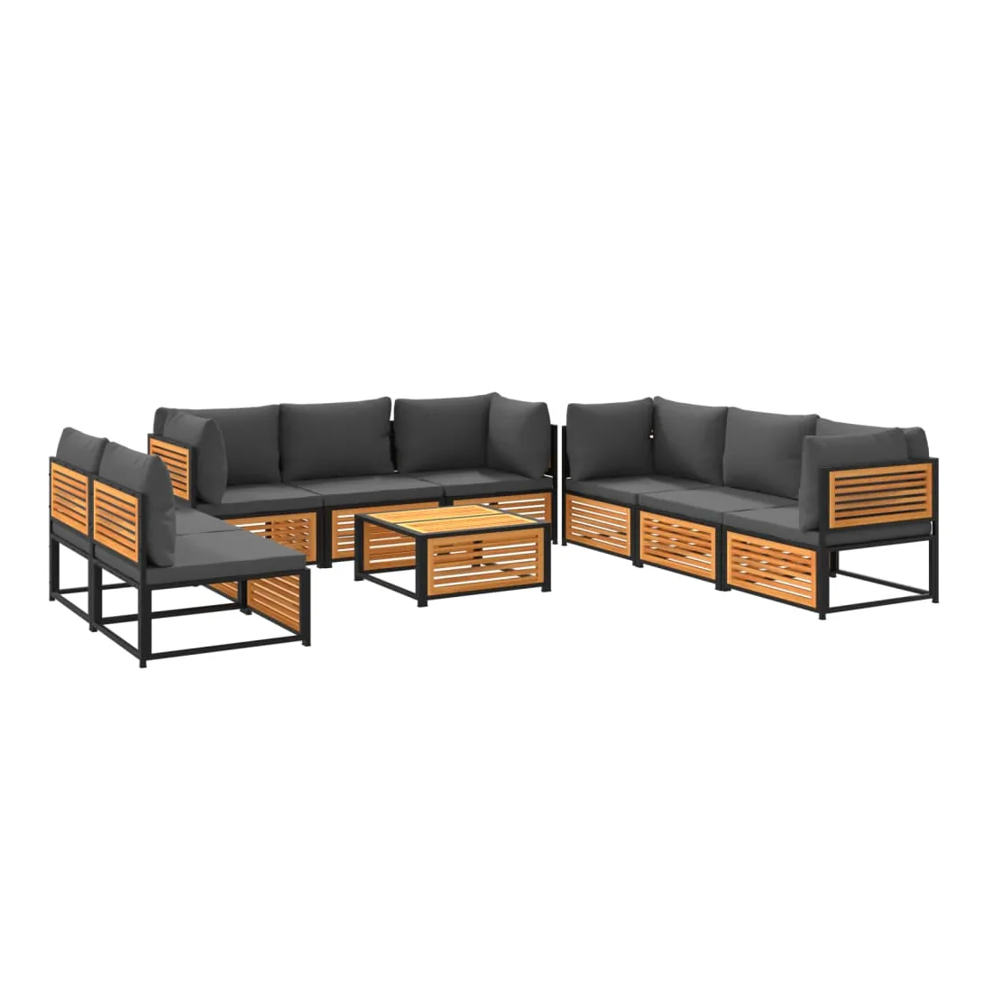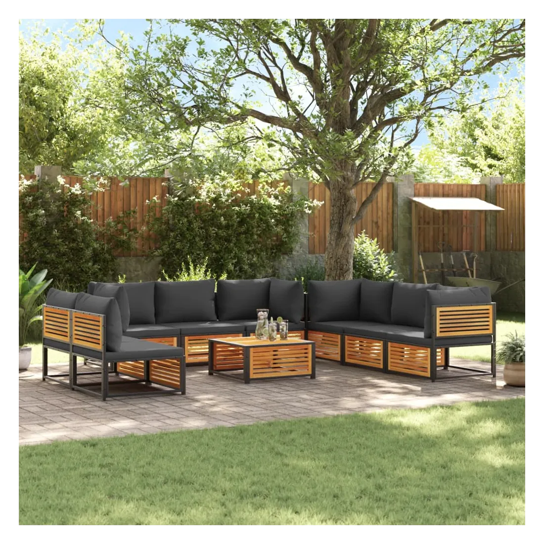 Cet ensemble de canapés de jardin est le complément parfait de votre arrière-cour, terrasse ou patio, offrant un espace confortable et accueillant pour discuter avec la famille et les amis ou simplement se détendre et profiter de l'extérieur. Cadre robuste et stable : le bois d'acacia massif est connu pour sa solidité et sa durabilité. Ses couleurs variées et ses grains uniques lui confèrent un aspect attrayant. Sa stabilité et sa résistance aux intempéries en font un matériau idéal pour la fabrication de meubles d'intérieur et d'extérieur. De plus, le cadre en acier enduit de poudre garantit la solidité et la stabilité du mobilier de jardin pour une utilisation quotidienne en extérieur. Dessus stable et facile à nettoyer : cette table de jardin a un dessus en bois d'acacia robuste, durable et facile à nettoyer avec un chiffon humide. Bonne ventilation et prévention de l'accumulation d'eau : la conception à lattes favorise une circulation optimale de l'air et empêche efficacement l'accumulation d'eau, assurant ainsi un mobilier de jardin sec et confortable.Expérience d'assise confortable : ce mobilier d'extérieur, doté de coussins épais, offre une expérience d'assise confortable. Housse amovible et lavable : ces coussins de siège sont dotés de housses amovibles pour un lavage et un entretien faciles. Bon à savoir :Pour que vos meubles d'extérieur restent beaux, nous vous recommandons de les protéger avec une housse imperméable.