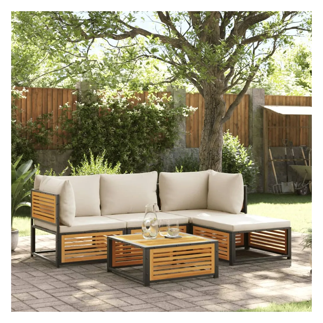 Cet ensemble de canapés de jardin est le complément parfait de votre arrière-cour, terrasse ou patio, offrant un espace confortable et accueillant pour discuter avec la famille et les amis ou simplement se détendre et profiter de l'extérieur. Cadre robuste et stable : le bois d'acacia massif est connu pour sa solidité et sa durabilité. Ses couleurs variées et ses grains uniques lui confèrent un aspect attrayant. Sa stabilité et sa résistance aux intempéries en font un matériau idéal pour la fabrication de meubles d'intérieur et d'extérieur. De plus, le cadre en acier enduit de poudre garantit la solidité et la stabilité du mobilier de jardin pour une utilisation quotidienne en extérieur. Dessus stable et facile à nettoyer : cette table de jardin a un dessus en bois d'acacia robuste, durable et facile à nettoyer avec un chiffon humide. Bonne ventilation et prévention de l'accumulation d'eau : la conception à lattes favorise une circulation optimale de l'air et empêche efficacement l'accumulation d'eau, assurant ainsi un mobilier de jardin sec et confortable.Expérience d'assise confortable : ce mobilier d'extérieur, doté de coussins épais, offre une expérience d'assise confortable. Housse amovible et lavable : ces coussins de siège sont dotés de housses amovibles pour un lavage et un entretien faciles. Bon à savoir :Pour que vos meubles d'extérieur restent beaux, nous vous recommandons de les protéger avec une housse imperméable.