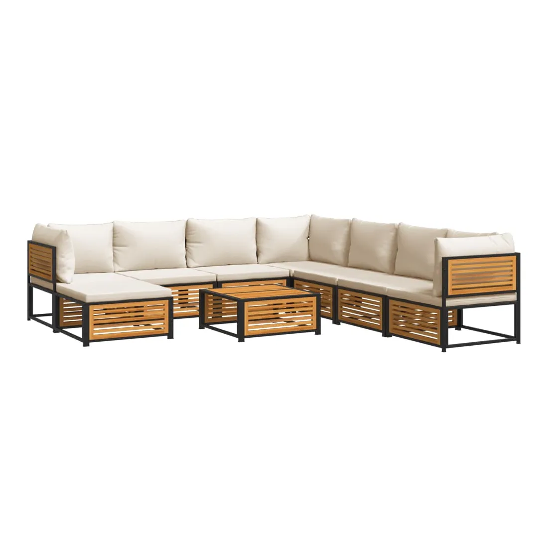 Cet ensemble de canapés de jardin est le complément parfait de votre arrière-cour, terrasse ou patio, offrant un espace confortable et accueillant pour discuter avec la famille et les amis ou simplement se détendre et profiter de l'extérieur. Cadre robuste et stable : le bois d'acacia massif est connu pour sa solidité et sa durabilité. Ses couleurs variées et ses grains uniques lui confèrent un aspect attrayant. Sa stabilité et sa résistance aux intempéries en font un matériau idéal pour la fabrication de meubles d'intérieur et d'extérieur. De plus, le cadre en acier enduit de poudre garantit la solidité et la stabilité du mobilier de jardin pour une utilisation quotidienne en extérieur. Dessus stable et facile à nettoyer : cette table de jardin a un dessus en bois d'acacia robuste, durable et facile à nettoyer avec un chiffon humide. Bonne ventilation et prévention de l'accumulation d'eau : la conception à lattes favorise une circulation optimale de l'air et empêche efficacement l'accumulation d'eau, assurant ainsi un mobilier de jardin sec et confortable.Expérience d'assise confortable : ce mobilier d'extérieur, doté de coussins épais, offre une expérience d'assise confortable. Housse amovible et lavable : ces coussins de siège sont dotés de housses amovibles pour un lavage et un entretien faciles. Bon à savoir :Pour que vos meubles d'extérieur restent beaux, nous vous recommandons de les protéger avec une housse imperméable.