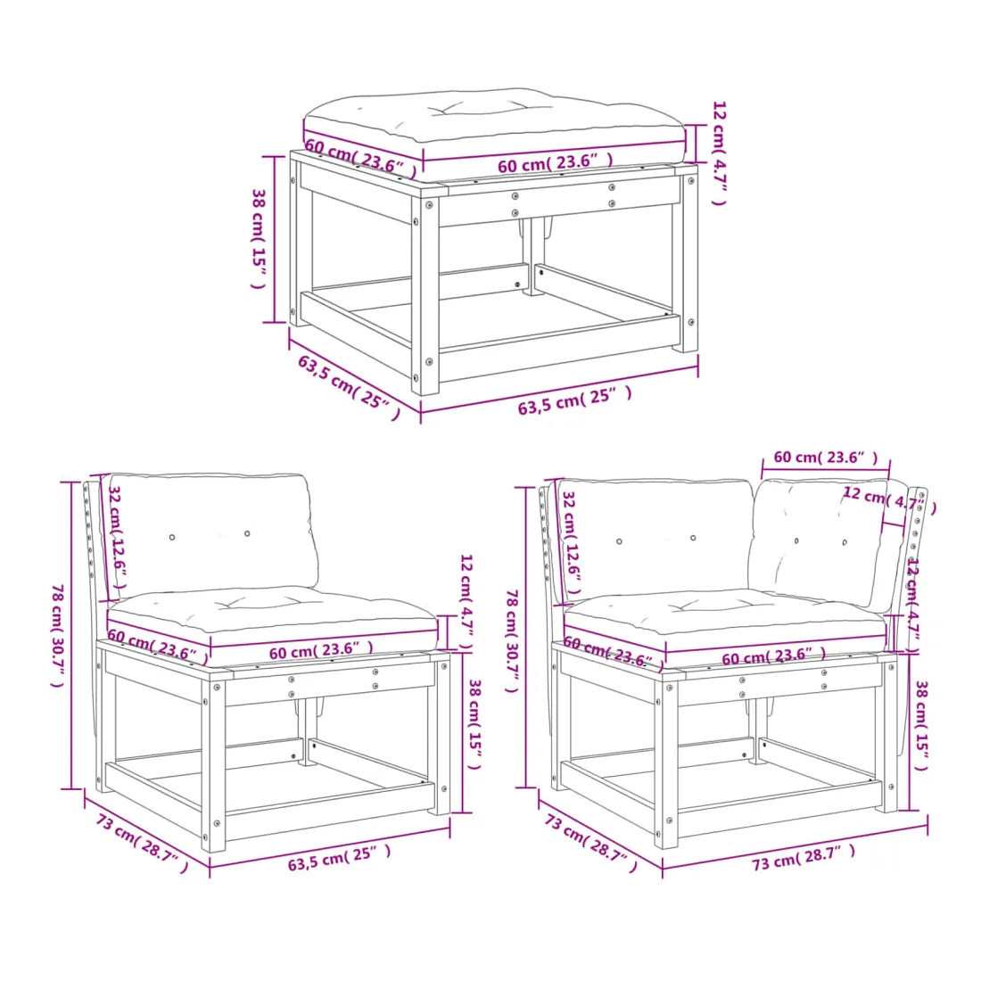 - Dimensions du coussin de siège : 60 x 60 x 12 cm (l x P x é)