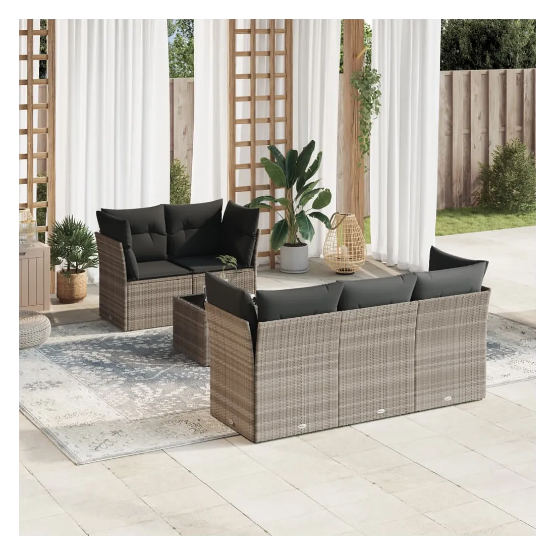 Cet ensemble de canapés de jardin est le complément parfait de votre arrière-cour, terrasse ou patio, offrant un espace confortable et accueillant pour discuter avec la famille et les amis ou simplement se détendre et profiter de l'extérieur. Matériau durable : la résine tressée, également connue sous le nom de poly rotin, est un matériau synthétique solide et nécessitant peu d'entretien qui ressemble au rotin naturel. Il est léger, facile à nettoyer et couramment utilisé pour les meubles d'extérieur en raison de sa durabilité et de ses propriétés de résistance aux intempéries.Expérience d'assise confortable : cet ensemble de meubles d'extérieur, doté de coussins épais, offre une expérience d'assise confortable.Housse amovible et lavable : ces coussins de siège sont dotés de housses amovibles pour un lavage et un entretien faciles.Dessus en verre : le dessus de la table d'extérieur est fabriqué en verre trempé solide et durable, ce qui le rend facile à nettoyer avec un chiffon humide et ajoute une touche d'élégance à votre espace extérieur.Conception modulaire : cet ensemble de meubles d'extérieur a une conception modulaire, ce qui le rend complètement flexible et facile à déplacer, afin que vous puissiez créer un agencement de meubles d'extérieur personnalisé. Bon à savoir :Pour que vos meubles d'extérieur restent beaux, nous vous recommandons de les protéger avec une housse imperméable.