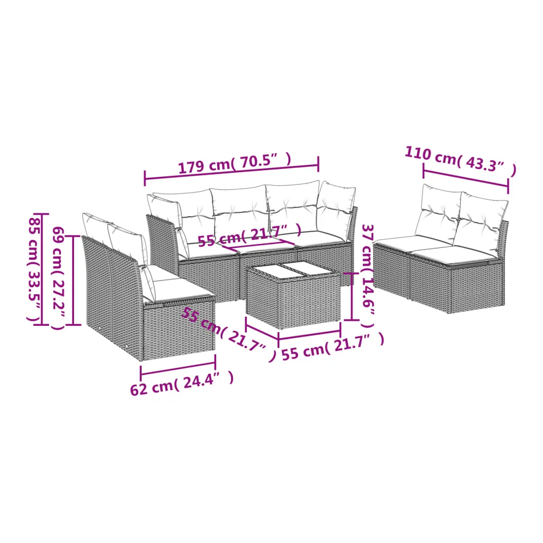 - 7 x coussin de siège avec housse amovible et lavable
