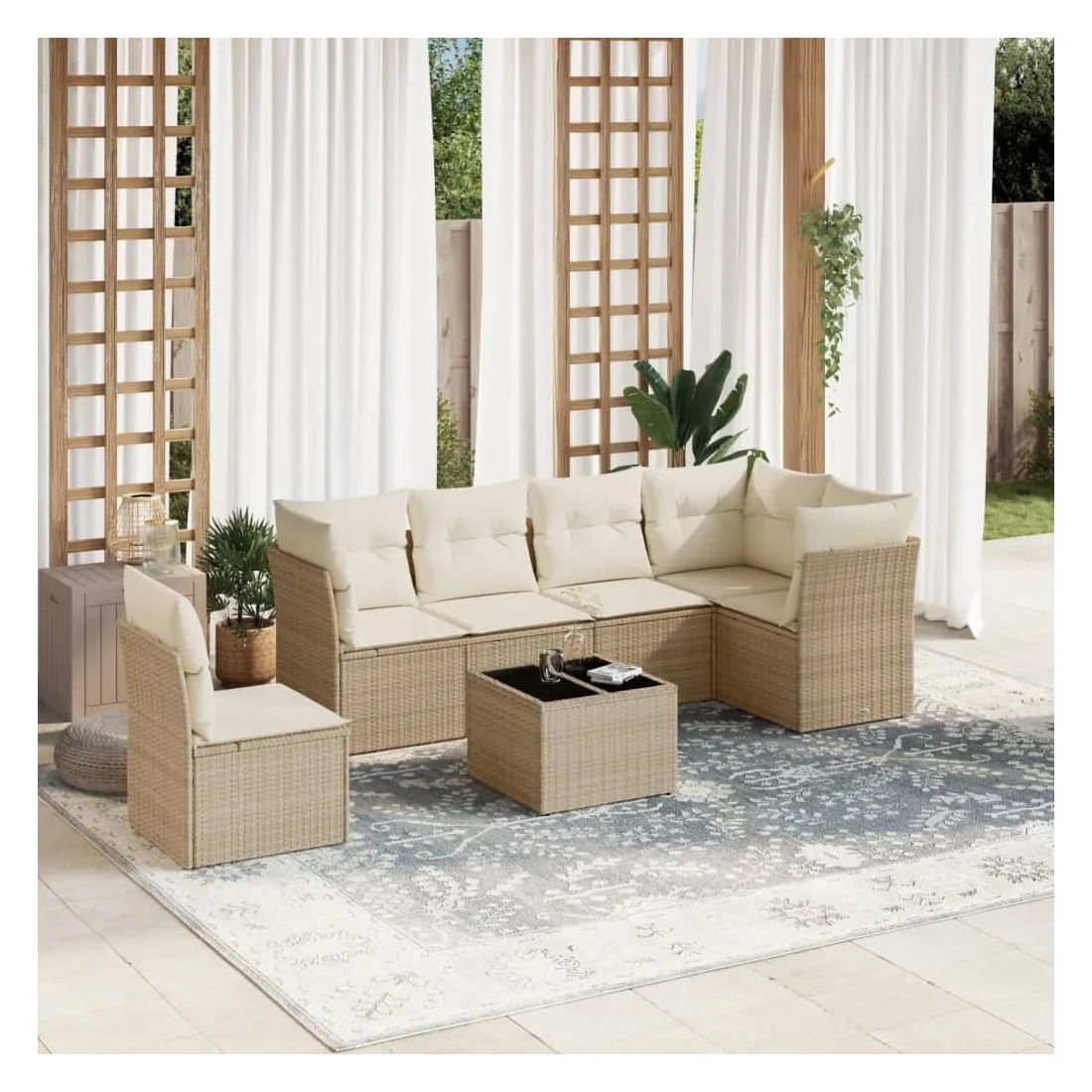Cet ensemble de canapés de jardin est le complément parfait de votre arrière-cour, terrasse ou patio, offrant un espace confortable et accueillant pour discuter avec la famille et les amis ou simplement se détendre et profiter de l'extérieur. Matériau durable : la résine tressée, également connue sous le nom de poly rotin, est un matériau synthétique solide et nécessitant peu d'entretien qui ressemble au rotin naturel. Il est léger, facile à nettoyer et couramment utilisé pour les meubles d'extérieur en raison de sa durabilité et de ses propriétés de résistance aux intempéries.Expérience d'assise confortable : ce mobilier d'extérieur, doté de coussins épais, offre une expérience d'assise confortable.Dessus en verre : le dessus de la table d'extérieur est fabriqué en verre trempé solide et durable, ce qui le rend facile à nettoyer avec un chiffon humide et ajoute une touche d'élégance à votre espace extérieur.Housse amovible et lavable : ces coussins de siège sont dotés de housses amovibles pour un lavage et un entretien faciles.Conception modulaire : cet ensemble de meubles d'extérieur a une conception modulaire, ce qui le rend complètement flexible et facile à déplacer, afin que vous puissiez créer un agencement de meubles d'extérieur personnalisé. Bon à savoir :Pour que vos meubles d'extérieur restent beaux, nous vous recommandons de les protéger avec une housse imperméable.