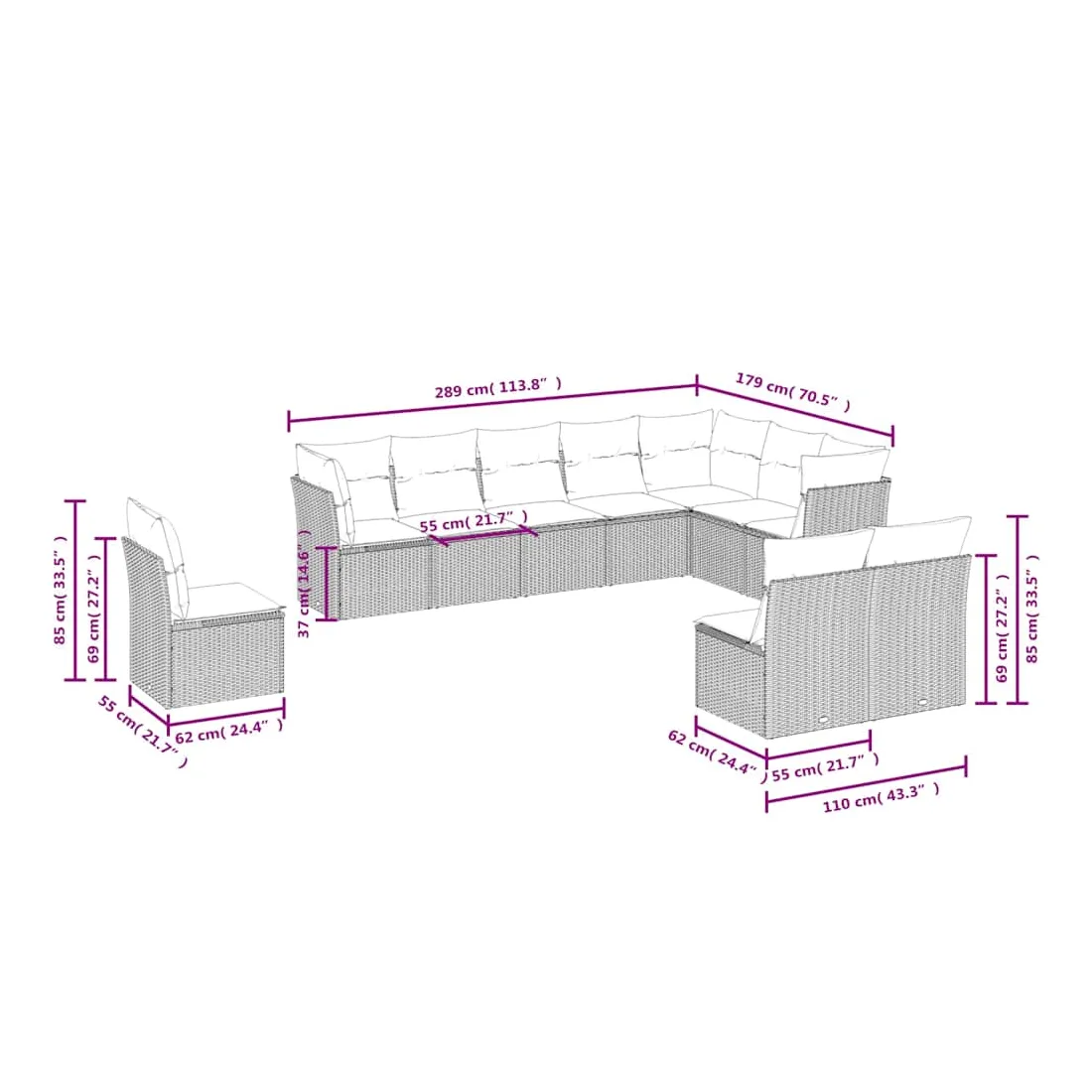 Cet ensemble de canapés de jardin est le complément parfait de votre arrière-cour, terrasse ou patio, offrant un espace confortable et accueillant pour discuter avec la famille et les amis ou simplement se détendre et profiter de l'extérieur. Matériau durable : la résine tressée, également connue sous le nom de poly rotin, est un matériau synthétique solide et nécessitant peu d'entretien qui ressemble au rotin naturel. Il est léger, facile à nettoyer et couramment utilisé pour les meubles d'extérieur en raison de sa durabilité et de ses propriétés de résistance aux intempéries.Expérience d'assise confortable : ce mobilier d'extérieur, doté de coussins épais, offre une expérience d'assise confortable.Housse amovible et lavable : ces coussins de siège sont dotés de housses amovibles pour un lavage et un entretien faciles.Conception modulaire : cet ensemble de meubles d'extérieur a une conception modulaire, ce qui le rend complètement flexible et facile à déplacer, afin que vous puissiez créer un agencement de meubles d'extérieur personnalisé. Bon à savoir :Pour que vos meubles d'extérieur restent beaux, nous vous recommandons de les protéger avec une housse imperméable.