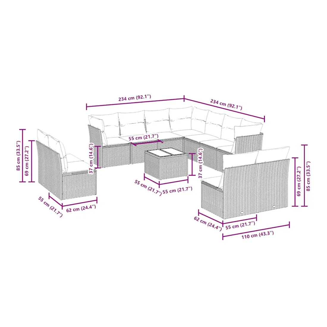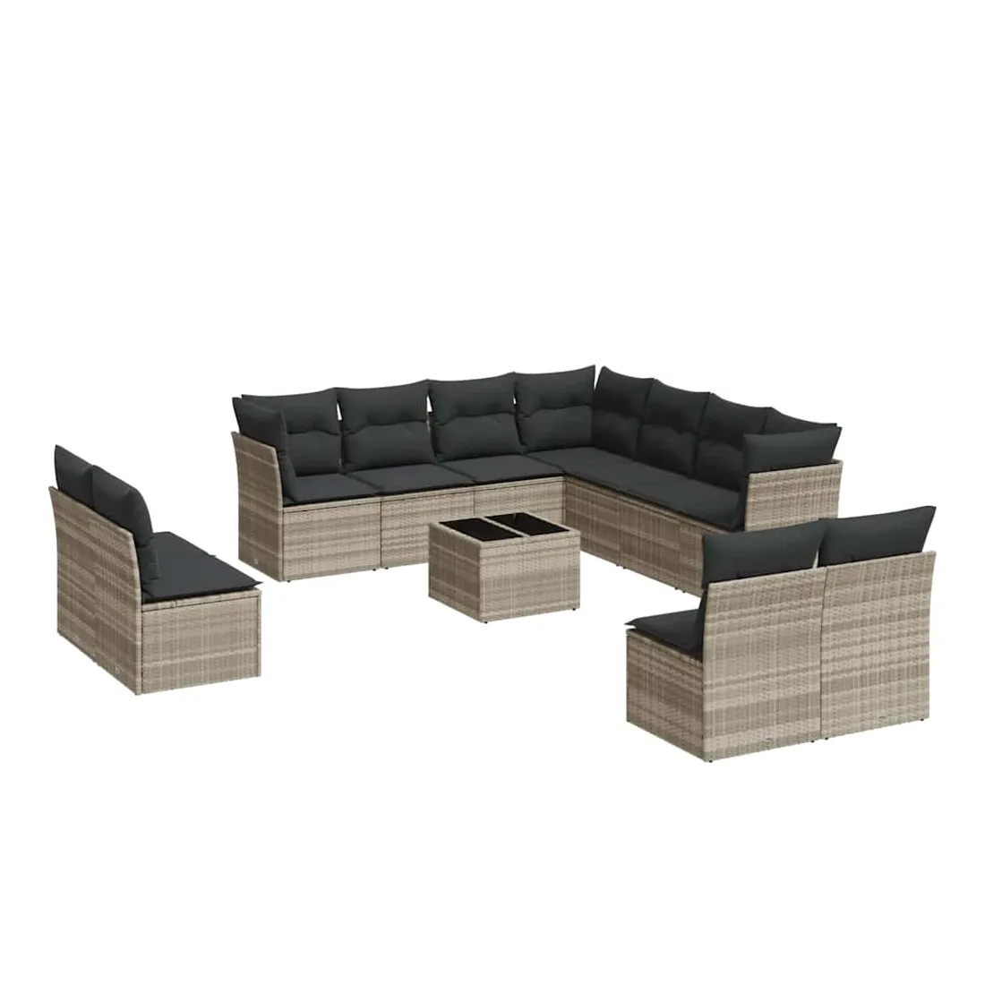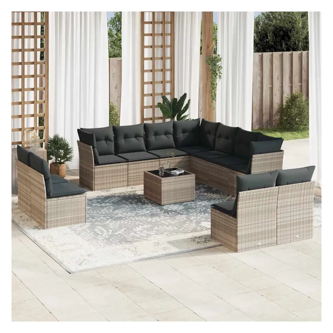 Cet ensemble de canapés de jardin est le complément parfait de votre arrière-cour, terrasse ou patio, offrant un espace confortable et accueillant pour discuter avec la famille et les amis ou simplement se détendre et profiter de l'extérieur. Matériau durable : la résine tressée, également connue sous le nom de poly rotin, est un matériau synthétique solide et nécessitant peu d'entretien qui ressemble au rotin naturel. Il est léger, facile à nettoyer et couramment utilisé pour les meubles d'extérieur en raison de sa durabilité et de ses propriétés de résistance aux intempéries.Expérience d'assise confortable : ce mobilier d'extérieur, doté de coussins épais, offre une expérience d'assise confortable.Dessus en verre : le dessus de la table d'extérieur est fabriqué en verre trempé solide et durable, ce qui le rend facile à nettoyer avec un chiffon humide et ajoute une touche d'élégance à votre espace extérieur.Housse amovible et lavable : ces coussins de siège sont dotés de housses amovibles pour un lavage et un entretien faciles.Conception modulaire : cet ensemble de meubles d'extérieur a une conception modulaire, ce qui le rend complètement flexible et facile à déplacer, afin que vous puissiez créer un agencement de meubles d'extérieur personnalisé. Bon à savoir :Pour que vos meubles d'extérieur restent beaux, nous vous recommandons de les protéger avec une housse imperméable.
