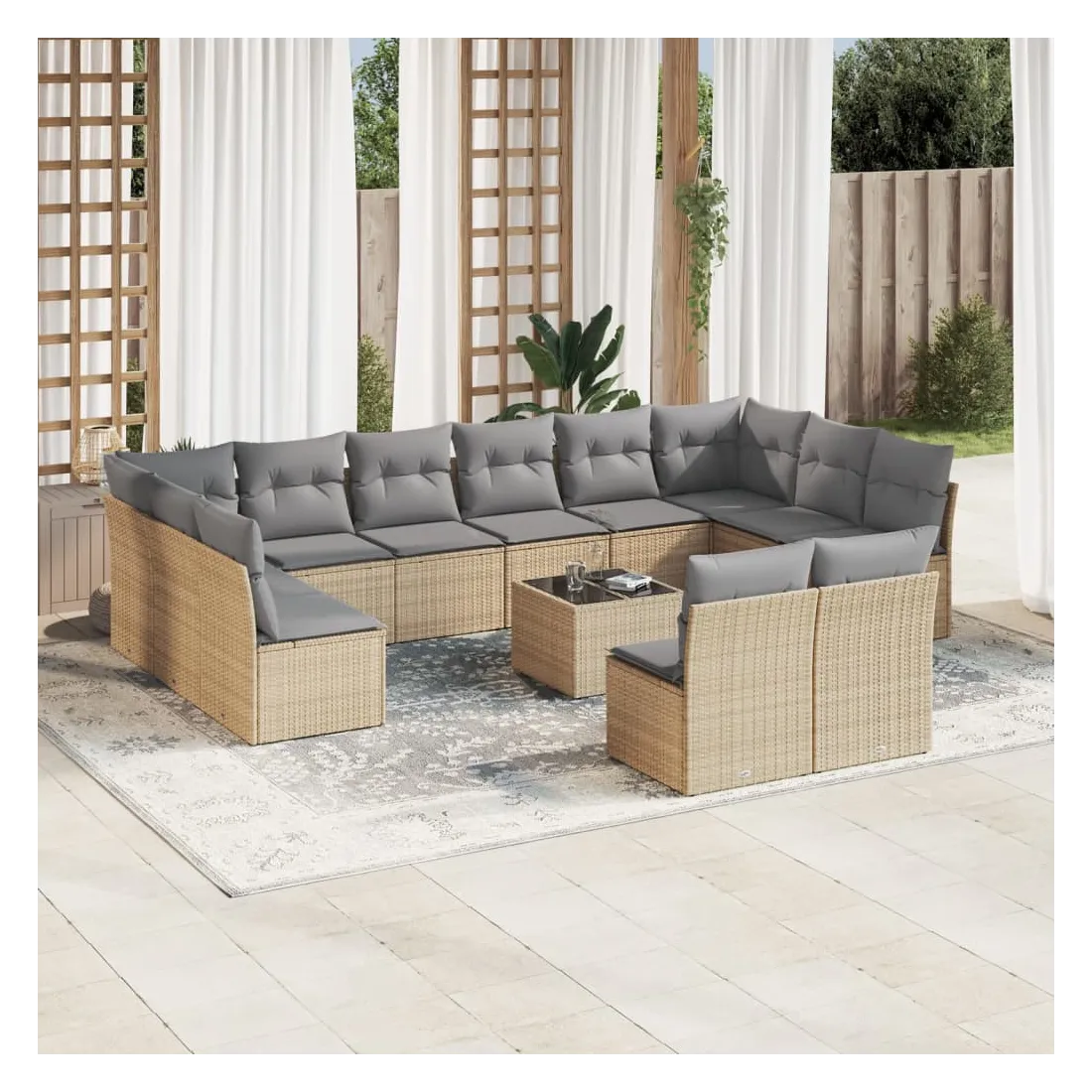Cet ensemble de canapés de jardin est le complément parfait de votre arrière-cour, terrasse ou patio, offrant un espace confortable et accueillant pour discuter avec la famille et les amis ou simplement se détendre et profiter de l'extérieur. Matériau durable : la résine tressée, également connue sous le nom de poly rotin, est un matériau synthétique solide et nécessitant peu d'entretien qui ressemble au rotin naturel. Il est léger, facile à nettoyer et couramment utilisé pour les meubles d'extérieur en raison de sa durabilité et de ses propriétés de résistance aux intempéries.Expérience d'assise confortable : ce mobilier d'extérieur, doté de coussins épais, offre une expérience d'assise confortable.Dessus en verre : le dessus de la table d'extérieur est fabriqué en verre trempé solide et durable, ce qui le rend facile à nettoyer avec un chiffon humide et ajoute une touche d'élégance à votre espace extérieur.Housse amovible et lavable : ces coussins de siège sont dotés de housses amovibles pour un lavage et un entretien faciles.Conception modulaire : cet ensemble de meubles d'extérieur a une conception modulaire, ce qui le rend complètement flexible et facile à déplacer, afin que vous puissiez créer un agencement de meubles d'extérieur personnalisé. Bon à savoir :Pour que vos meubles d'extérieur restent beaux, nous vous recommandons de les protéger avec une housse imperméable.