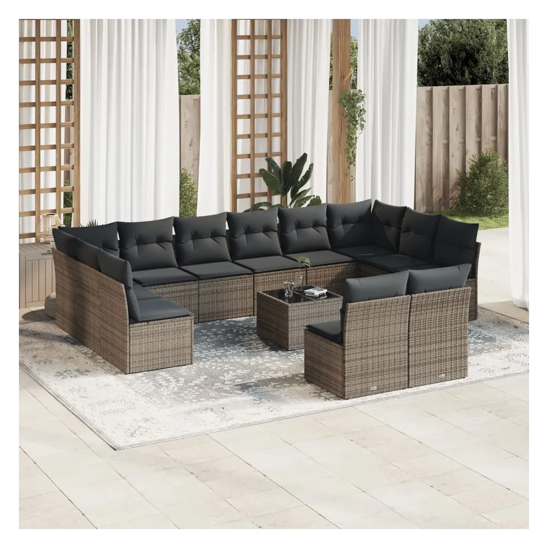 Cet ensemble de canapés de jardin est le complément parfait de votre arrière-cour, terrasse ou patio, offrant un espace confortable et accueillant pour discuter avec la famille et les amis ou simplement se détendre et profiter de l'extérieur. Matériau durable : la résine tressée, également connue sous le nom de poly rotin, est un matériau synthétique solide et nécessitant peu d'entretien qui ressemble au rotin naturel. Il est léger, facile à nettoyer et couramment utilisé pour les meubles d'extérieur en raison de sa durabilité et de ses propriétés de résistance aux intempéries.Expérience d'assise confortable : ce mobilier d'extérieur, doté de coussins épais, offre une expérience d'assise confortable.Dessus en verre : le dessus de la table d'extérieur est fabriqué en verre trempé solide et durable, ce qui le rend facile à nettoyer avec un chiffon humide et ajoute une touche d'élégance à votre espace extérieur.Housse amovible et lavable : ces coussins de siège sont dotés de housses amovibles pour un lavage et un entretien faciles.Conception modulaire : cet ensemble de meubles d'extérieur a une conception modulaire, ce qui le rend complètement flexible et facile à déplacer, afin que vous puissiez créer un agencement de meubles d'extérieur personnalisé. Bon à savoir :Pour que vos meubles d'extérieur restent beaux, nous vous recommandons de les protéger avec une housse imperméable.